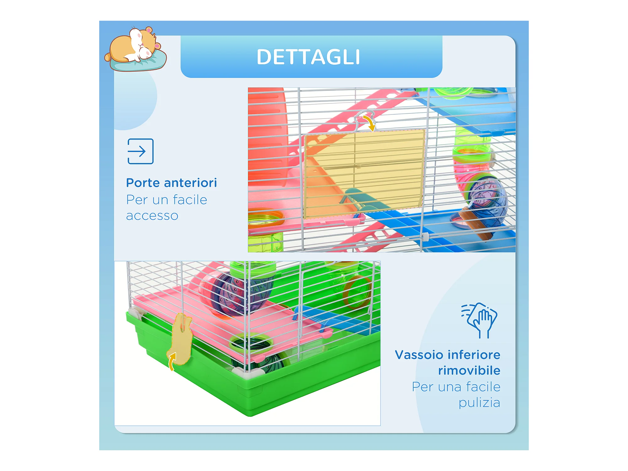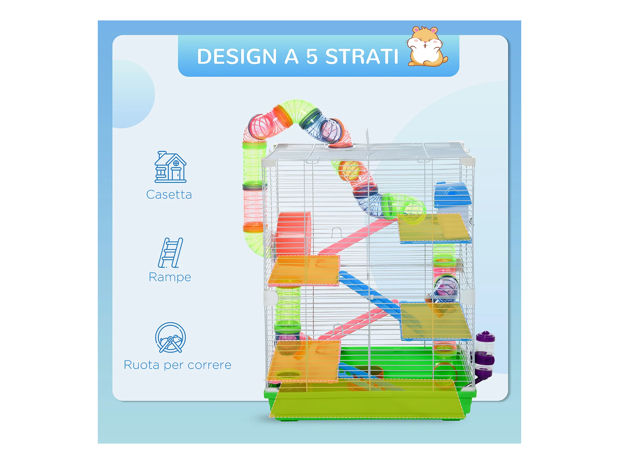 Gabbia per criceti e piccoli roditori 5 livelli, accessori gioco e cibo