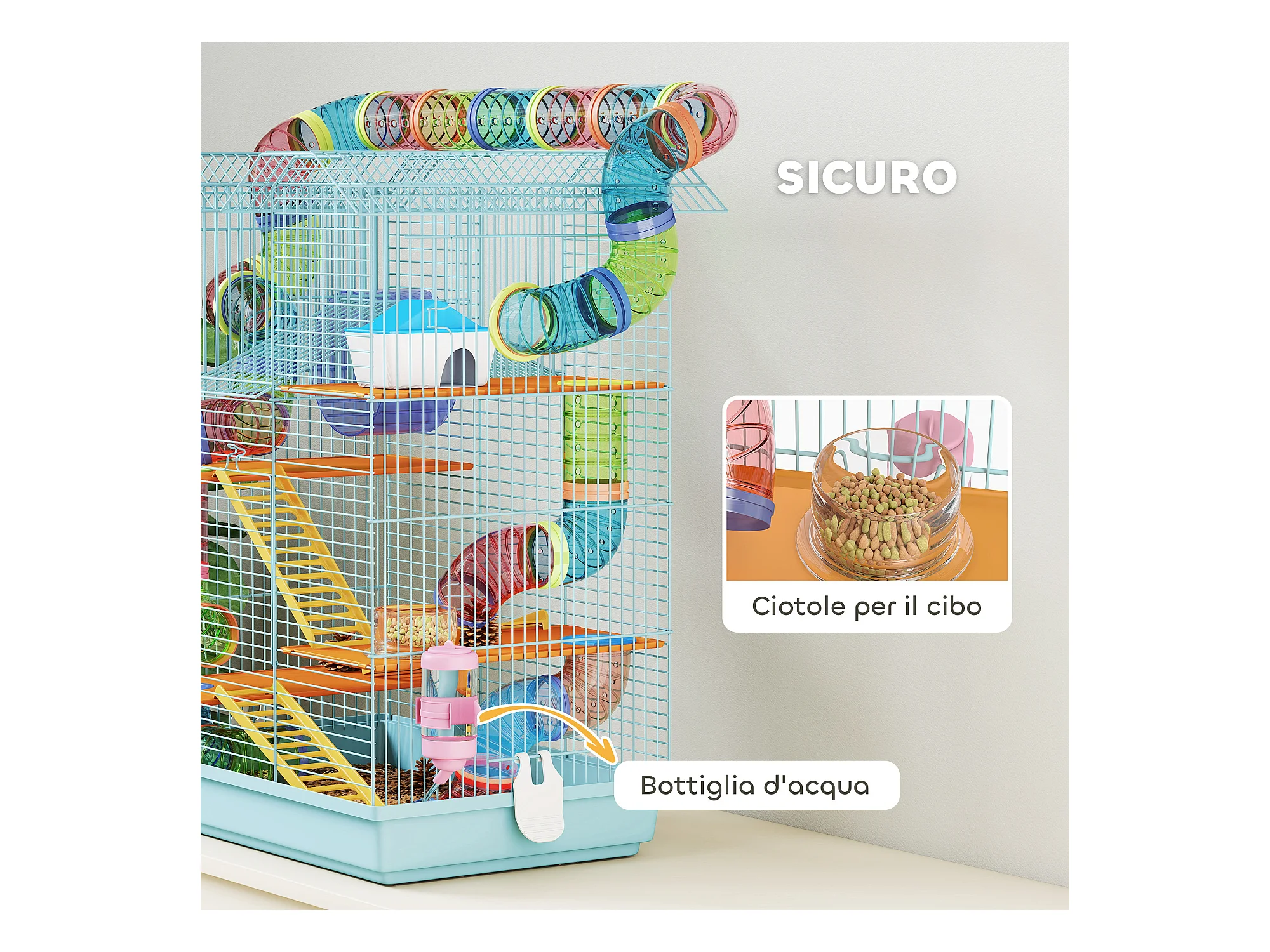 Gabbia per criceti 6 livelli con tunnel, ruota, rampe bottiglia e ciotola