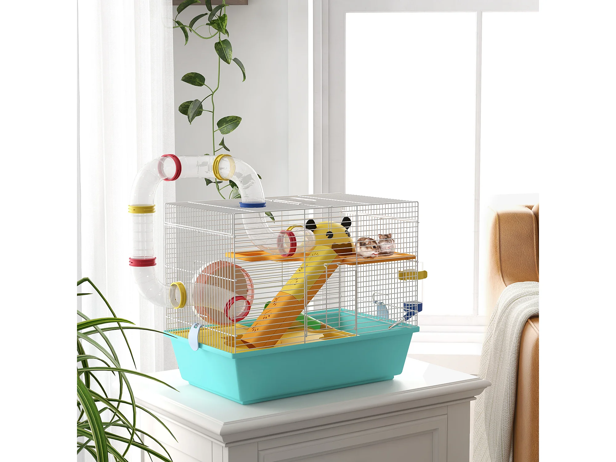 Gabbia per criceti in acciaio con accessori bianco e azzurro
