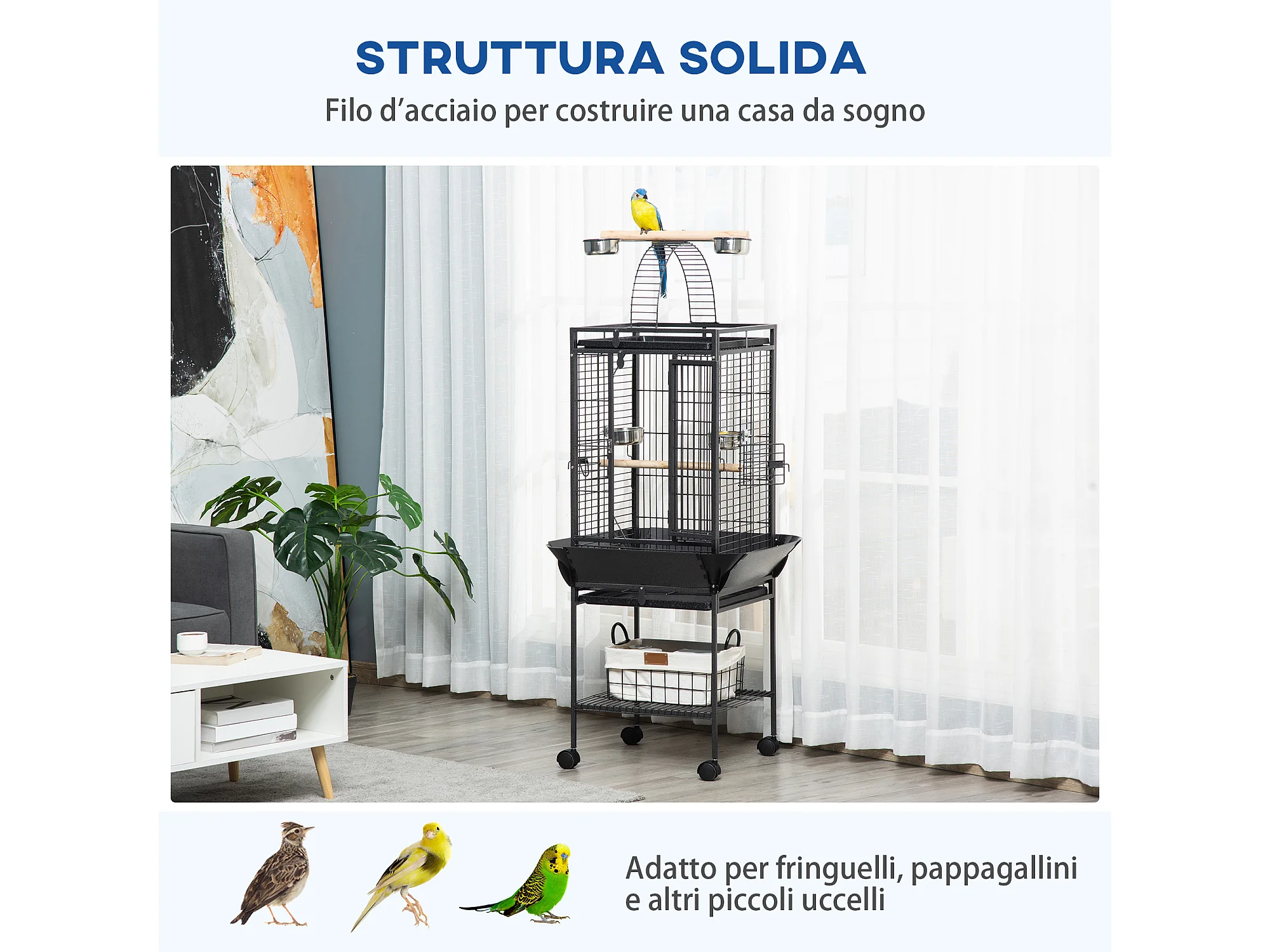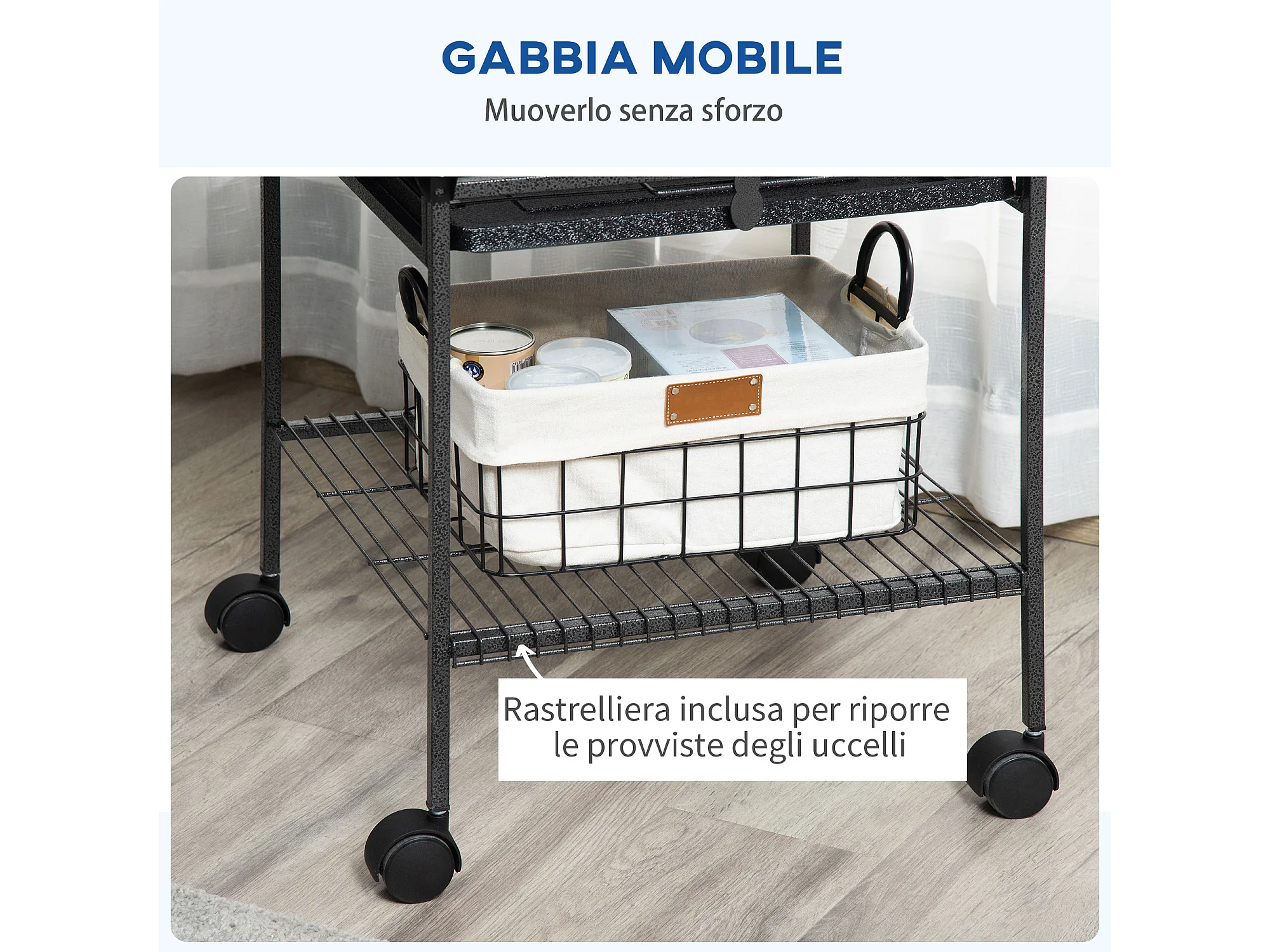 Gabbia per uccelli da interni in acciaio e legno a 4 ruote con vassoio
