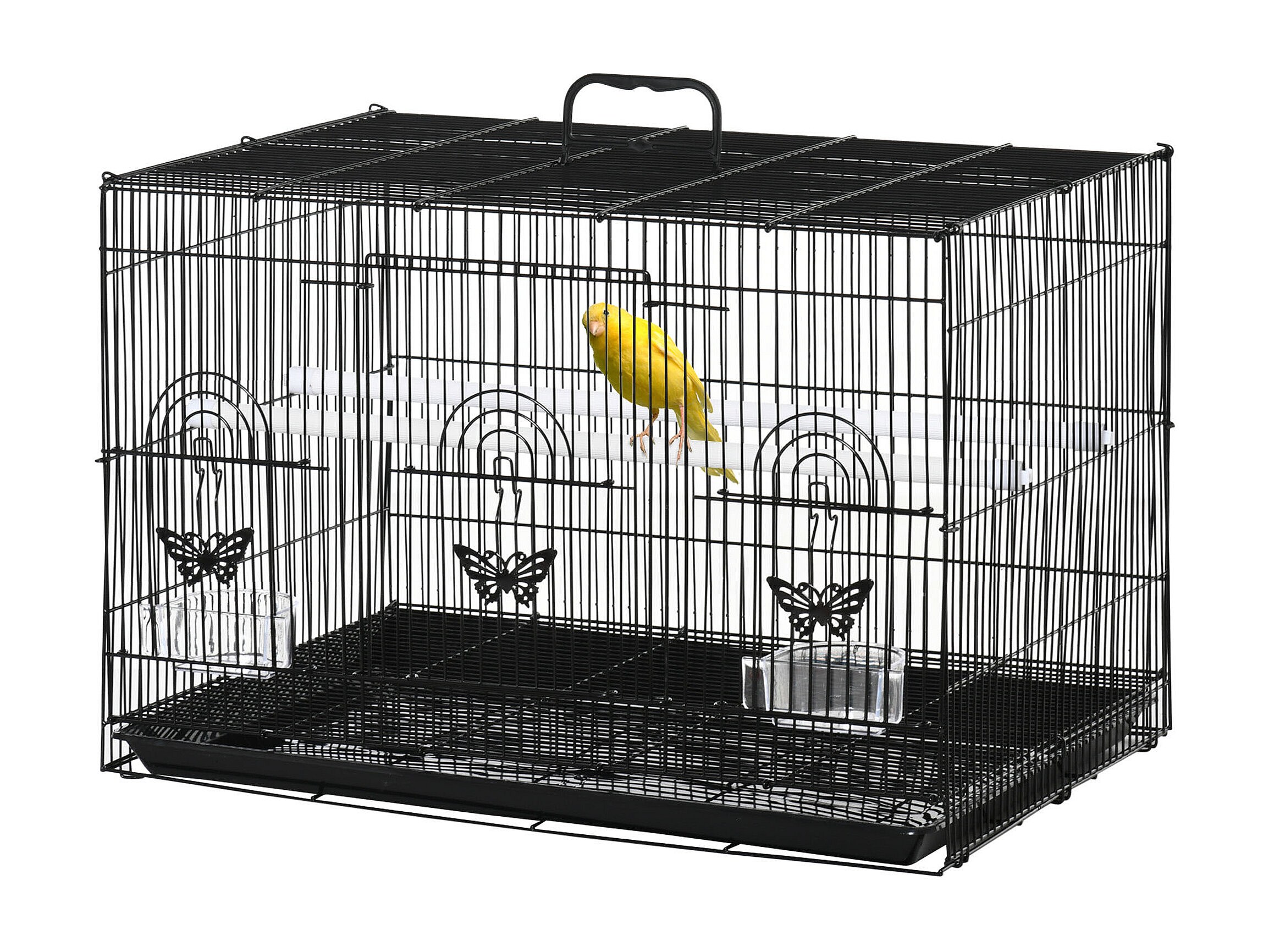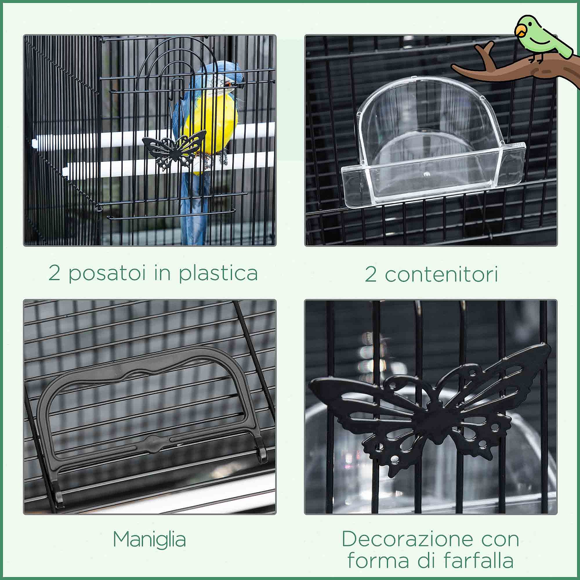 Gabbia per uccelli con 2 posatoi e 3 ingressi in metallo e plastica nero