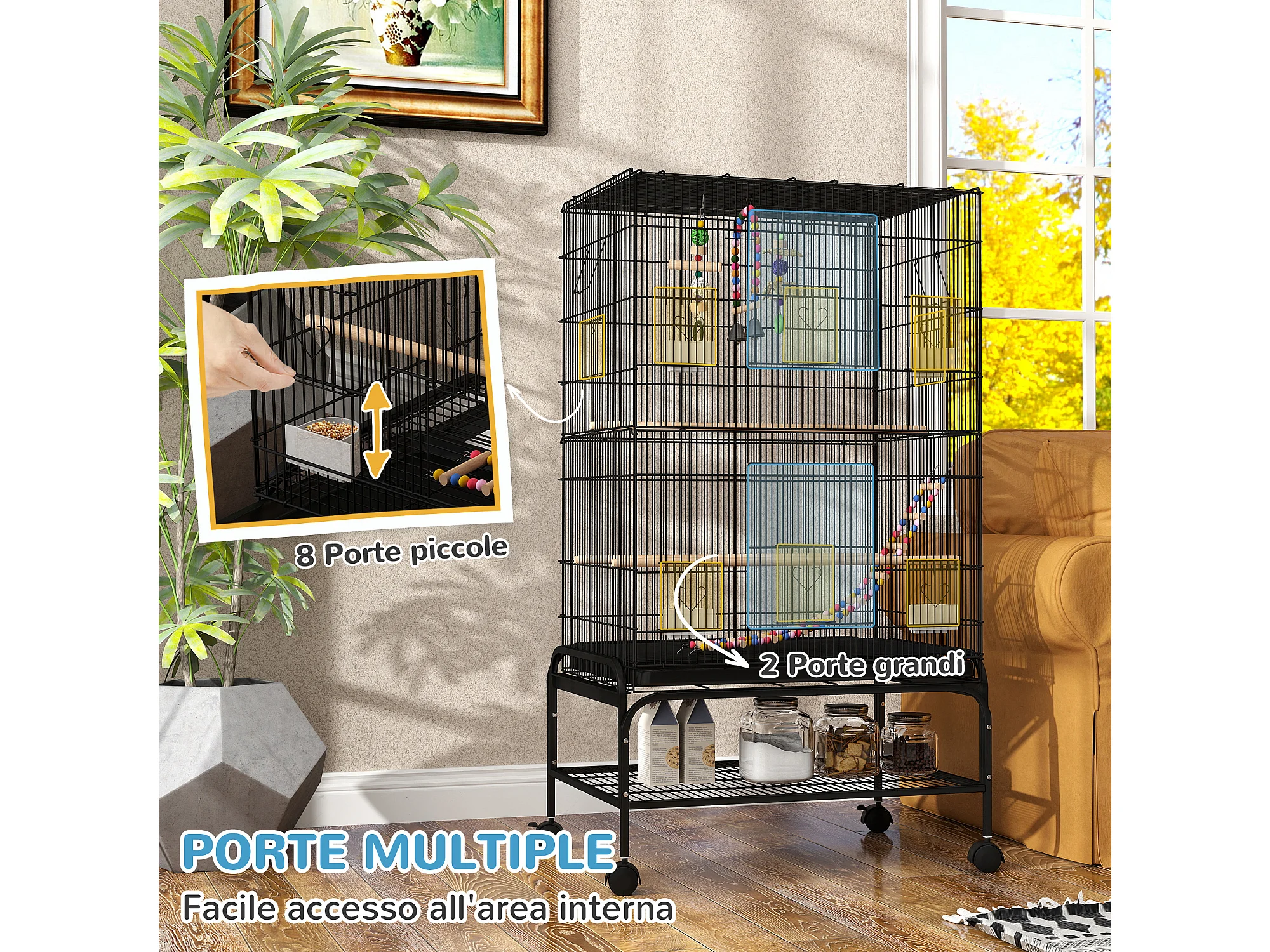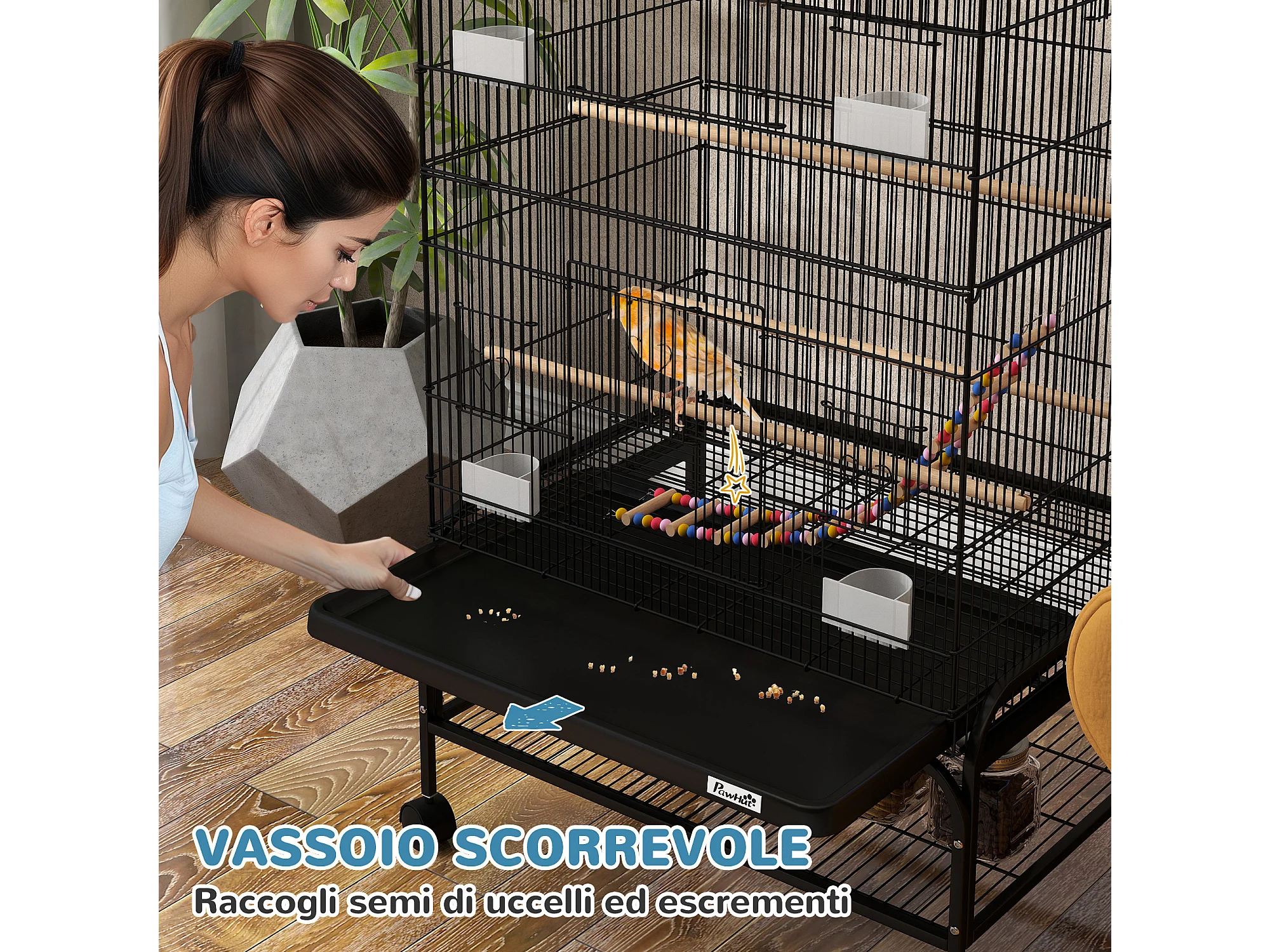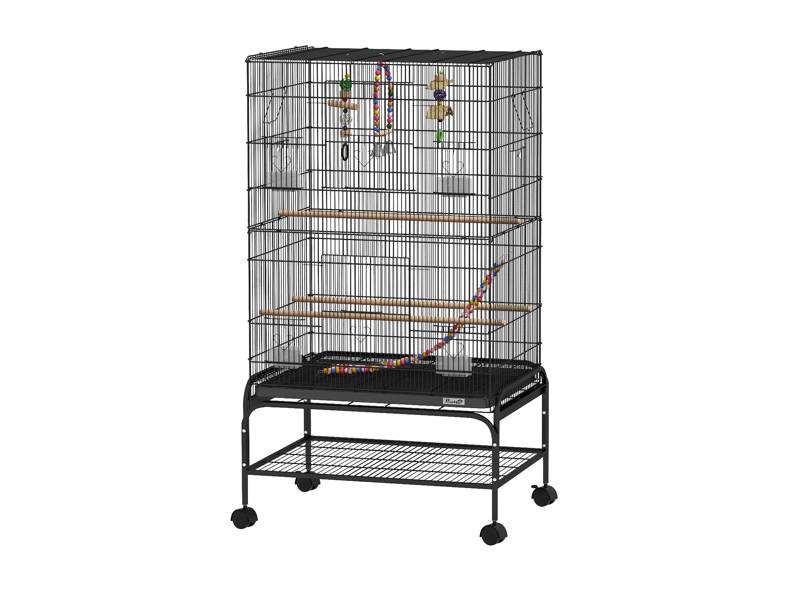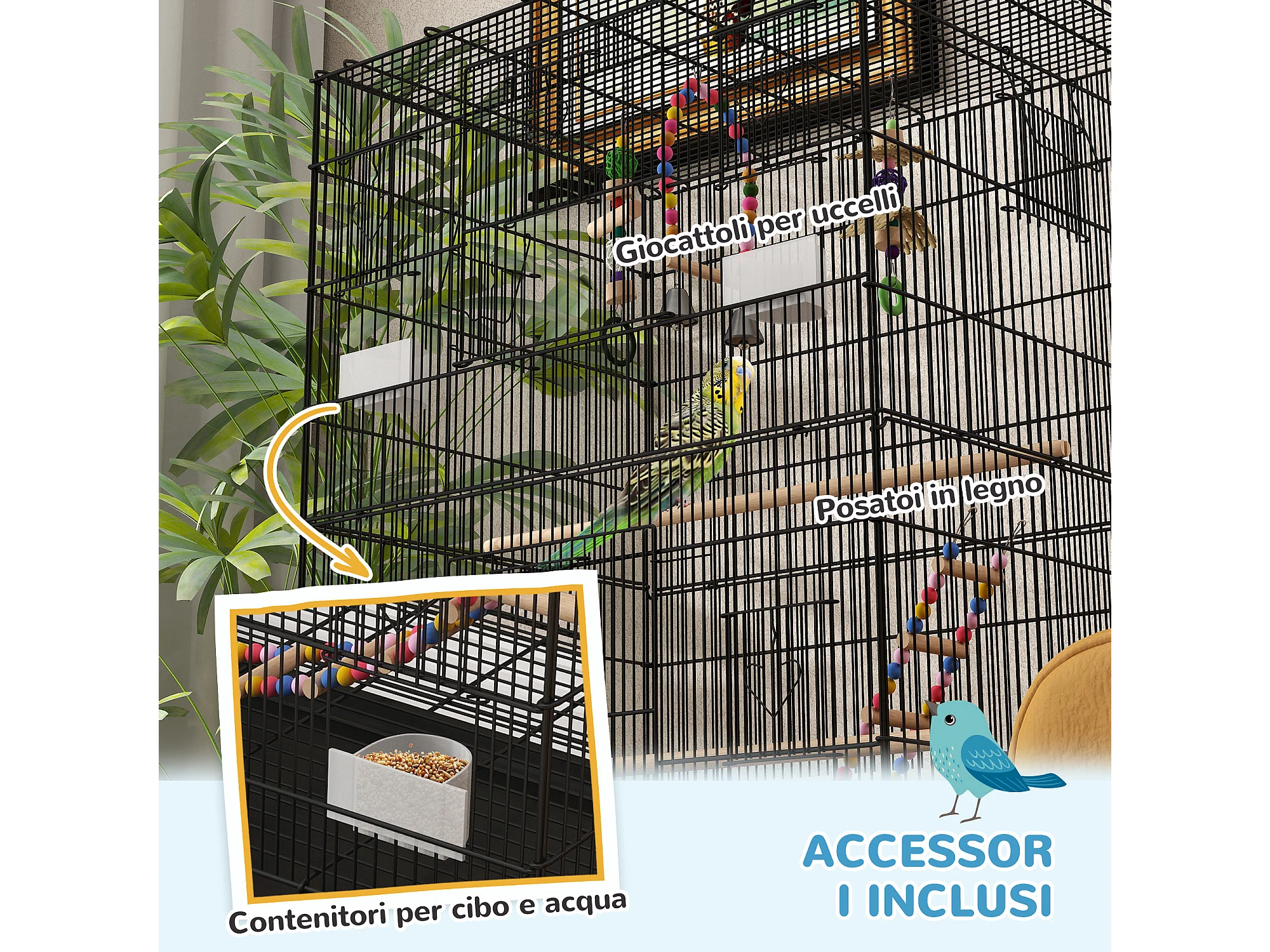 Gabbia per uccelli con area gioco ruote e vassoio acciaio nero