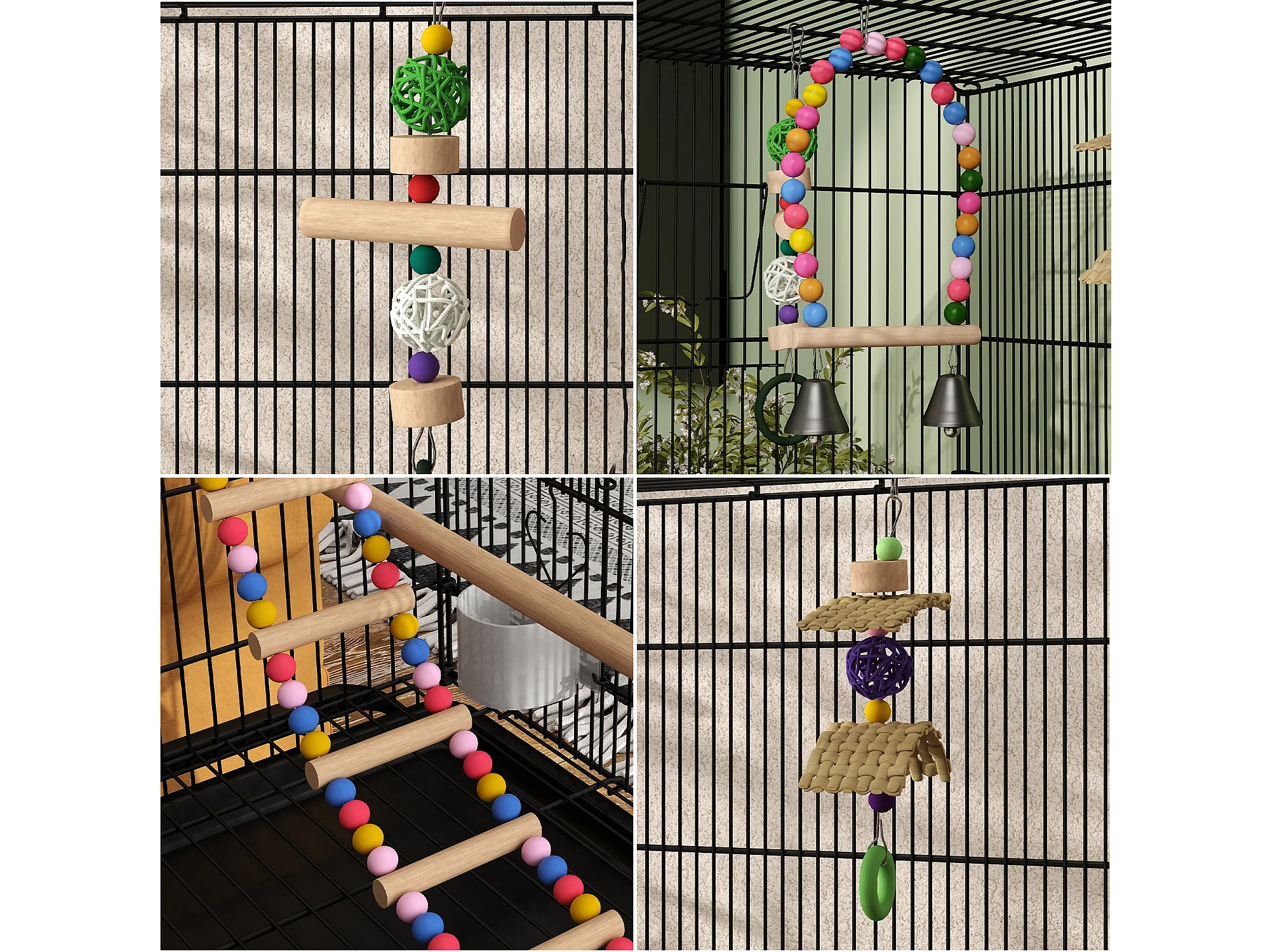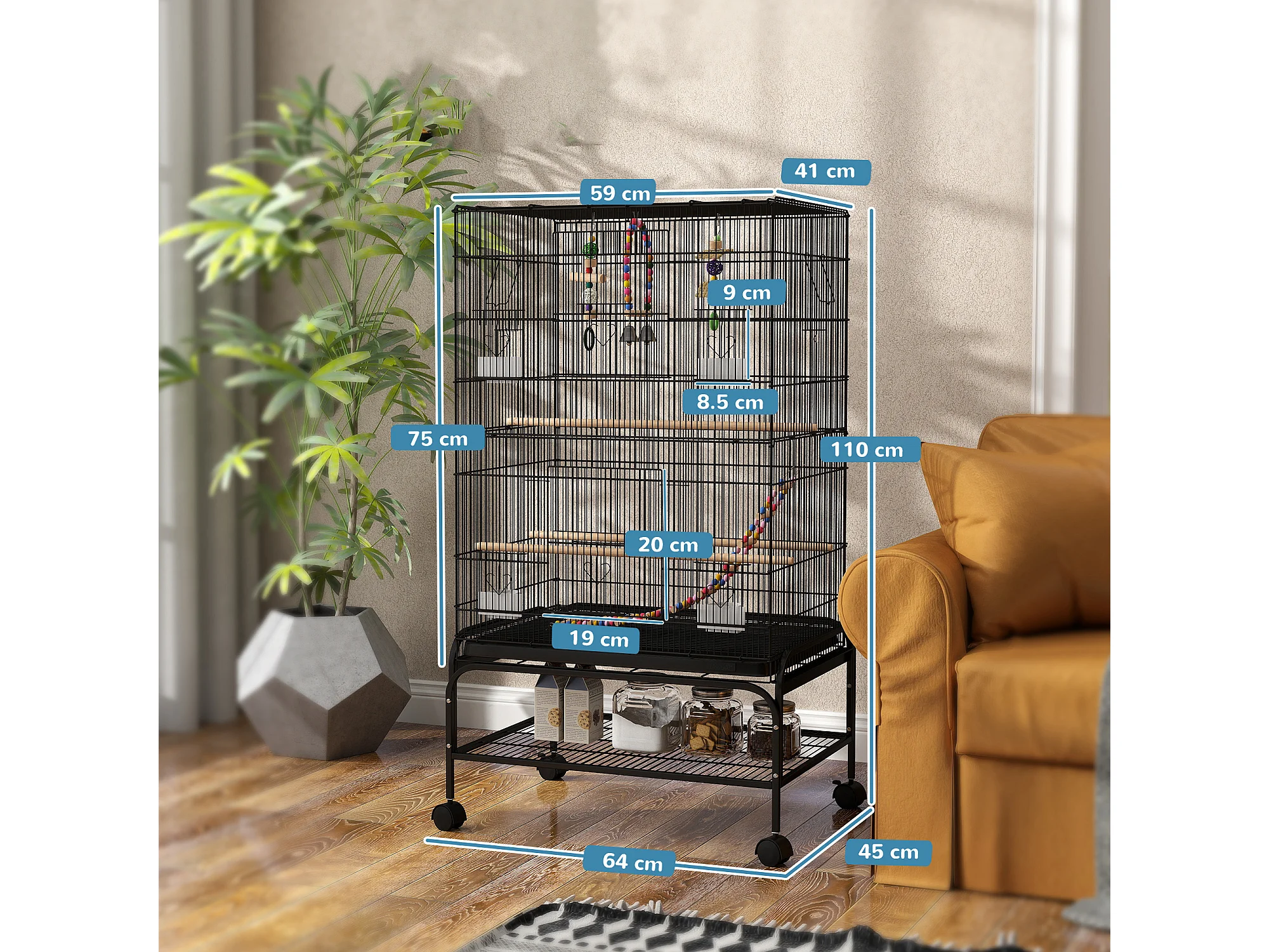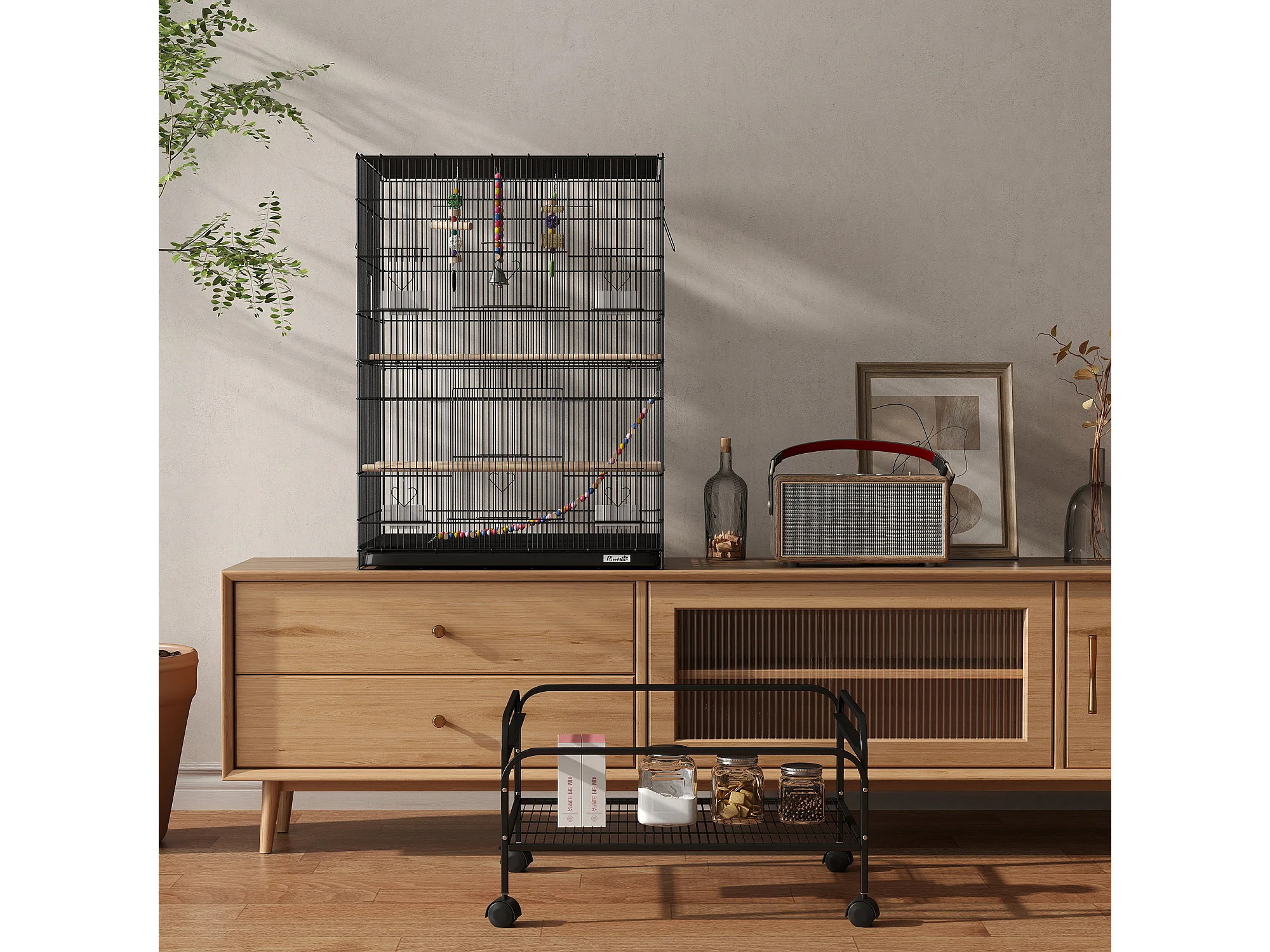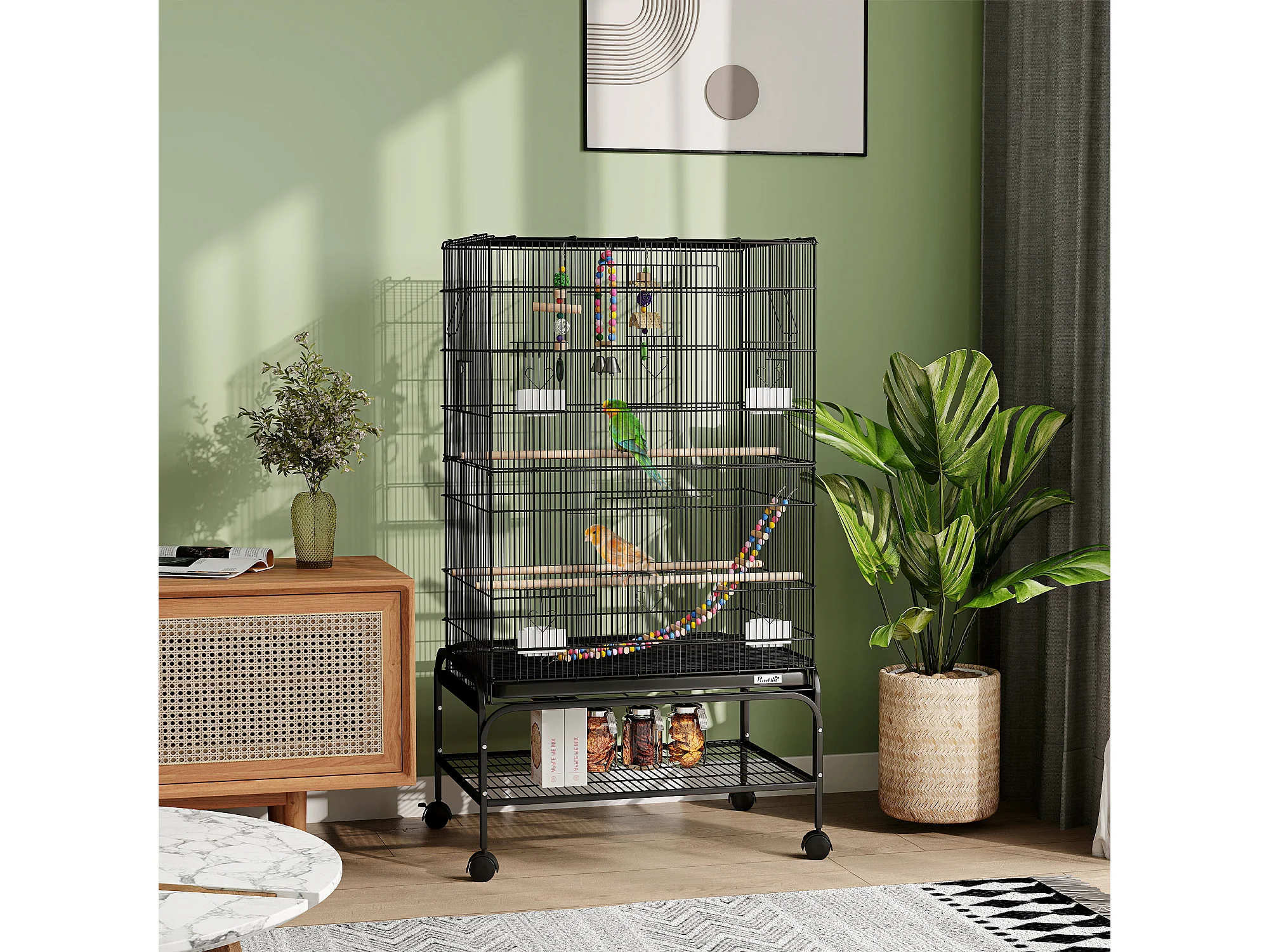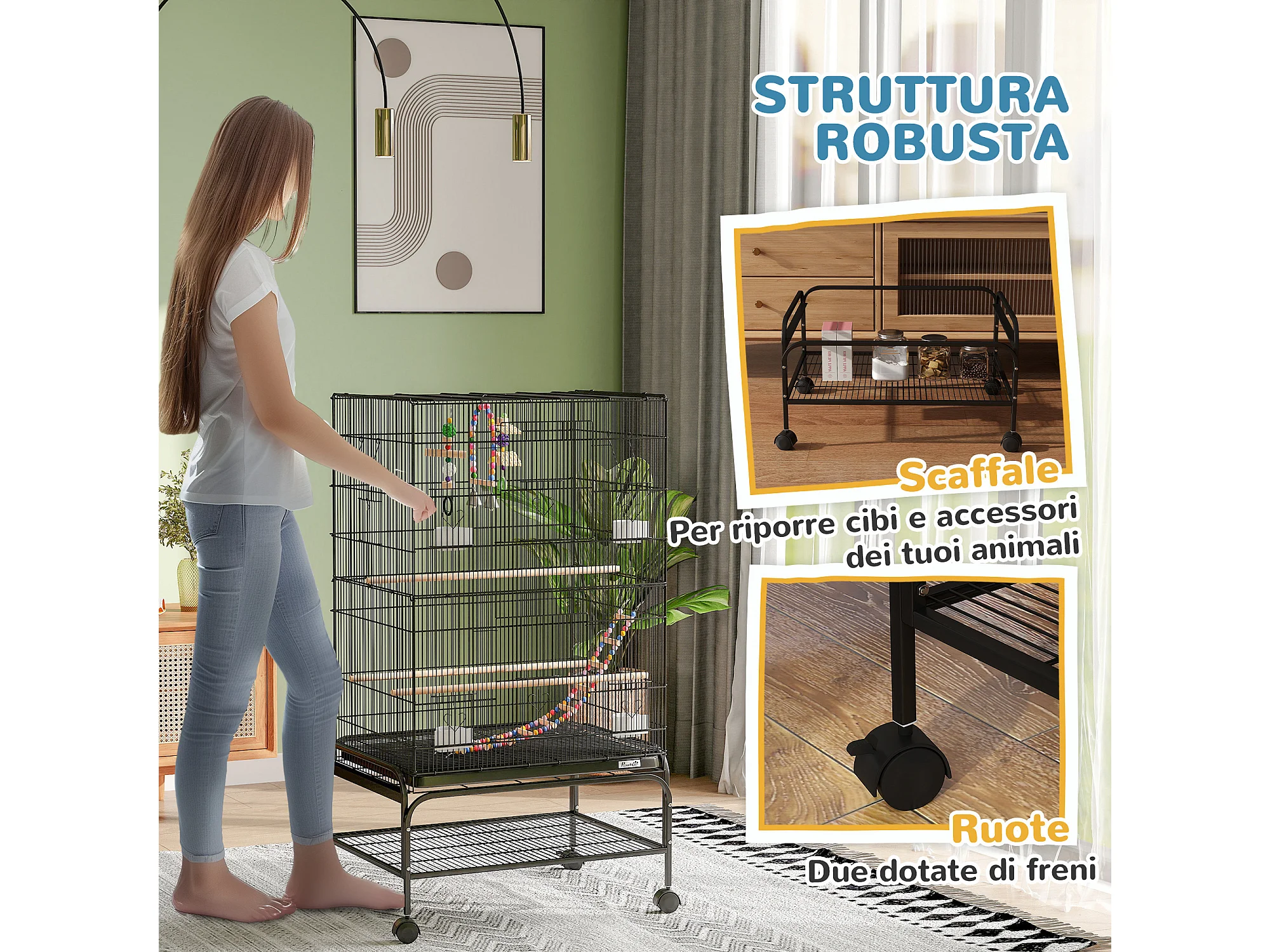 Gabbia per uccelli con area gioco ruote e vassoio acciaio nero