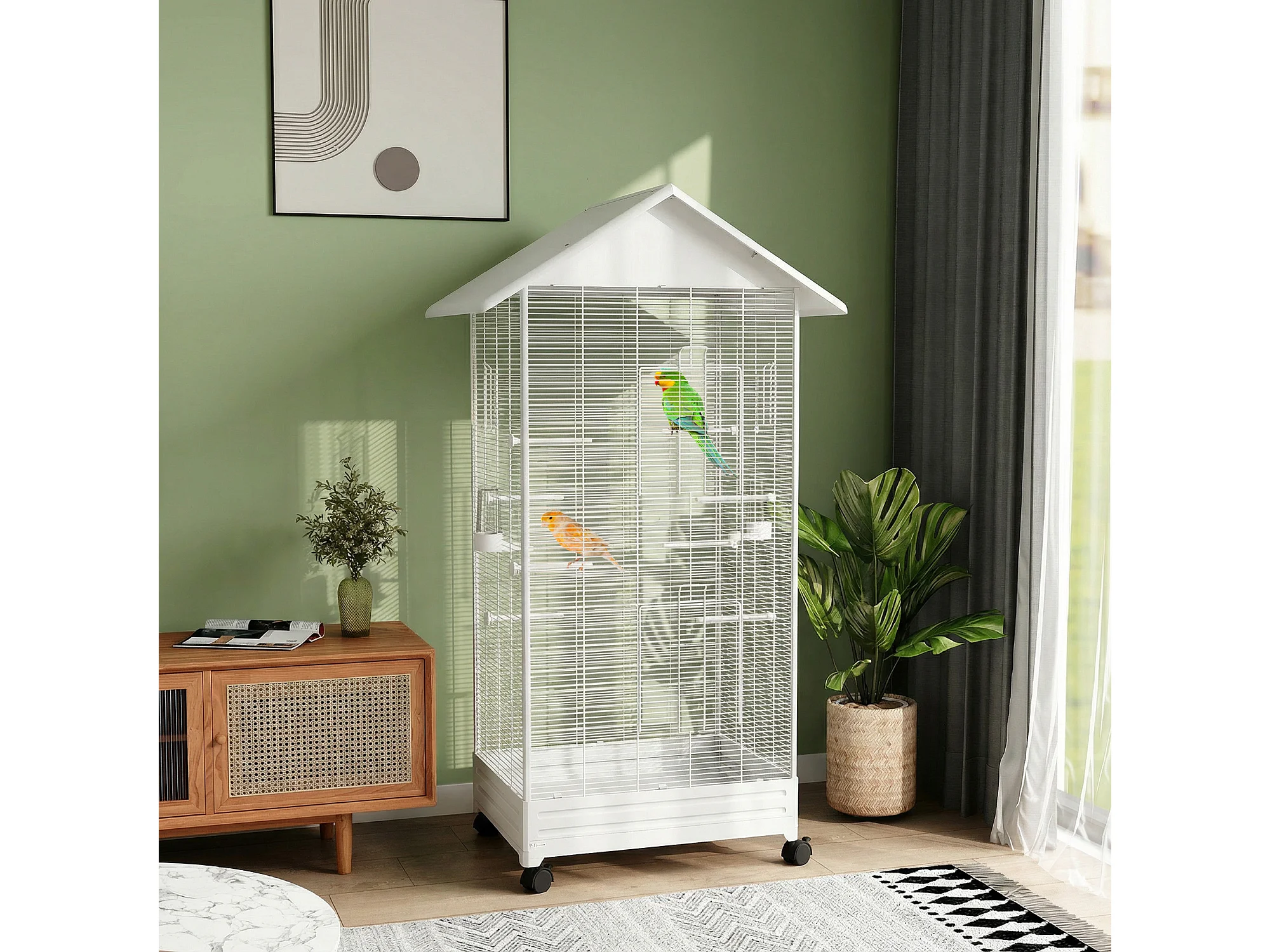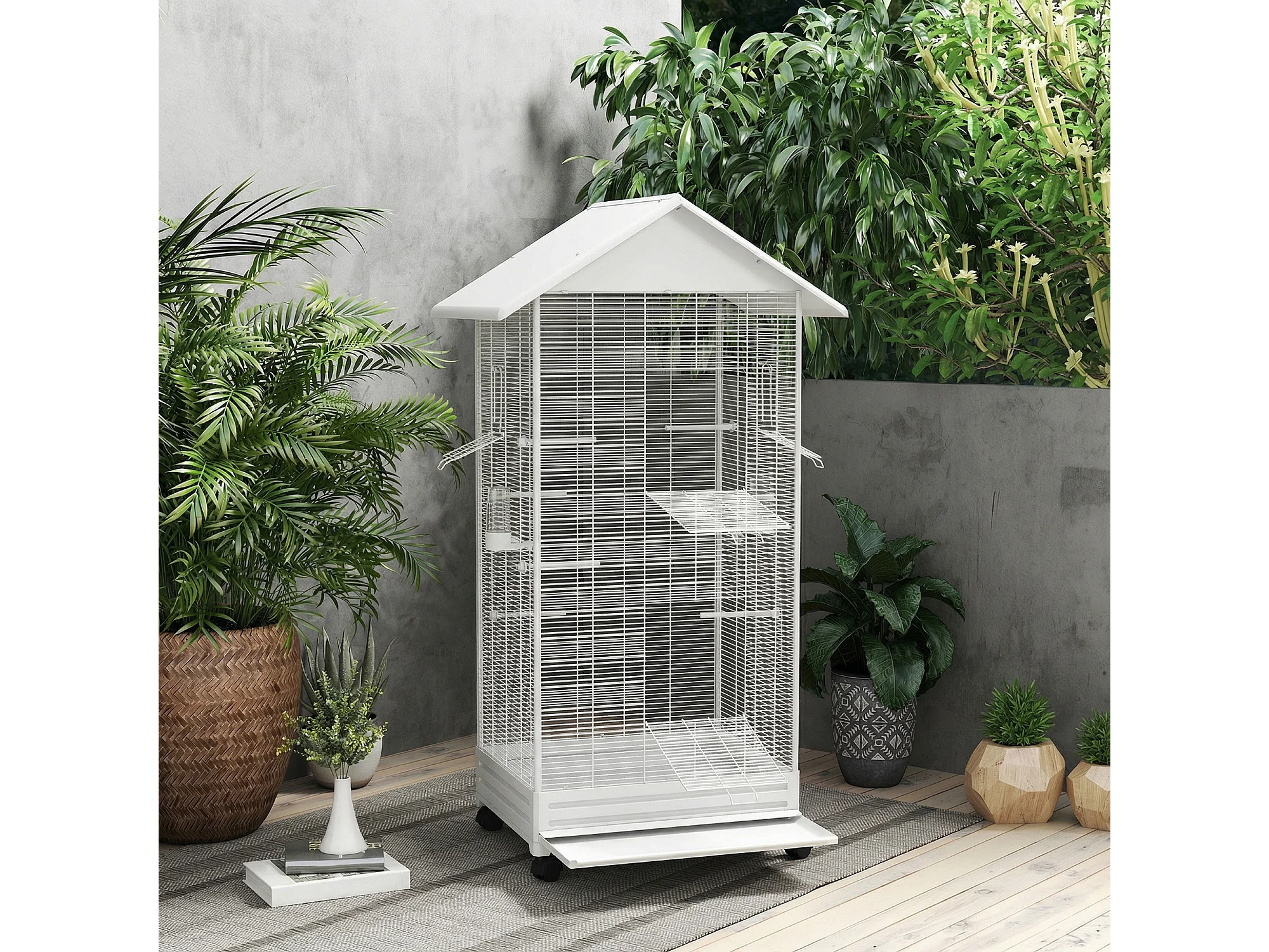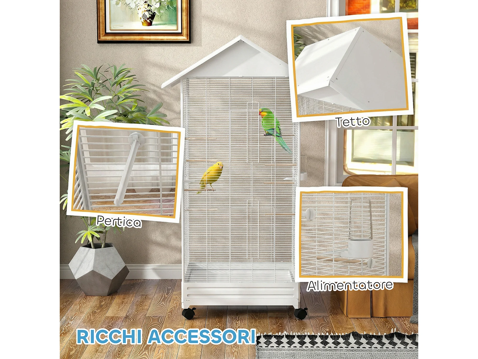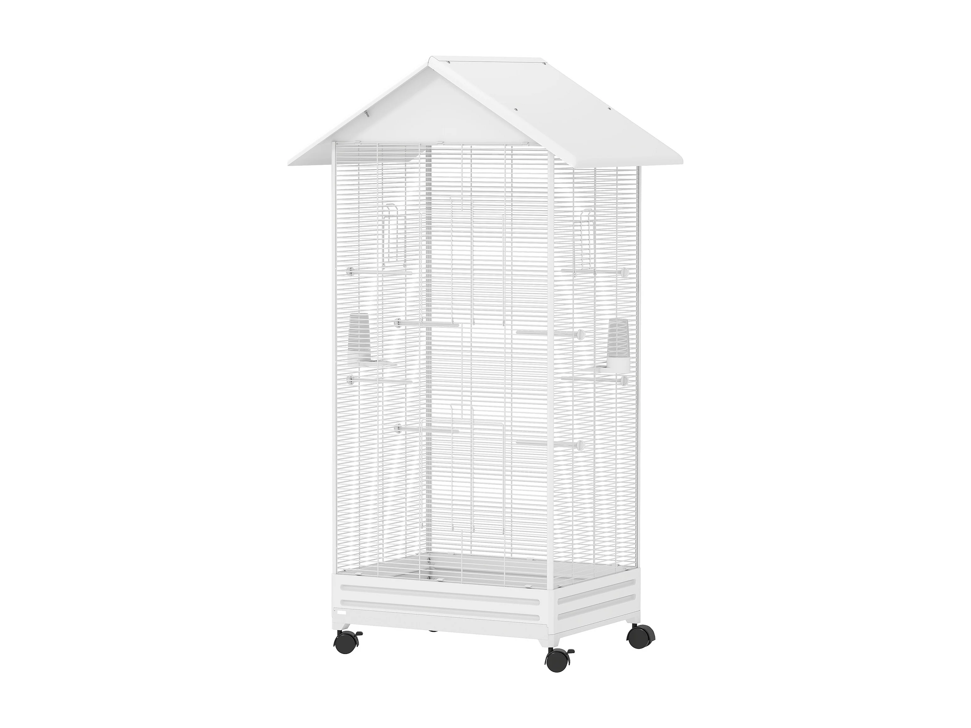 Gabbia per uccelli con ruote e vassoio in acciaio bianco