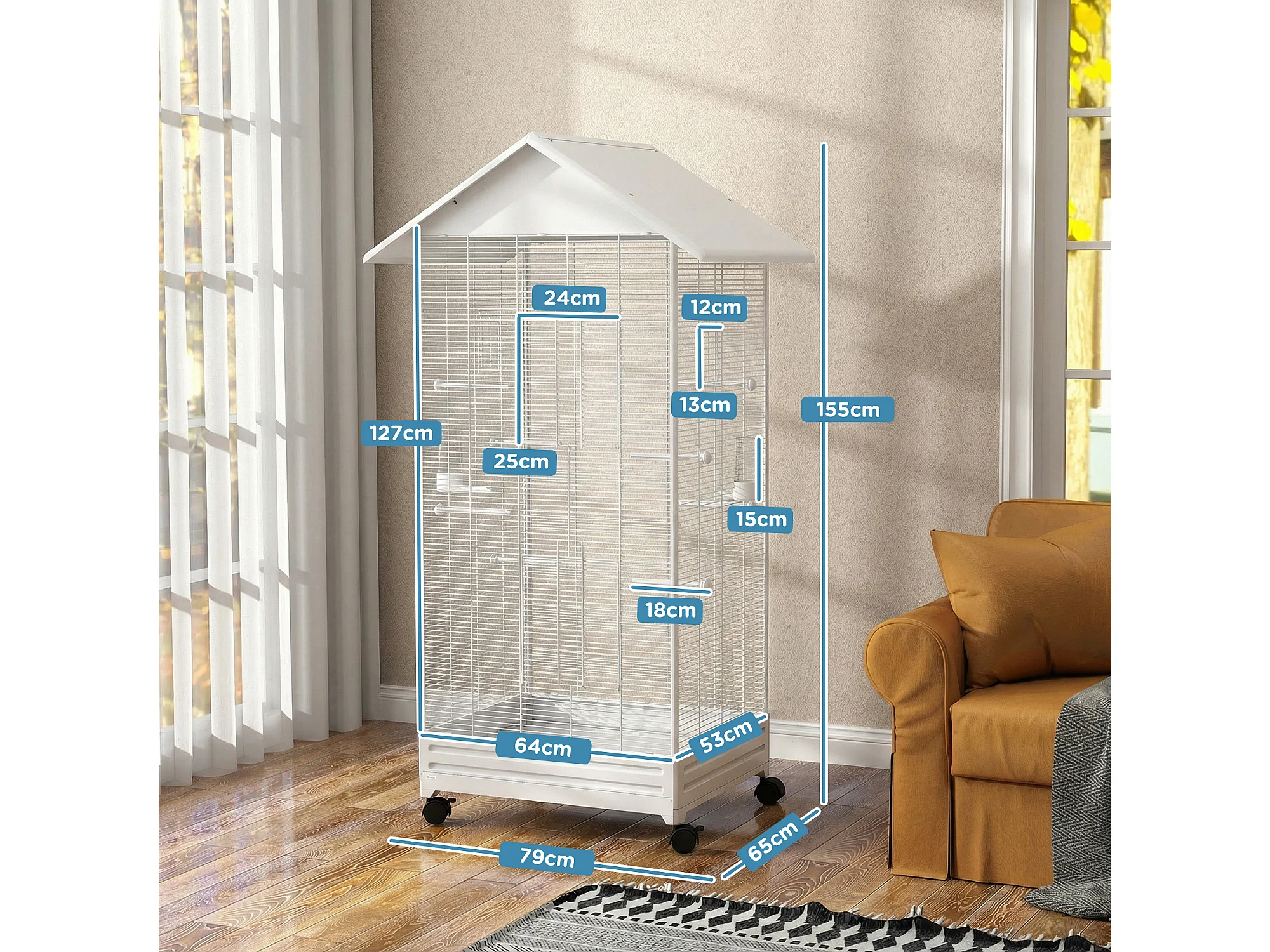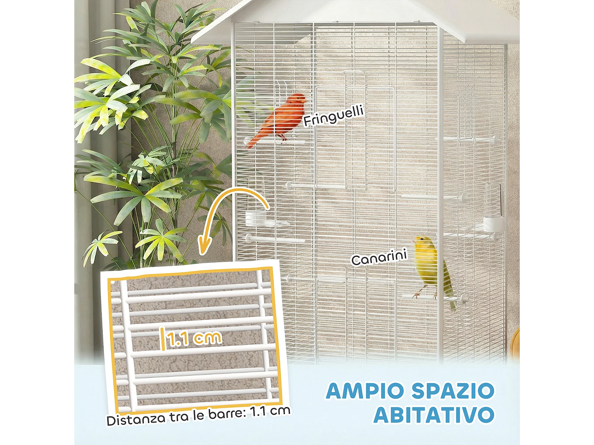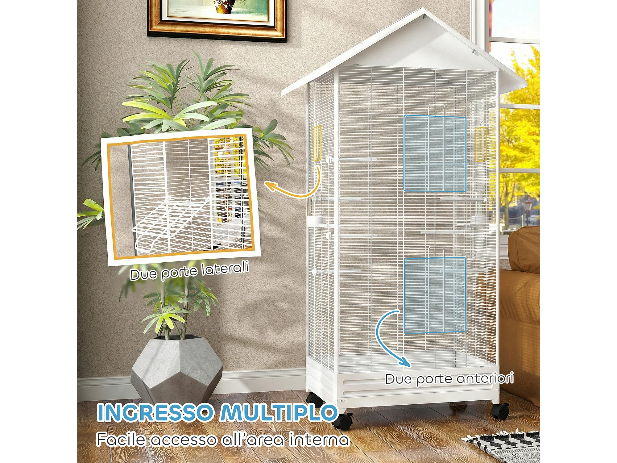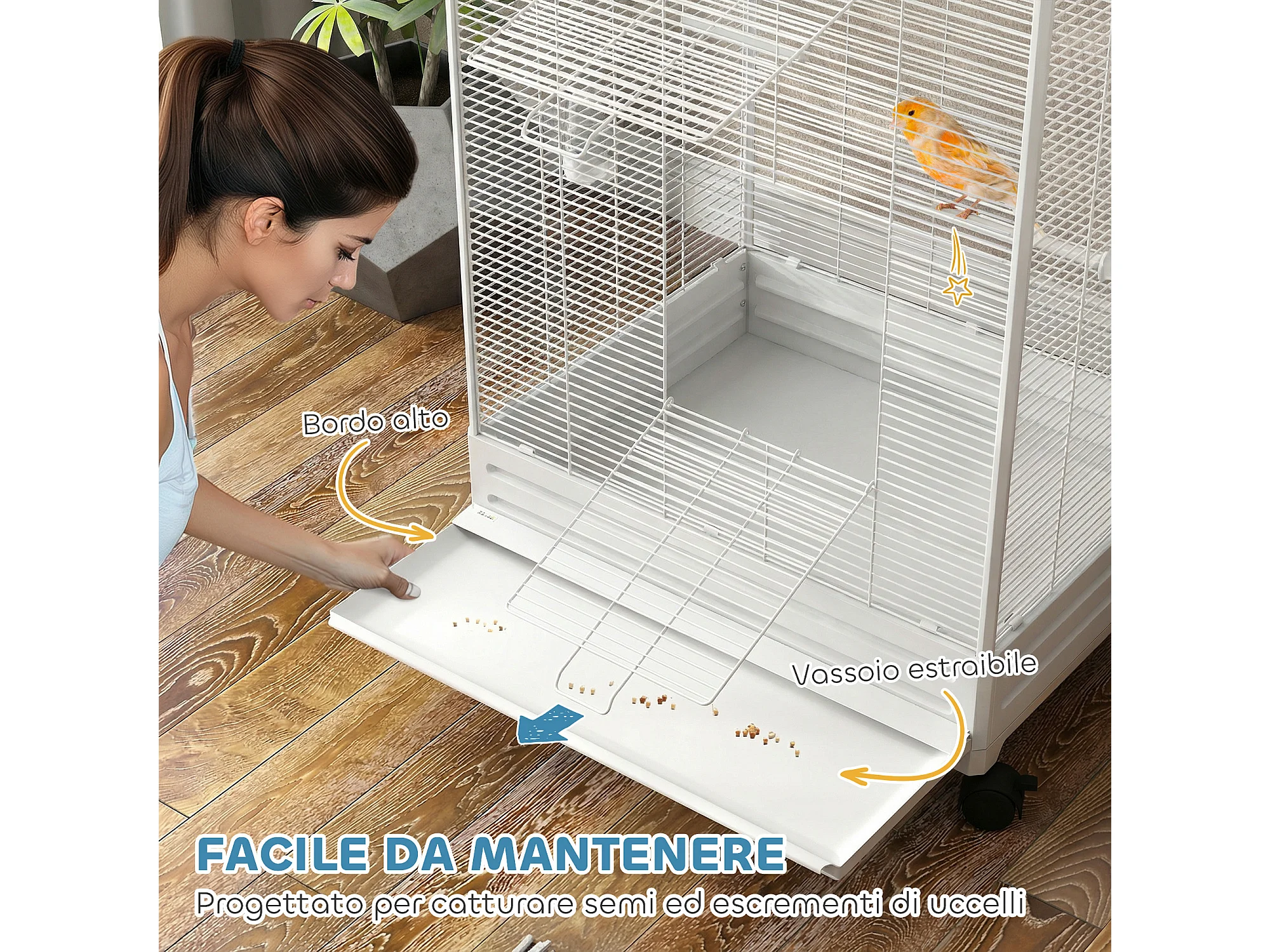 Gabbia per uccelli con ruote e vassoio in acciaio bianco