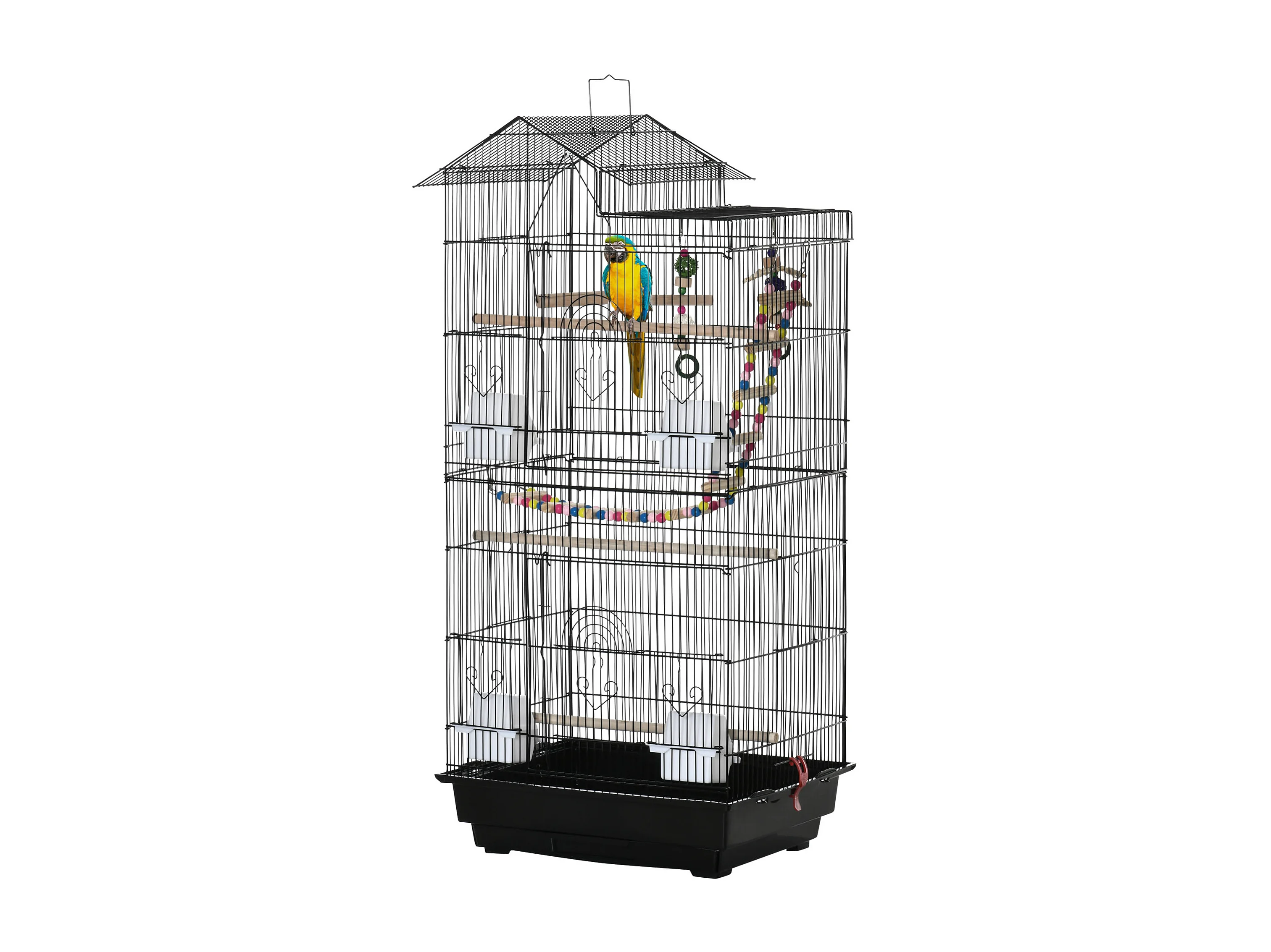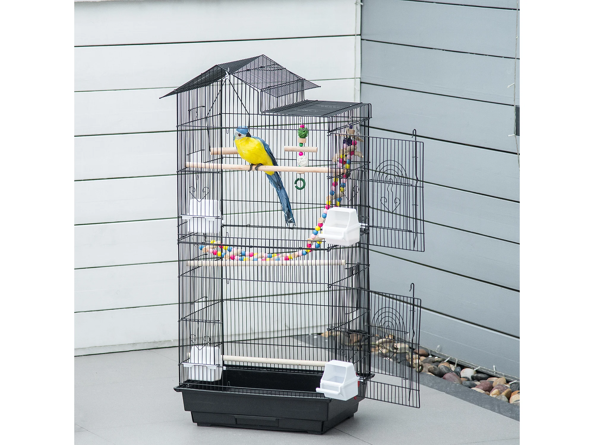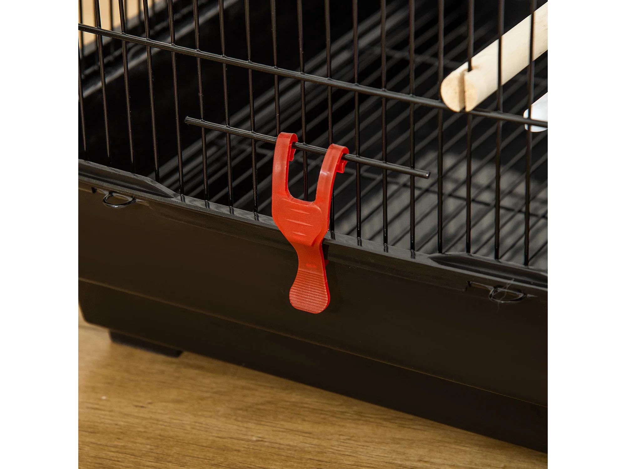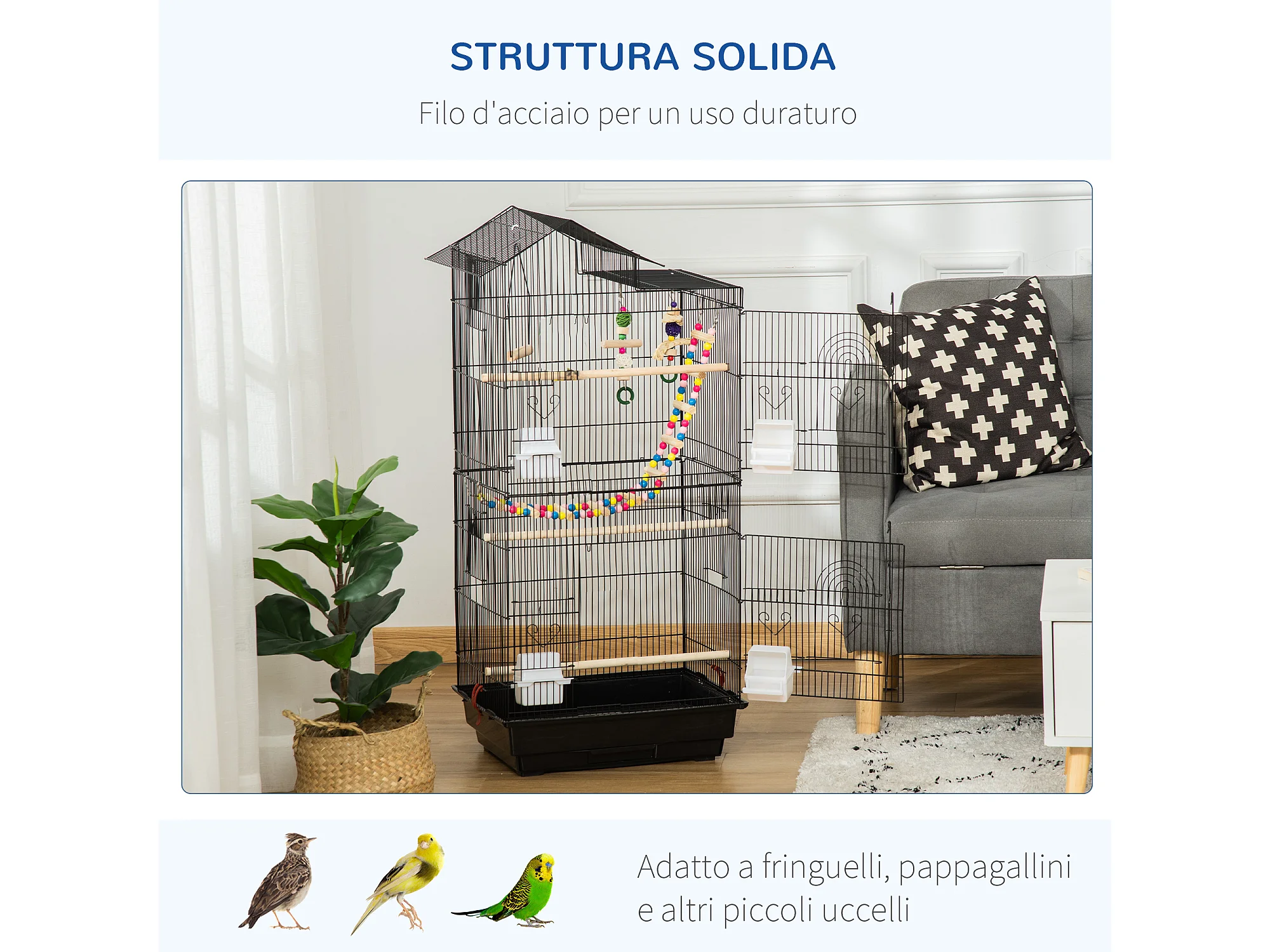 Gabbia per uccelli nera con posatoi e vassoio rimovibile