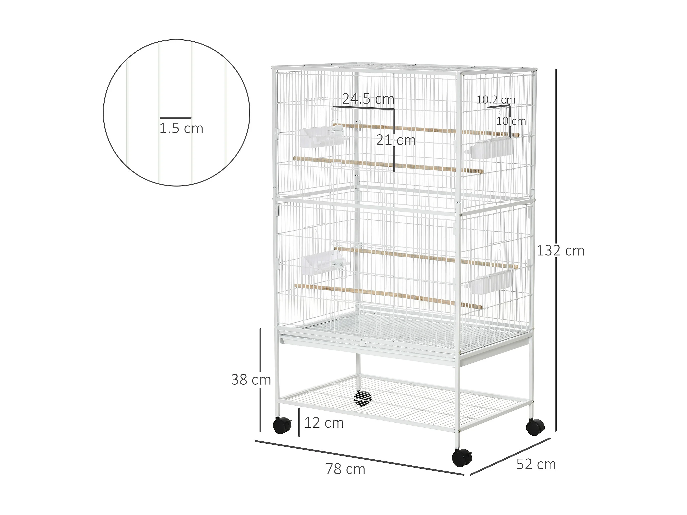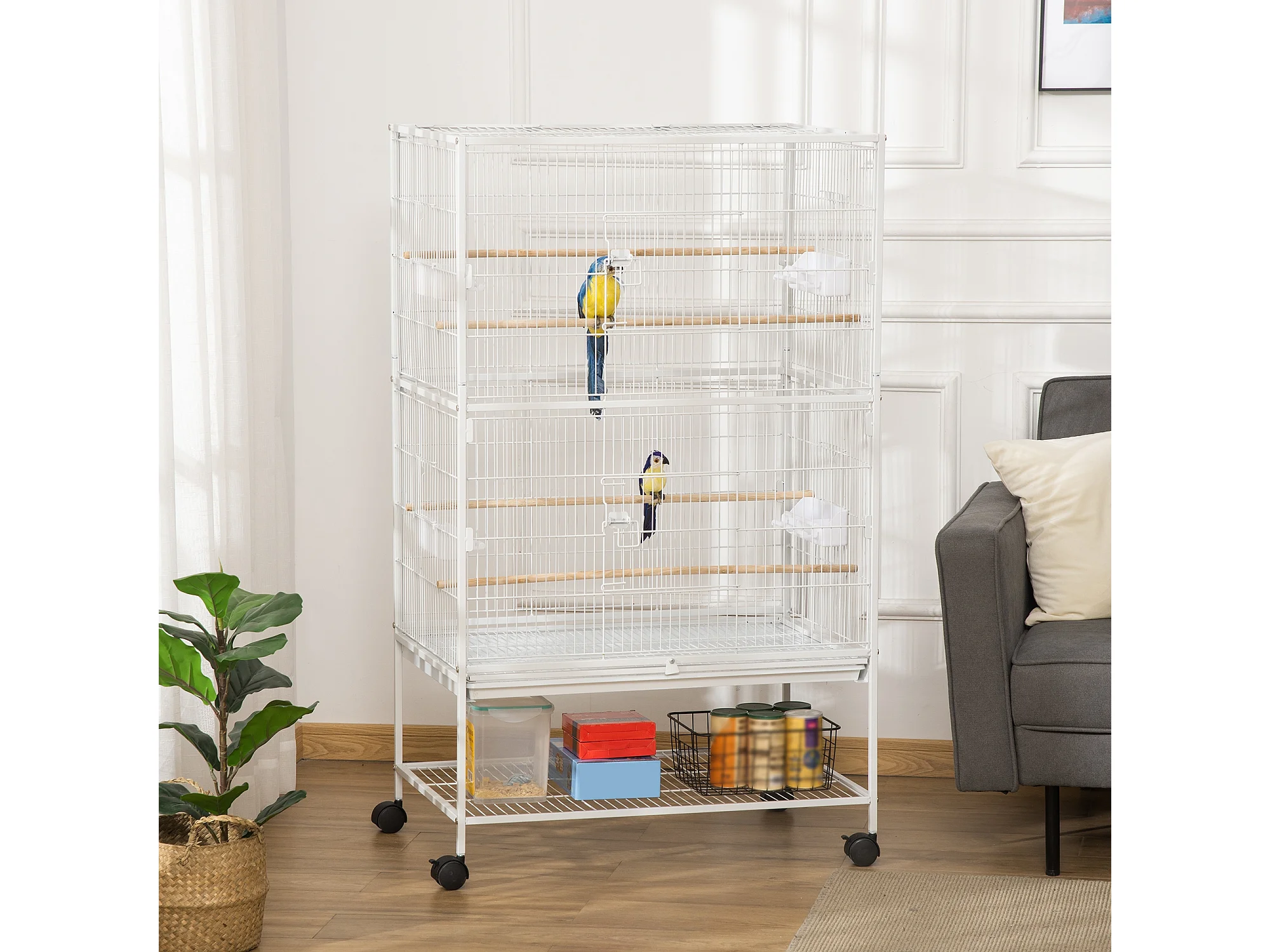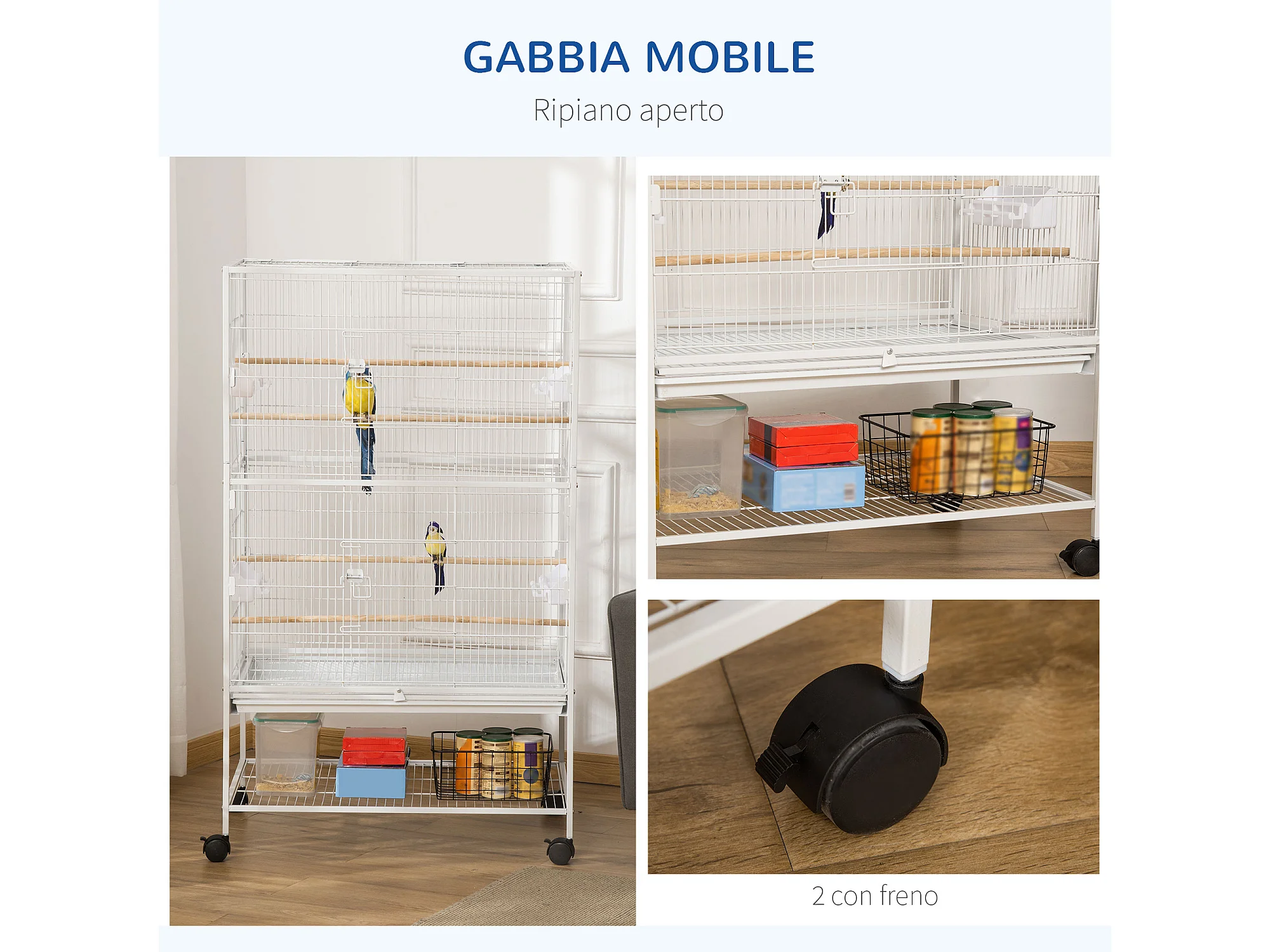 Gabbia per uccelli da interni in acciaio e legno a 4 ruote bianco