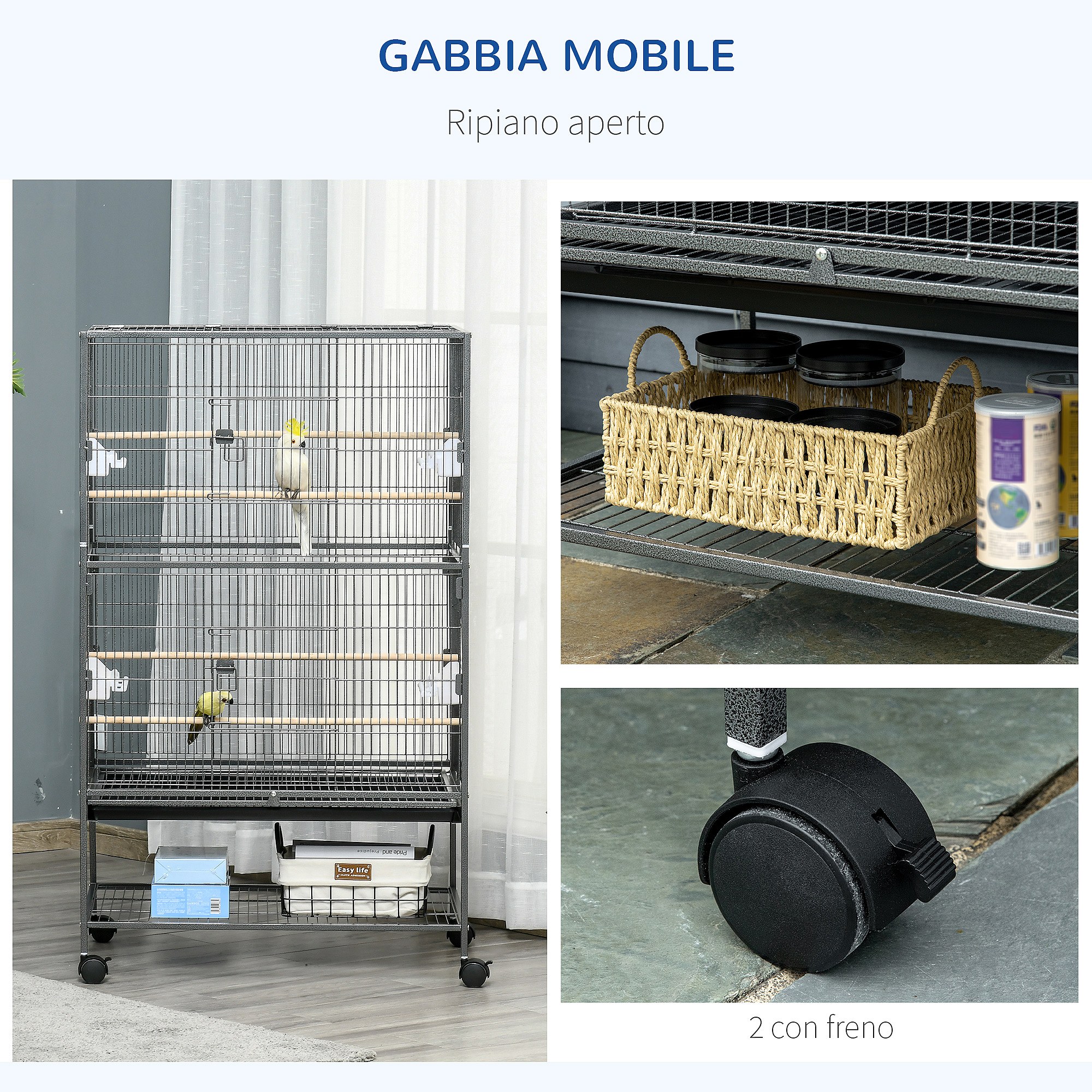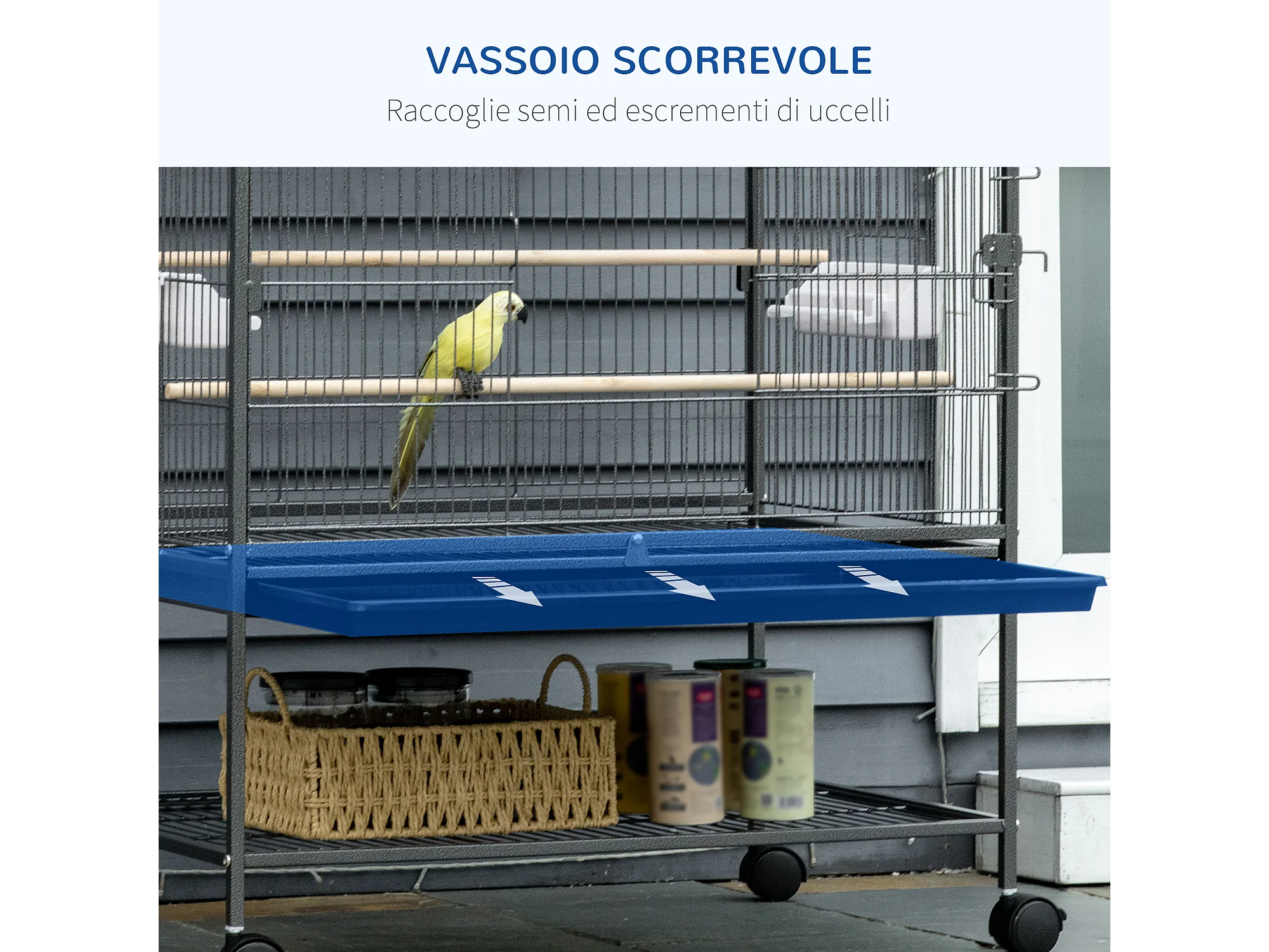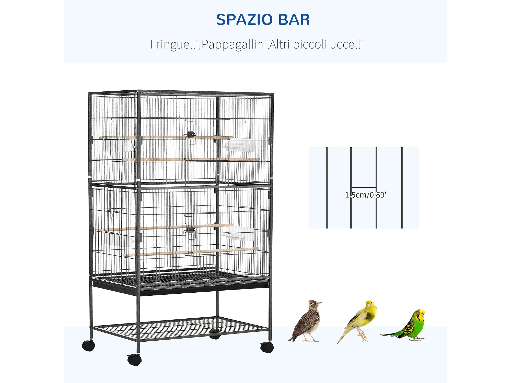 Gabbia per uccelli da interni in acciaio e legno a 4 ruote con vassoio