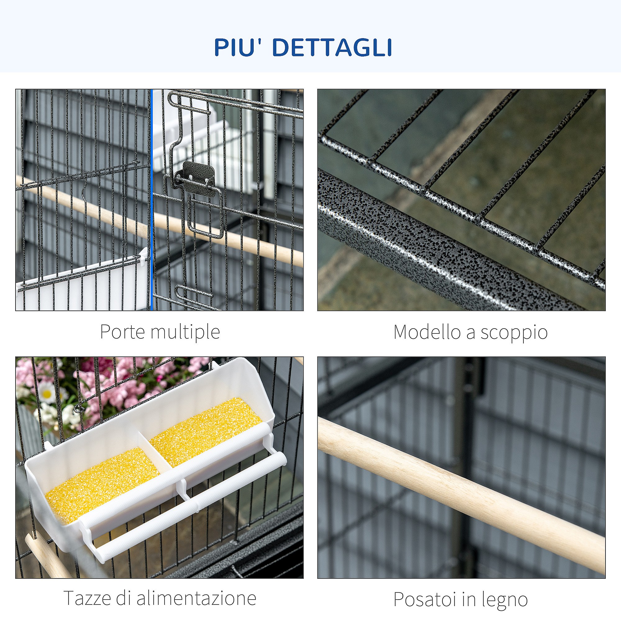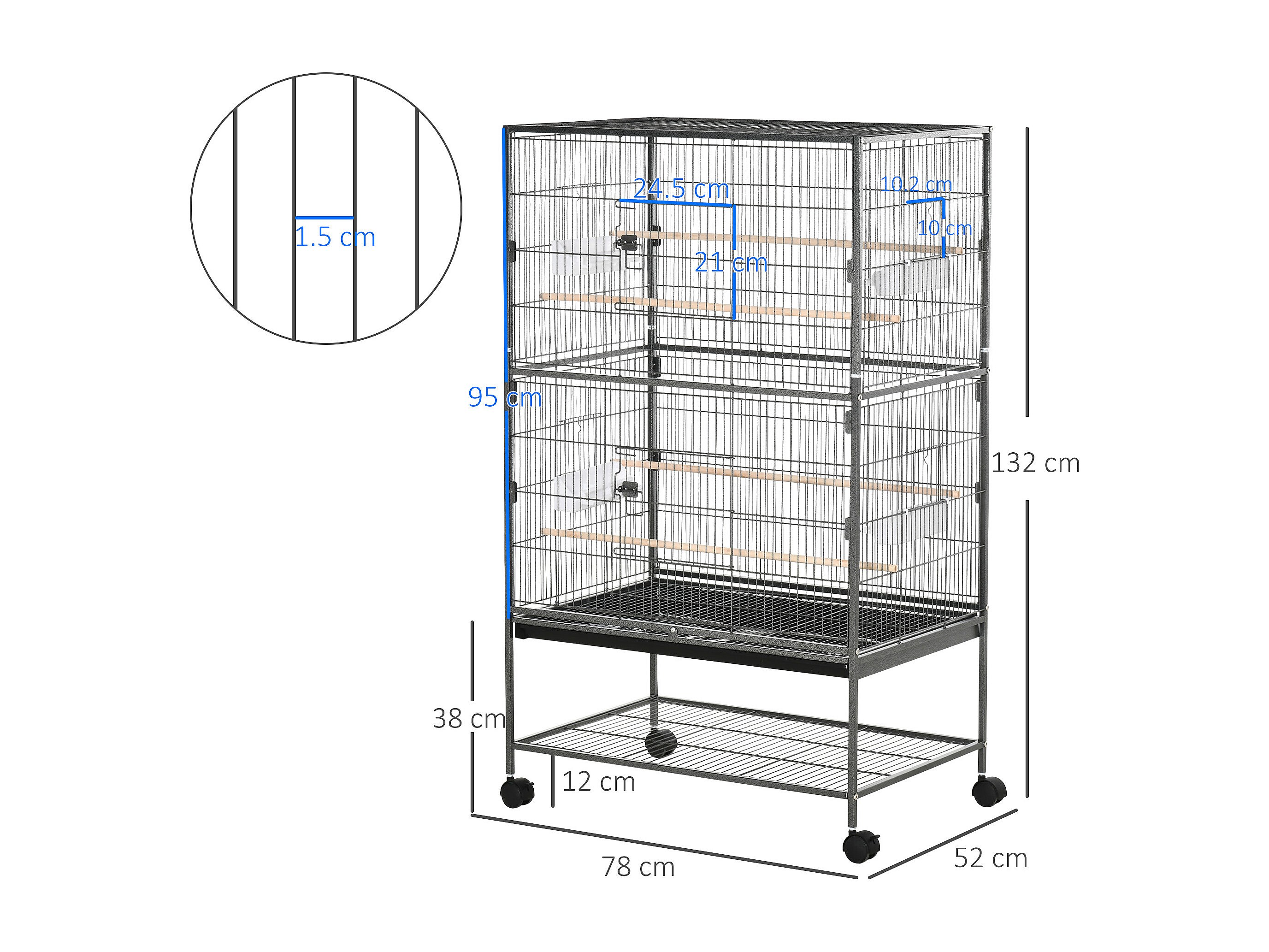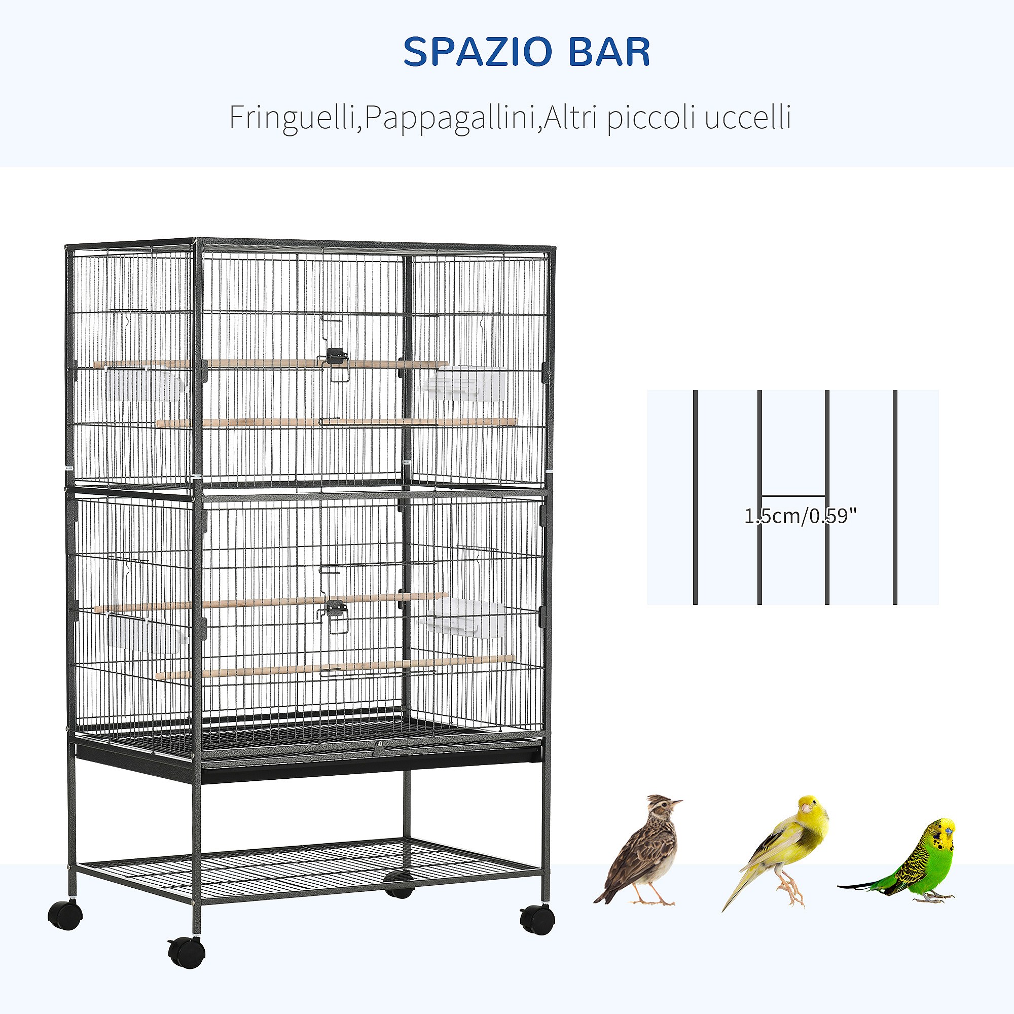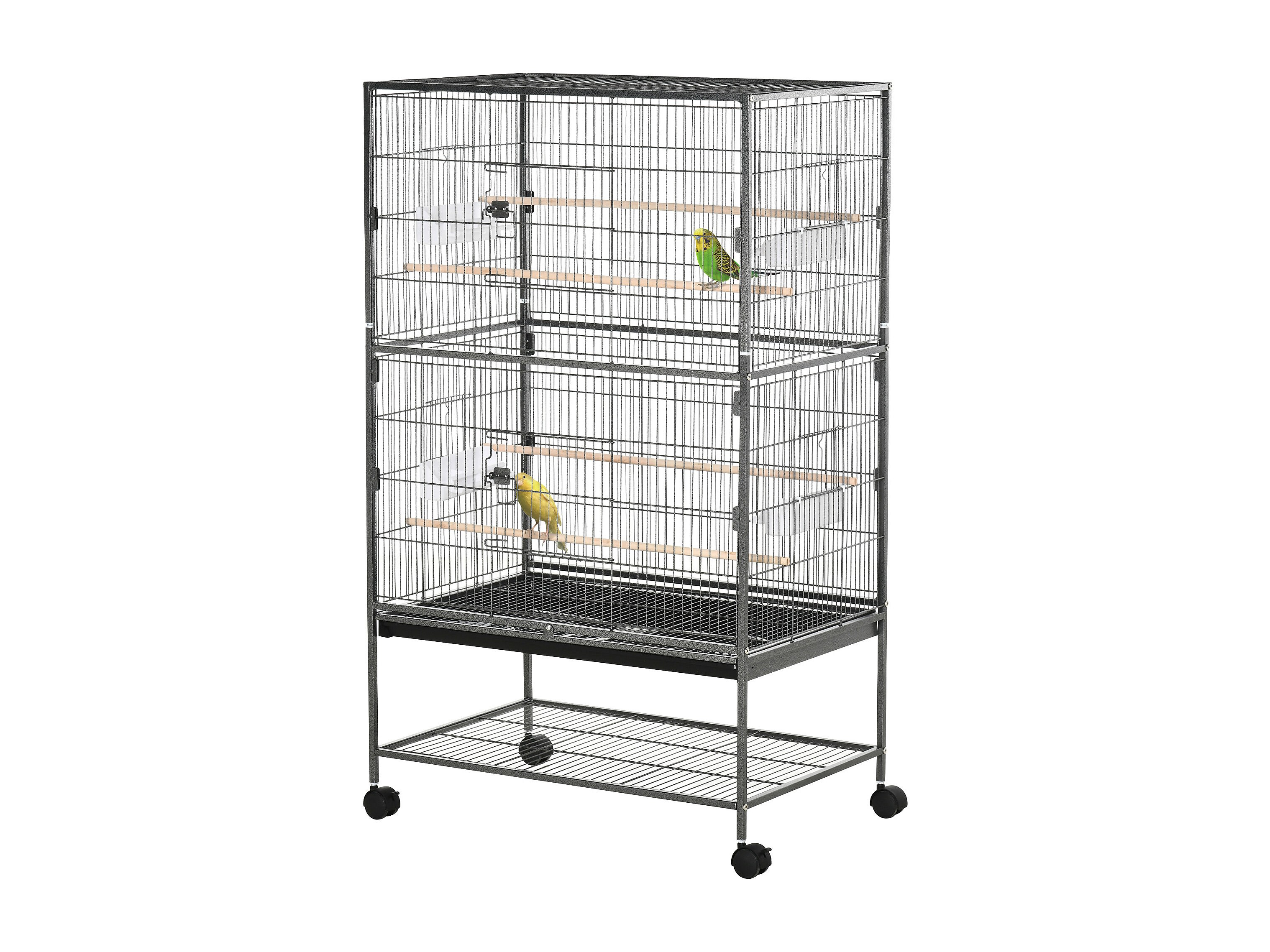 Gabbia per uccelli da interni in acciaio e legno a 4 ruote con vassoio