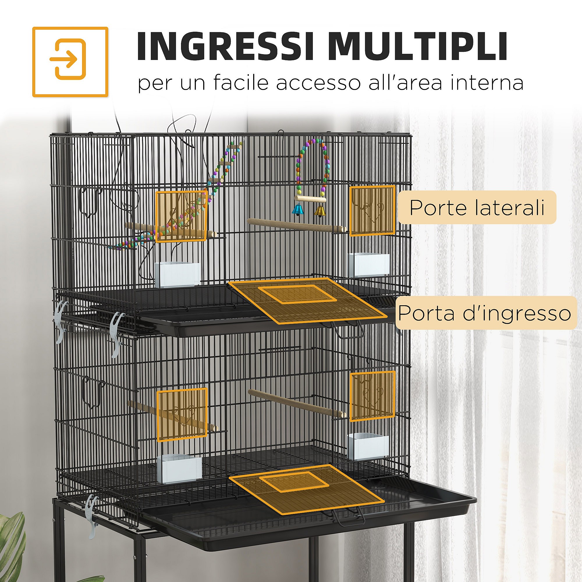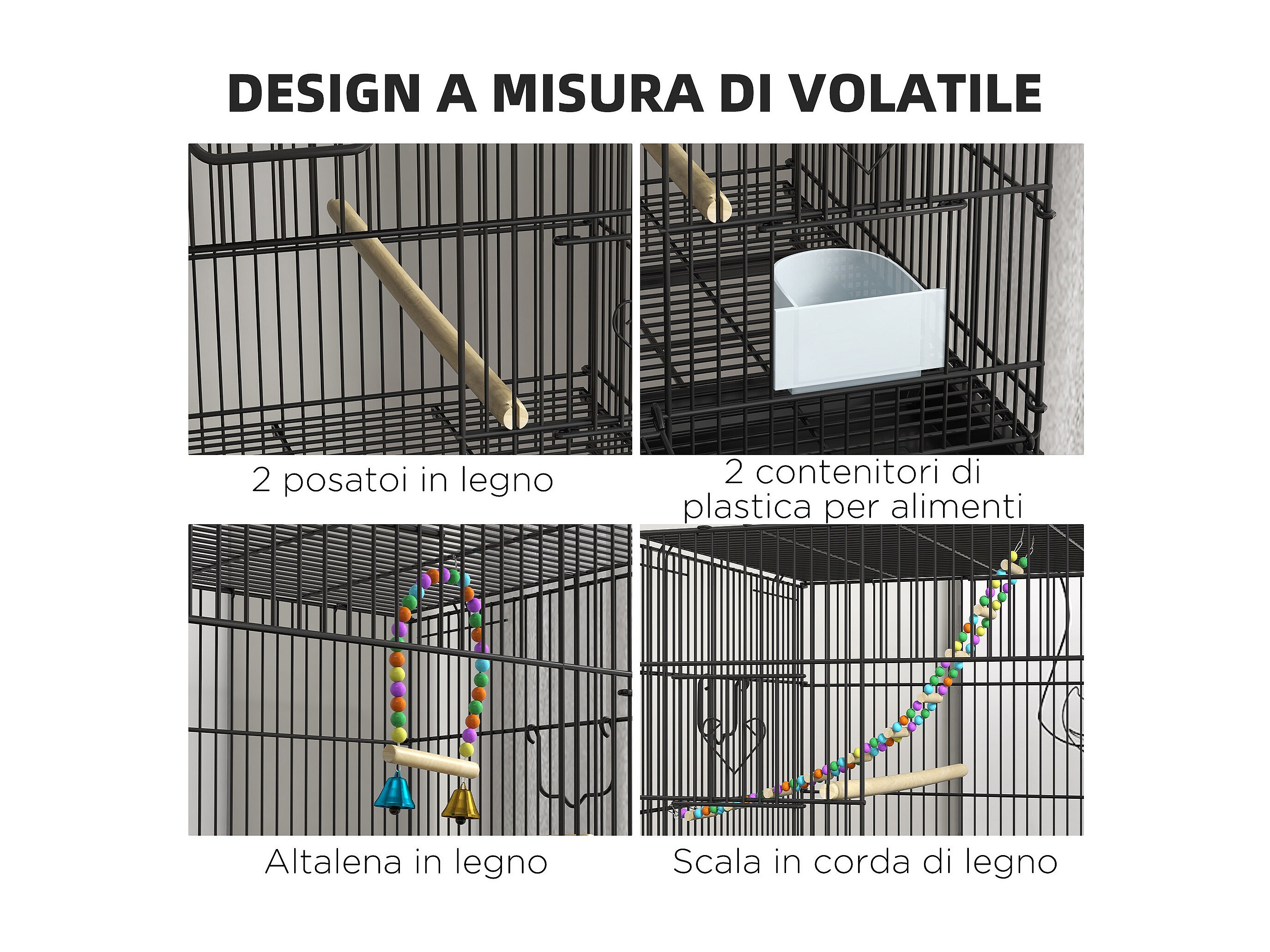 Gabbia per uccelli dal design impilato con altalene e scalette nera