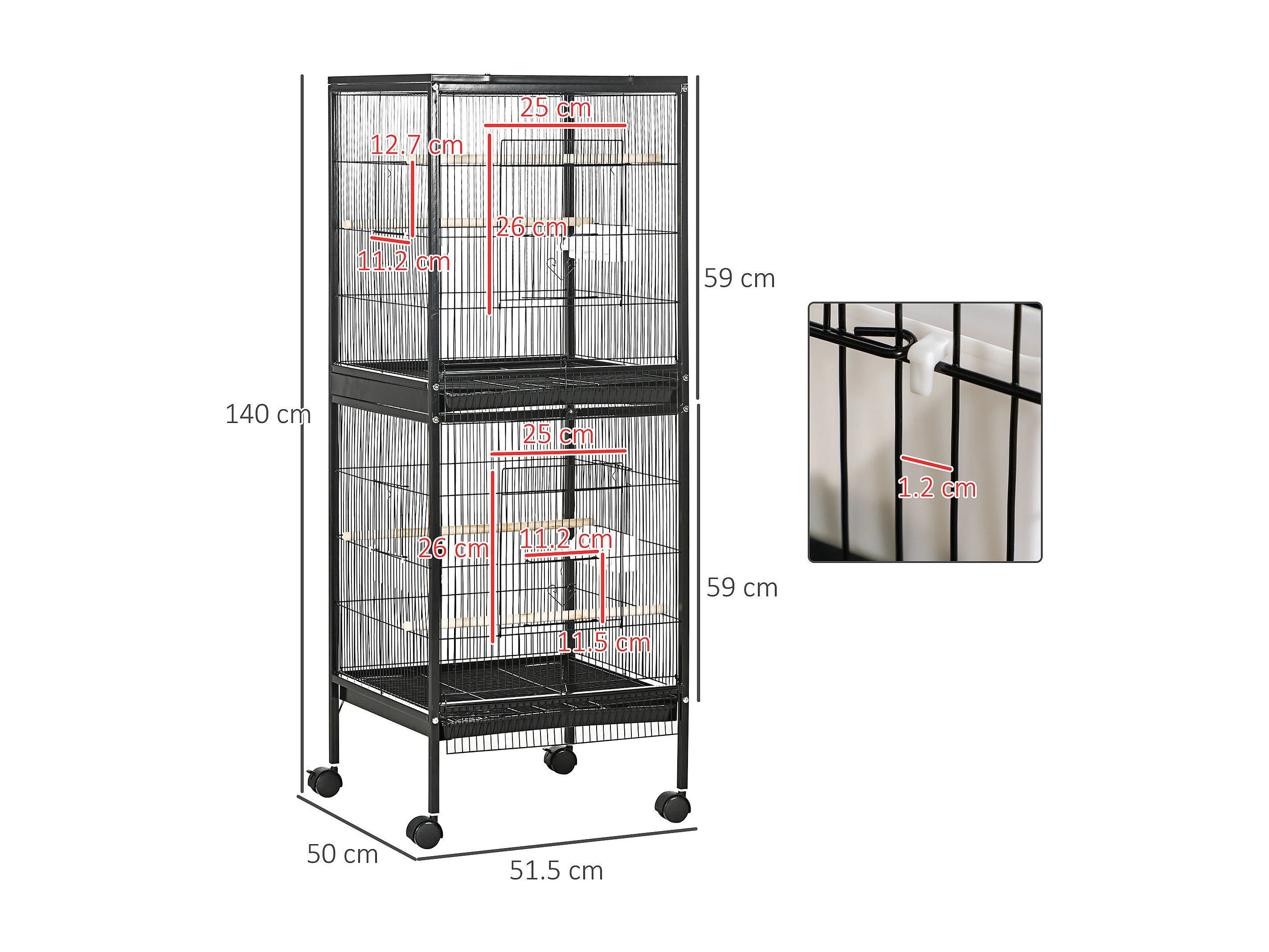 Gabbia per uccelli a ruote con ripiano inferiore, vassoio e griglia nero
