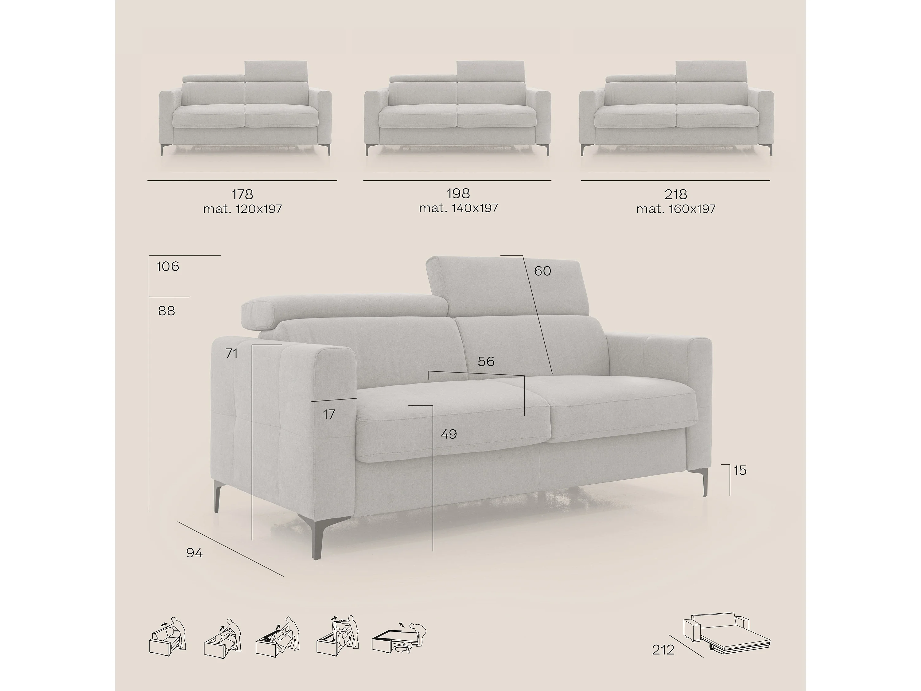 Gardenia Divano letto materasso alto 18 cm con poggiatesta reclinabili e rivestimento impermeabile T02 218 cm (mat. 160x197) azzurro