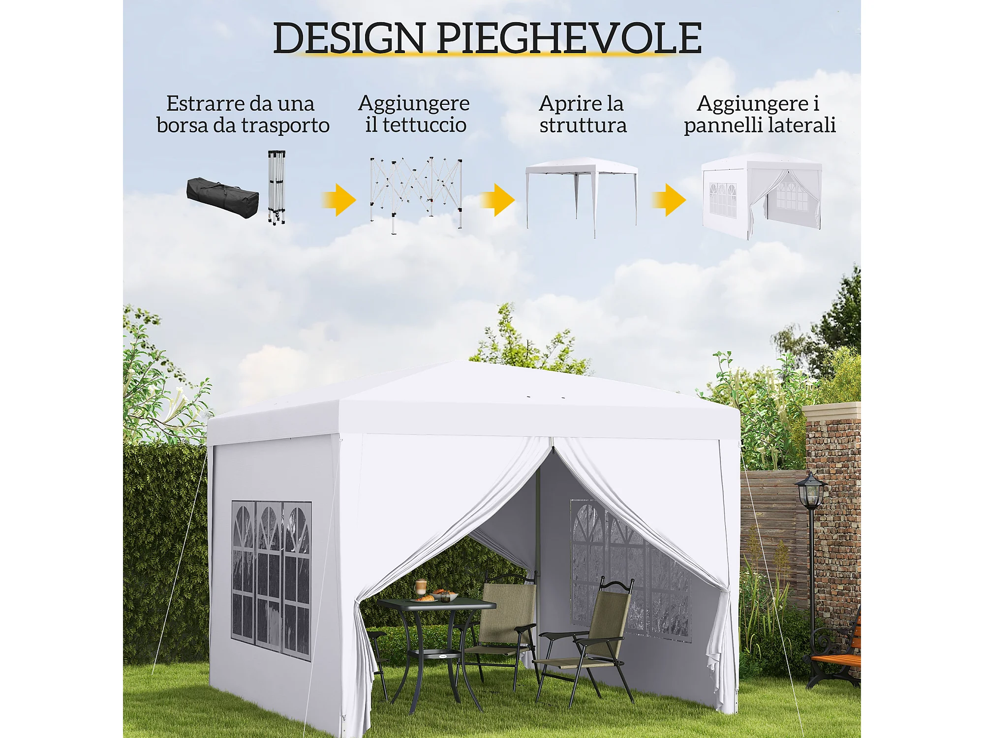 Gazebo 3x3 da giardino con pareti laterali in acciaio e tessuto bianco