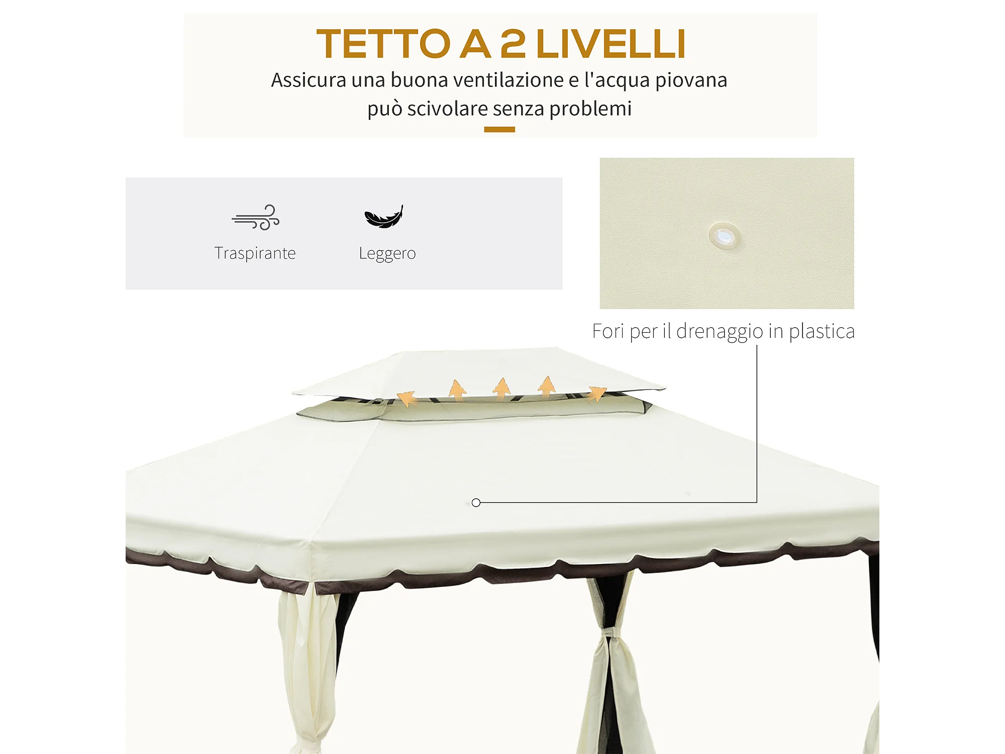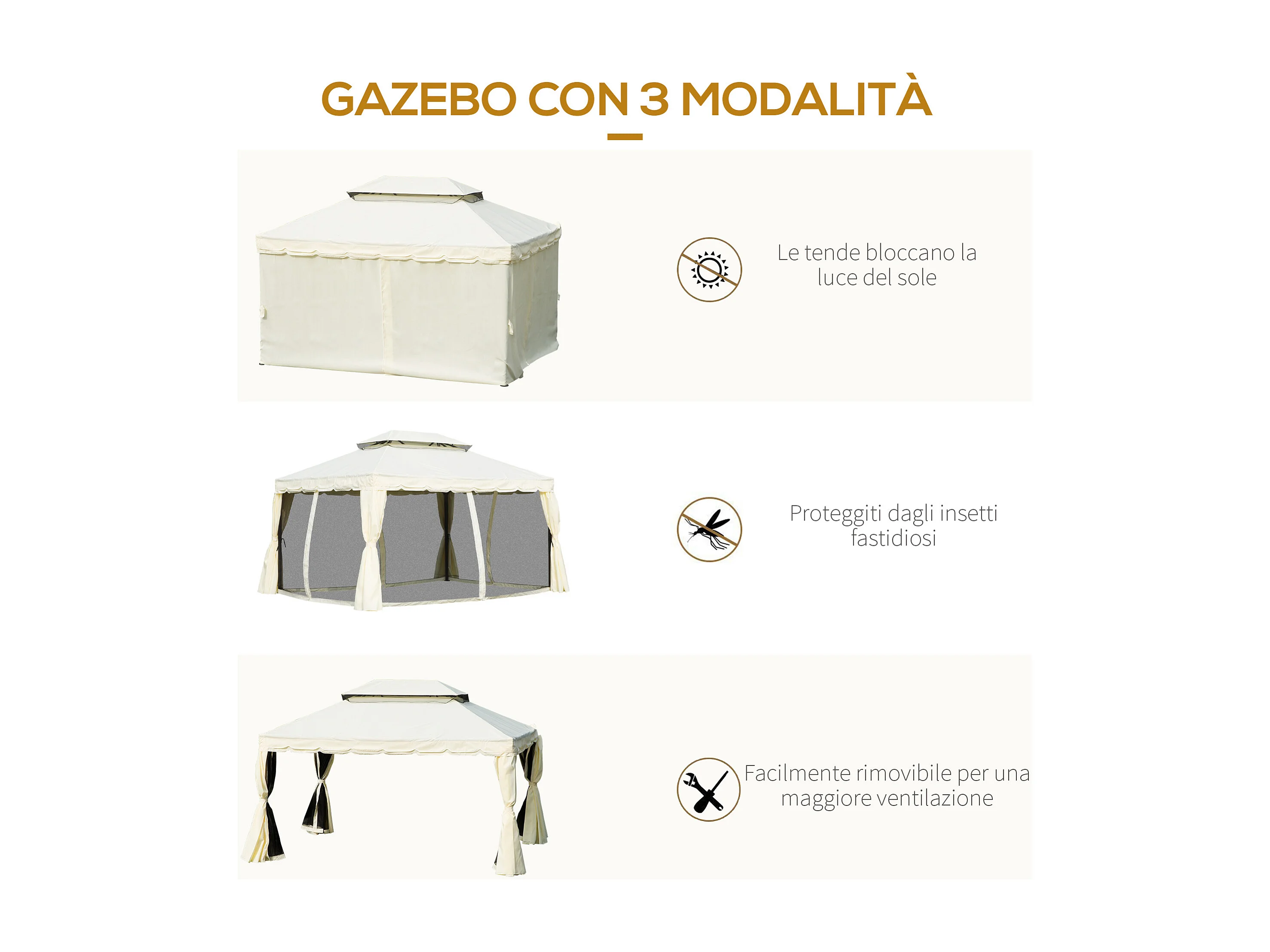 Gazebo da giardino 4x3 m con zanzariera e tende parasole crema