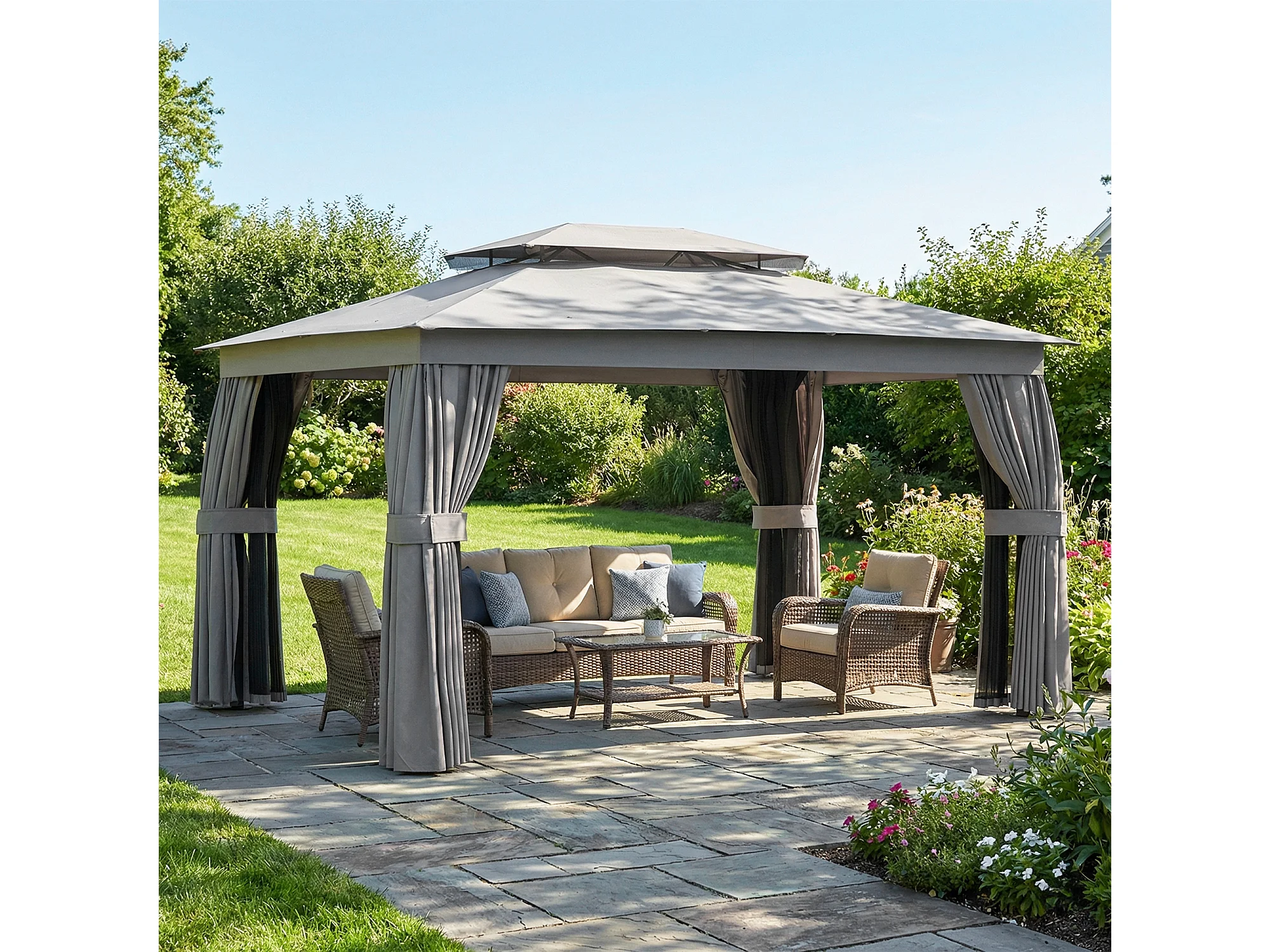 Gazebo da giardino a 2 livelli con zanzariere e tende grigio scuro