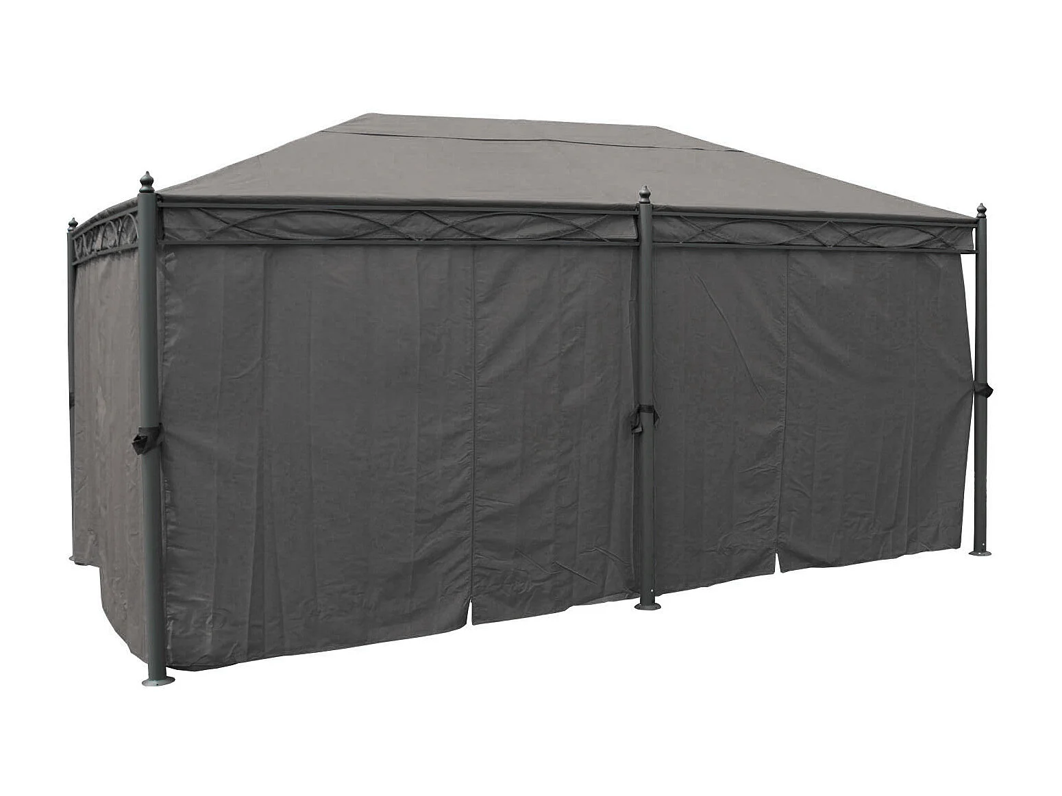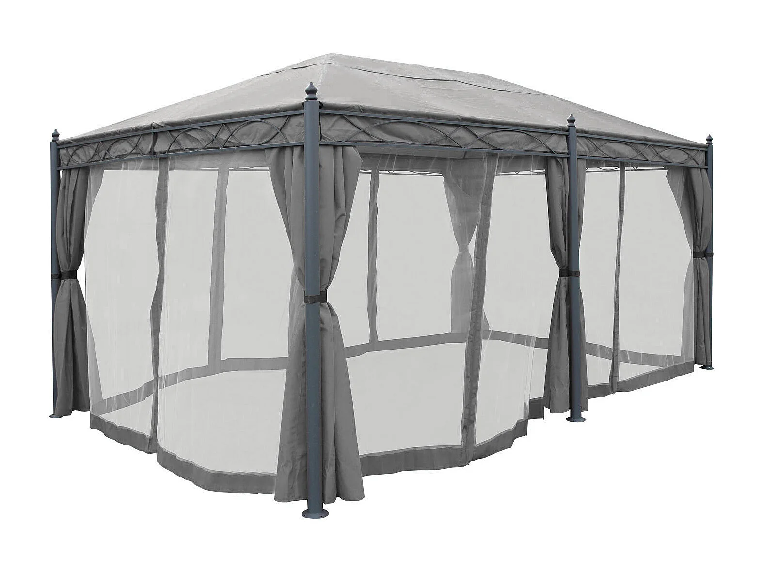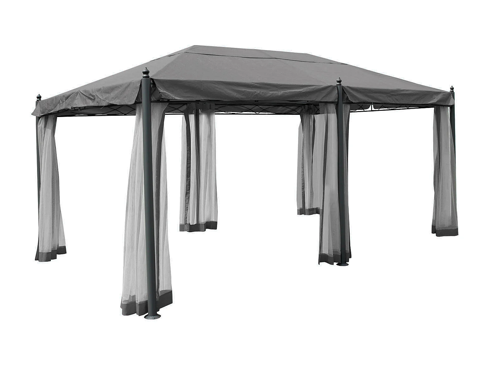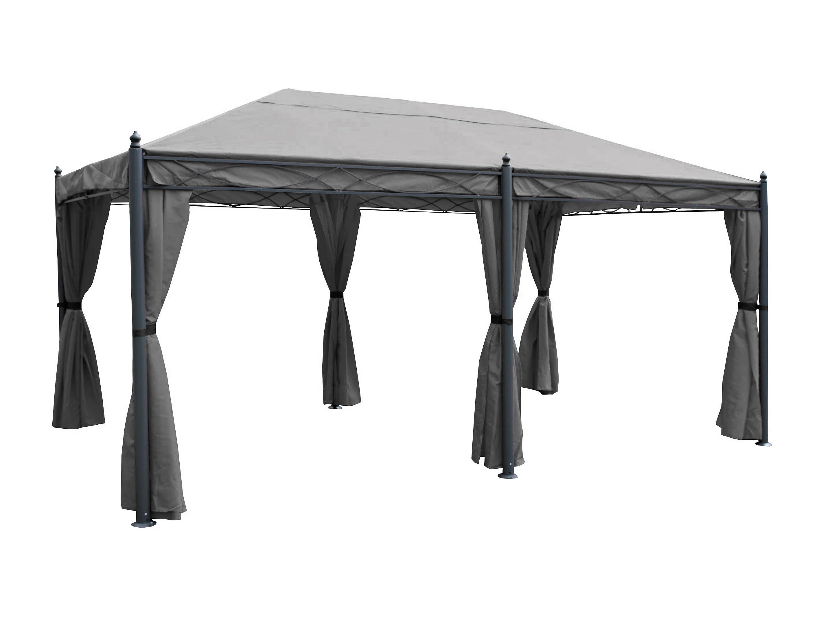Gazebo pergola baldacchino moderno elegante Cadice acciaio poliestere 5x3m grigio con zanzariere e tende