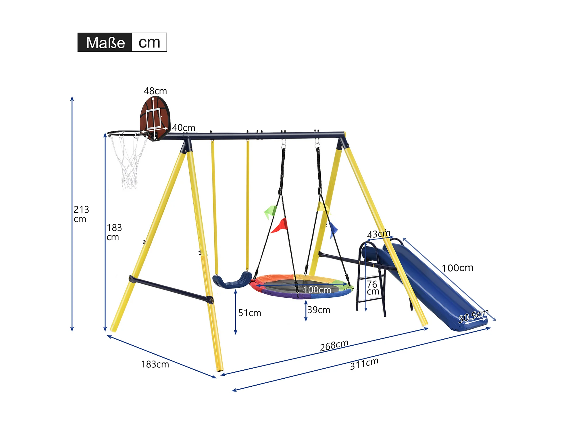 4 in 1 partite all'aperto, con 2 altalene, basket, cestino da basket e scivolo, 3-8 anni, 311x183x213cm