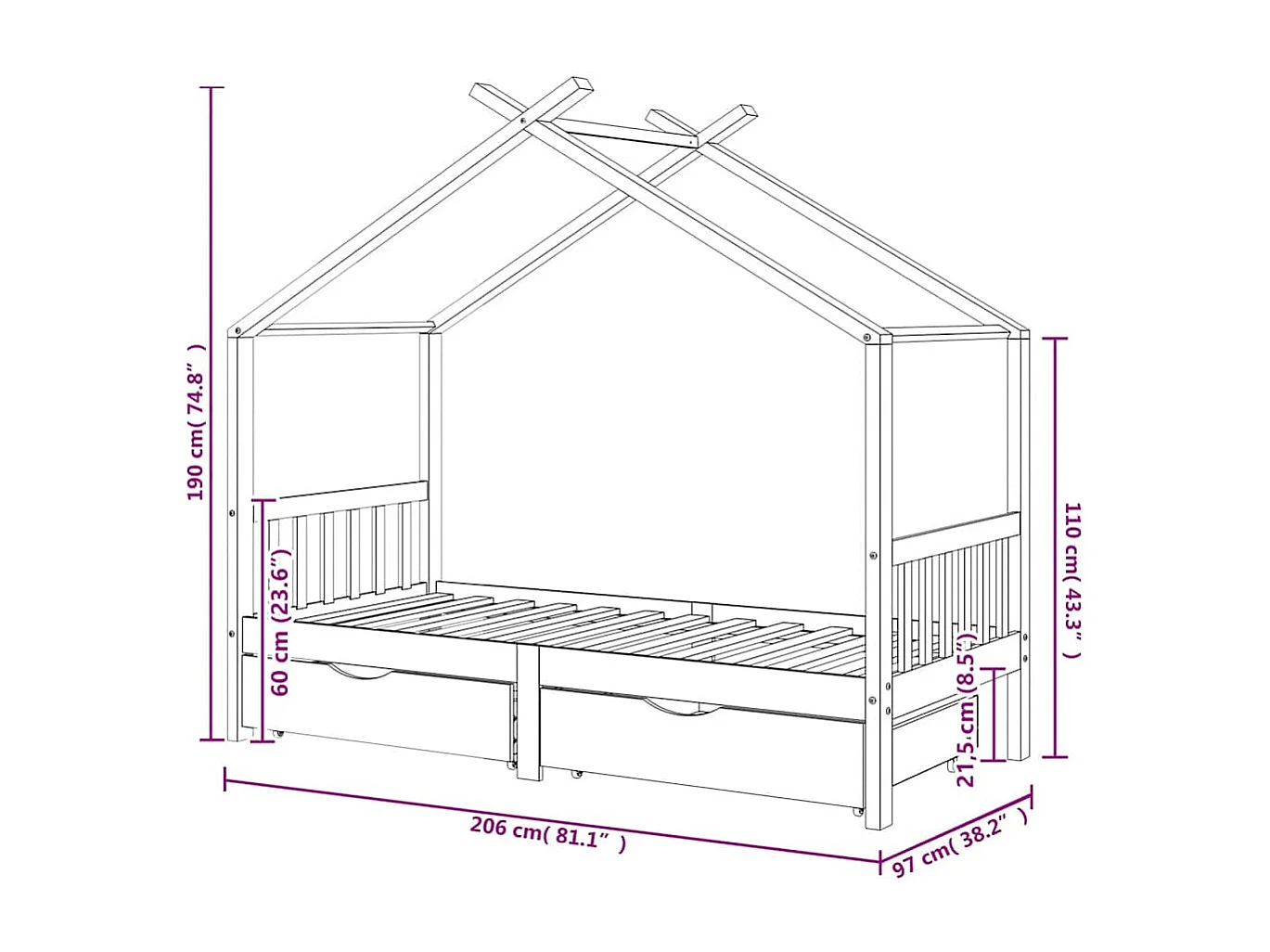 Giroletto Bambini Cassetti Grigio Scuro Pino Massello 90x200 cm