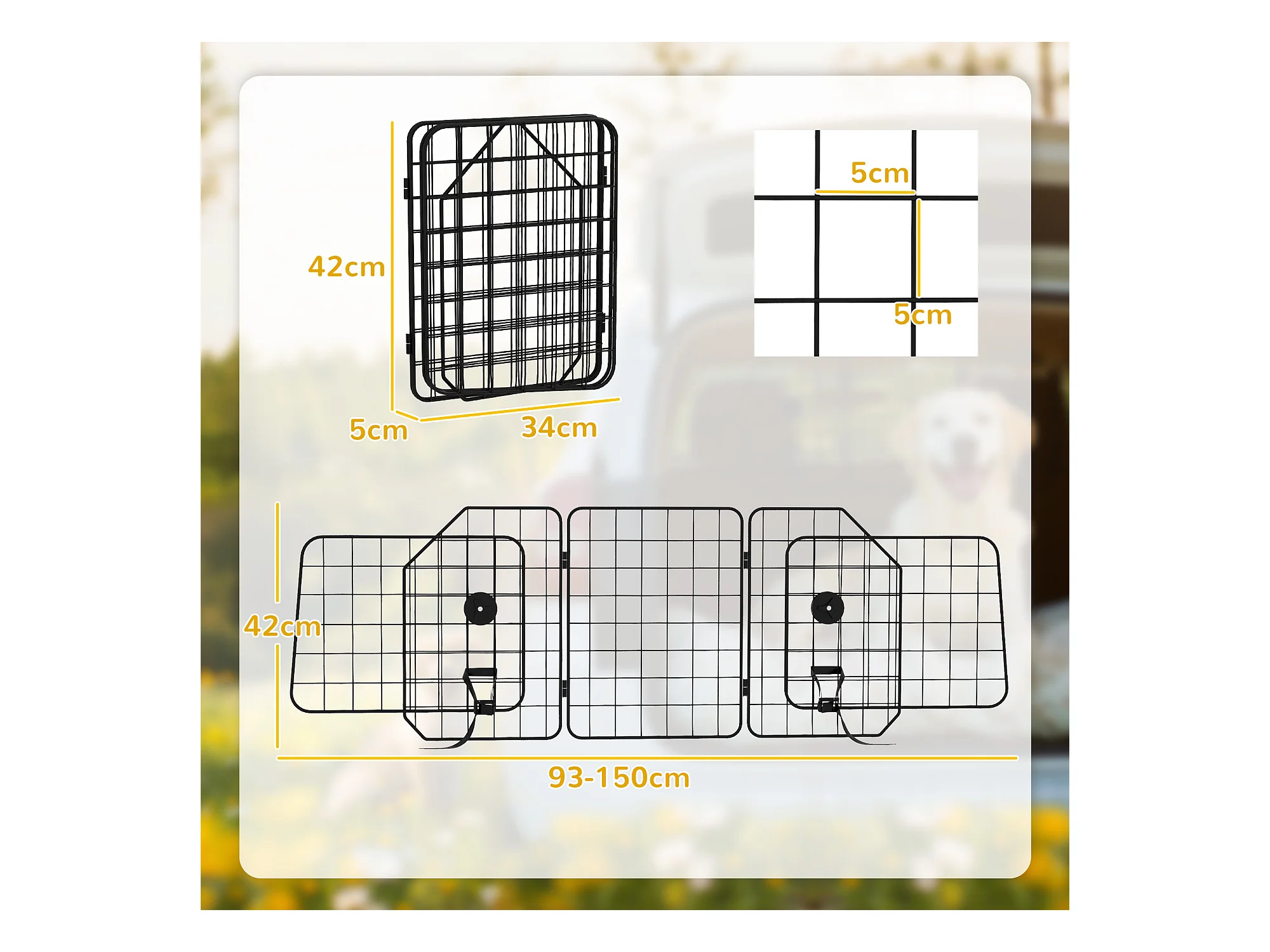 Griglia divisoria auto per cani regolabile e pieghevole 93-150x42cm