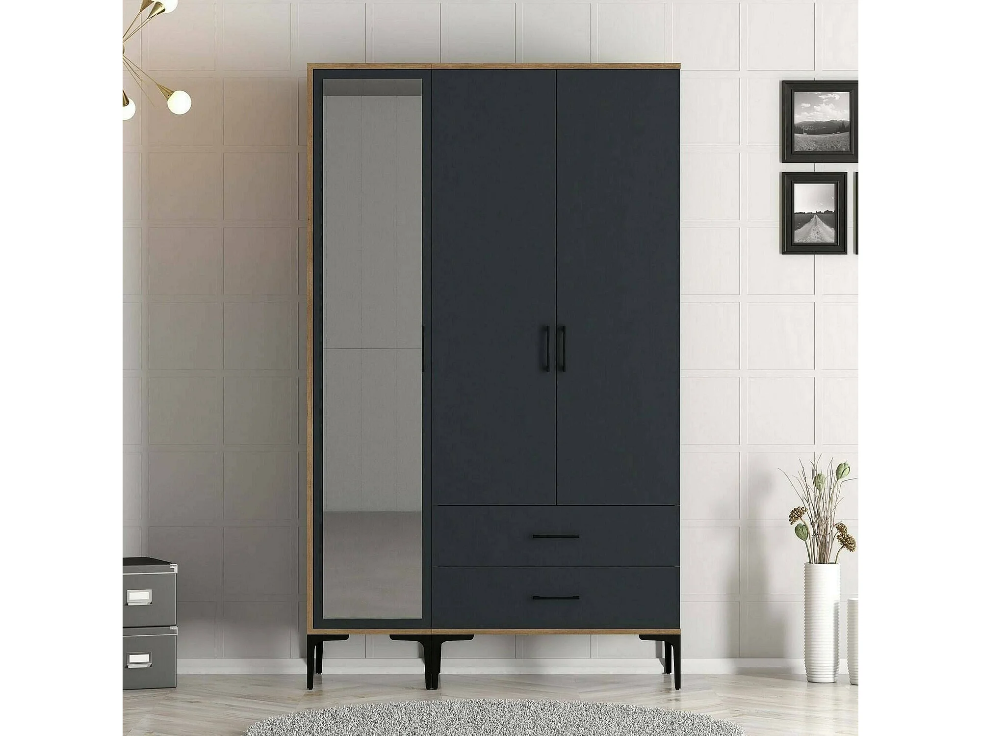 Guardaroba 3 Ante Petroleuse, 2 Cassetti, 47.5x120 cm Nero Antracite, Armadio Camera da Letto