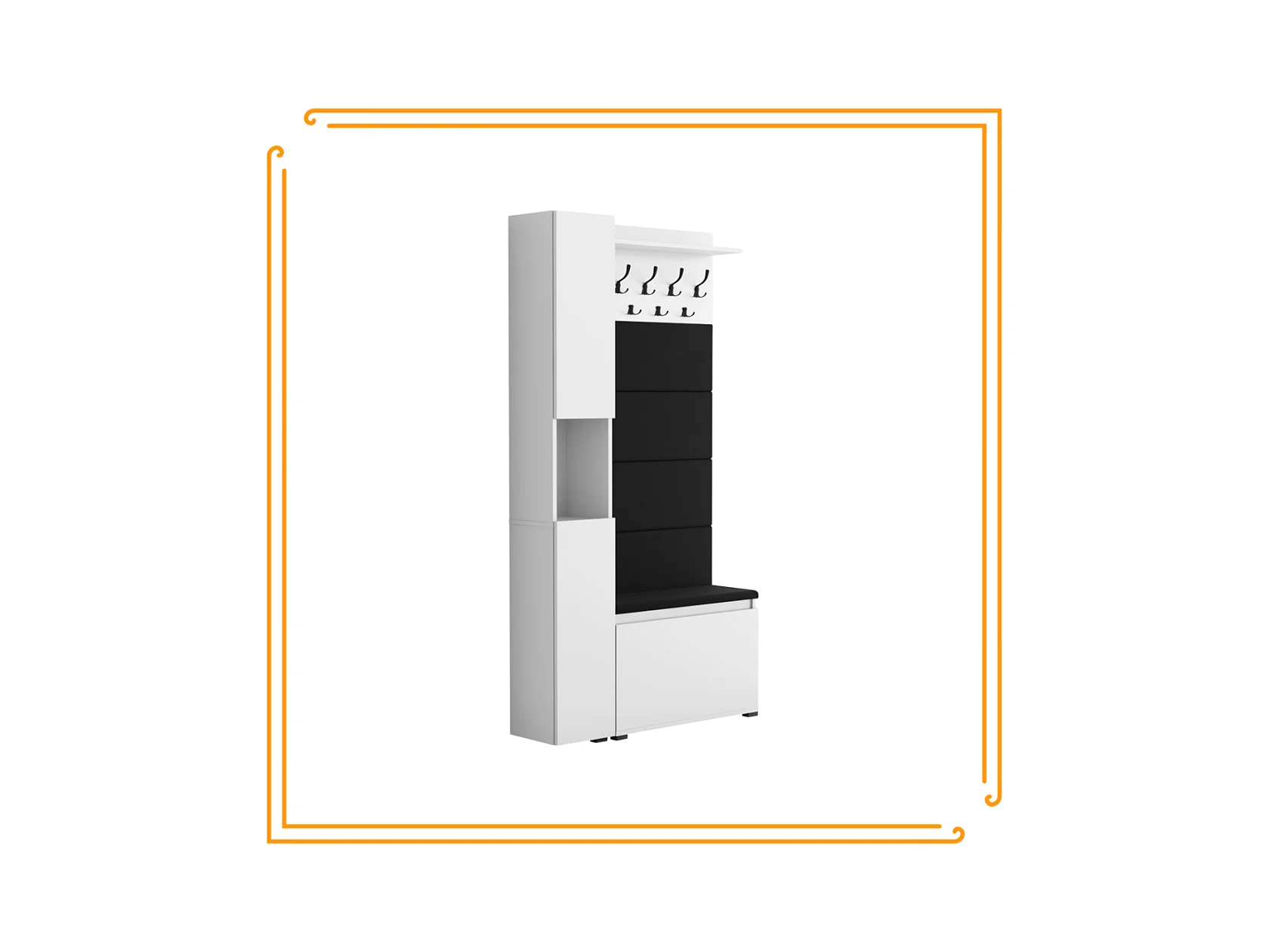 Guardaroba bianco - Appendiabiti con 3 ganci e 3 ante - panca contenitore e 3 vani portaoggetti aperti