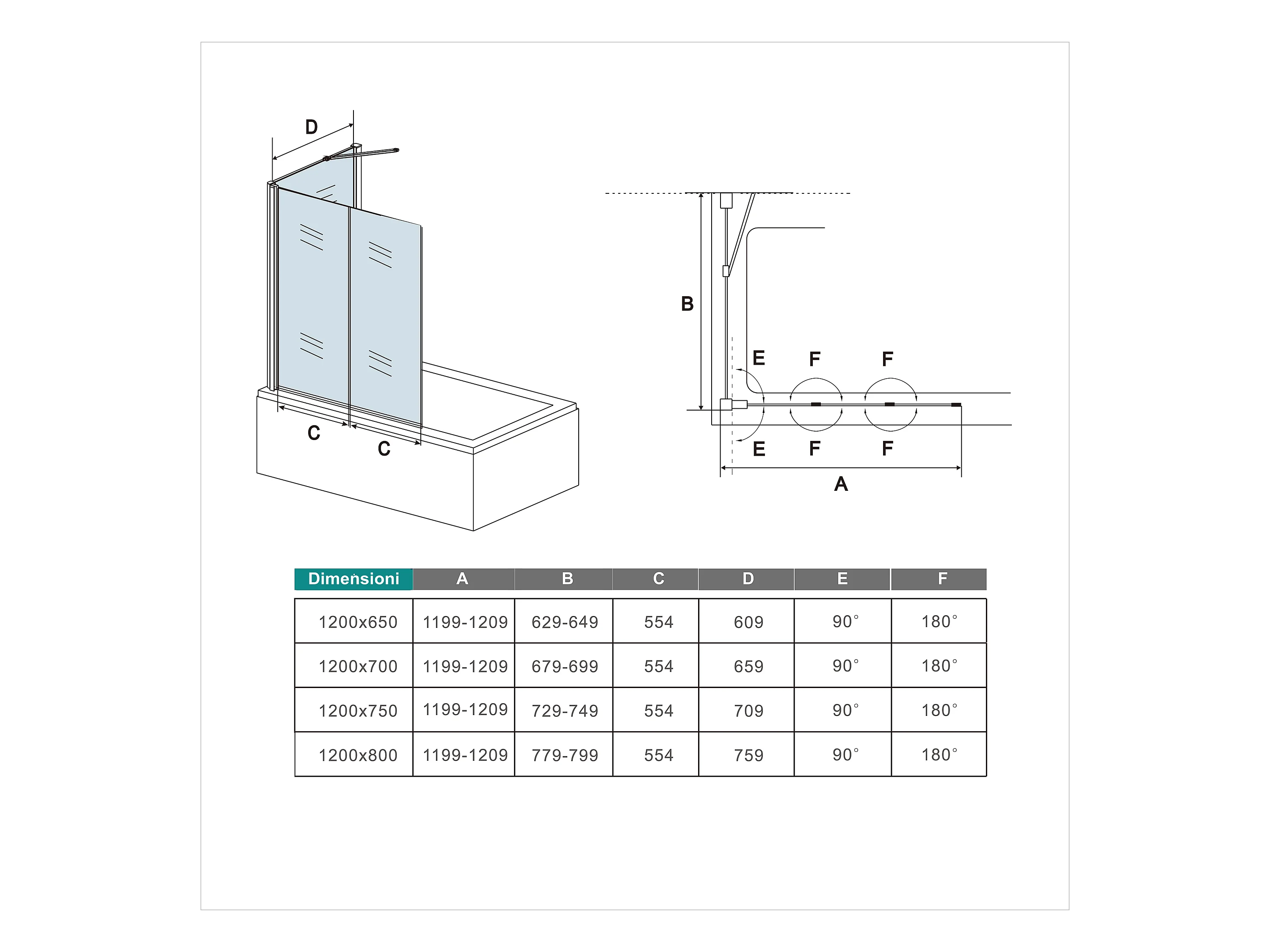 120x140 cm Parete Per Vasca Apribile 180 Gradi Montaggio Verso Destro Irreversibile in Vetro Temperato 6 mm Anticalcare Fascia Centrale Opaca