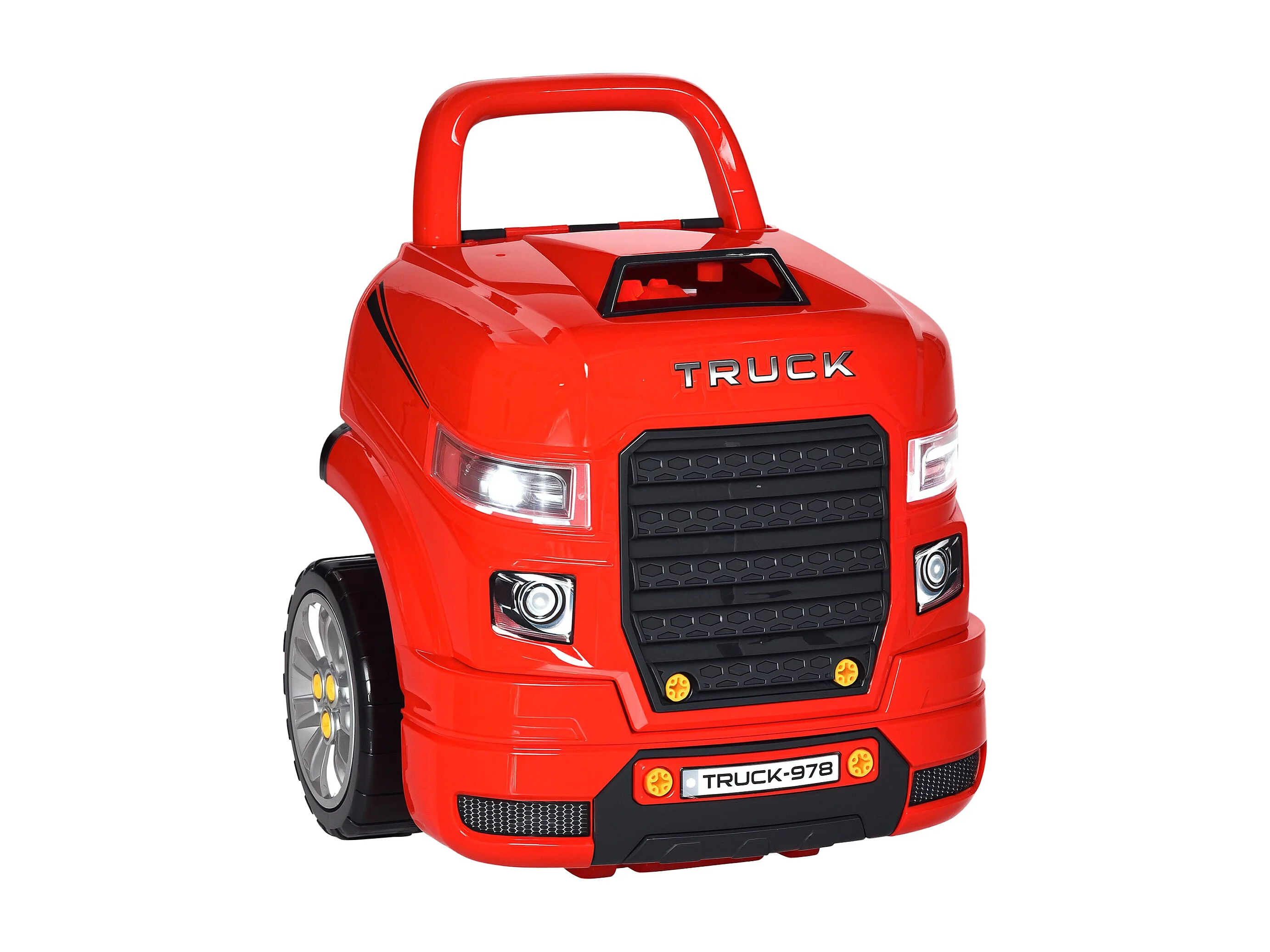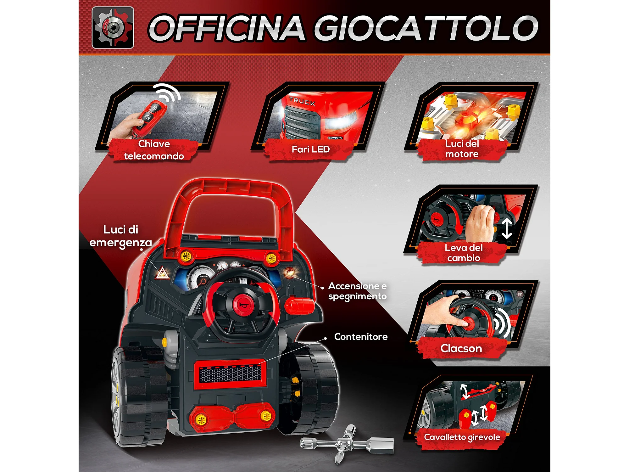 HOMCOM Officina Camion Giocattolo con Motore e 61 Accessori per Bambini 3-5 Anni, Ruote e Maniglia, 40x39x47cm, Rosso