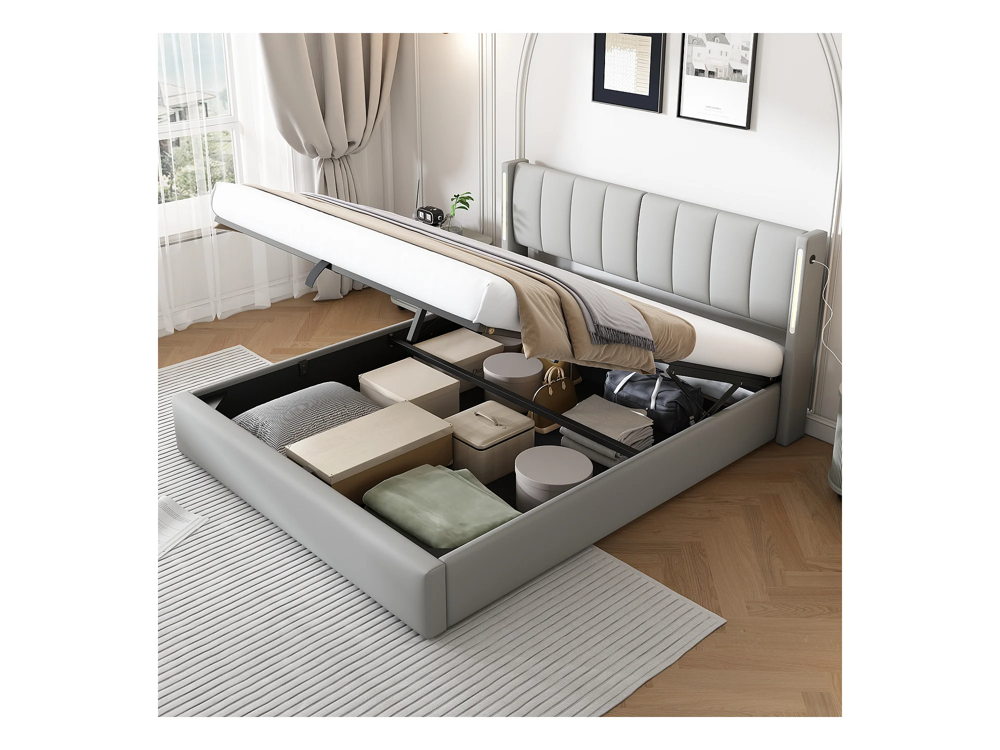 Illuminato doppio 160x200 grigio PU con LED, cassetto idraulico, testa regolabile e USB