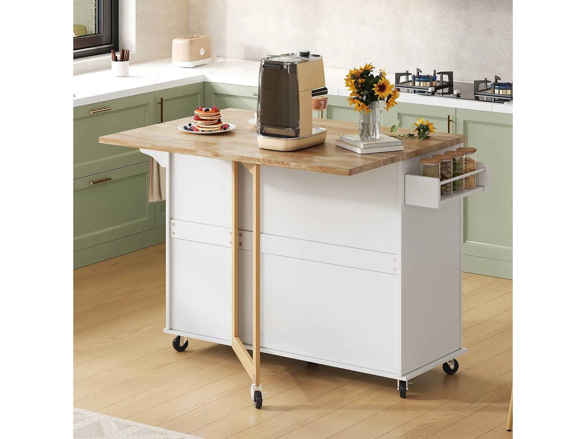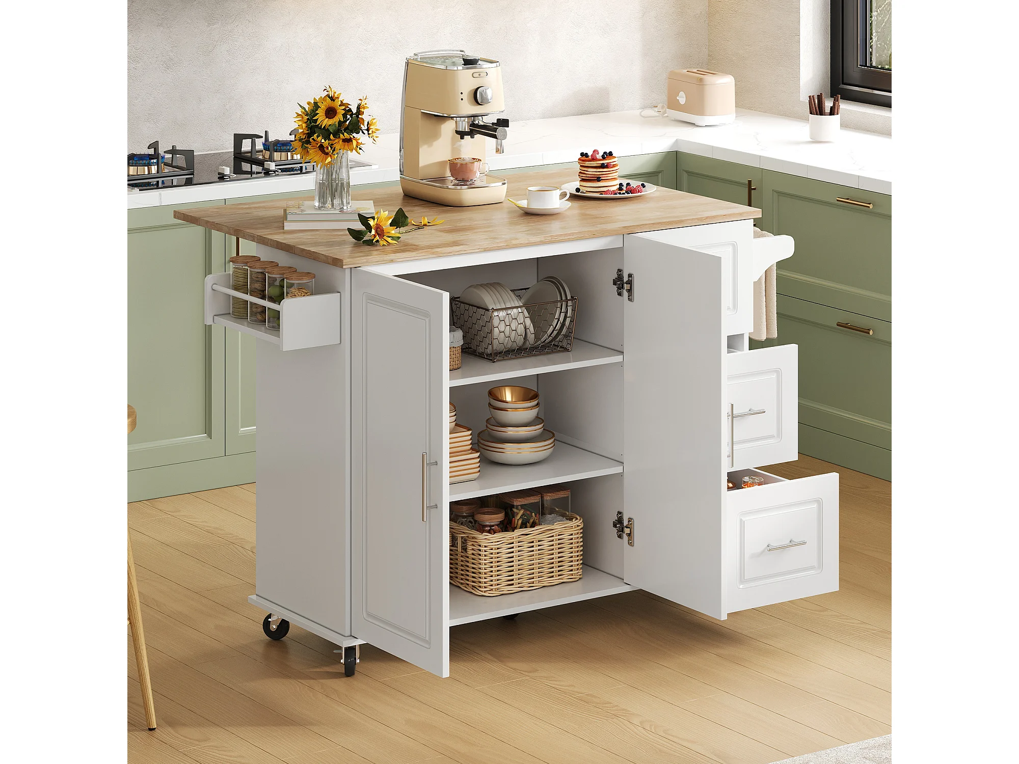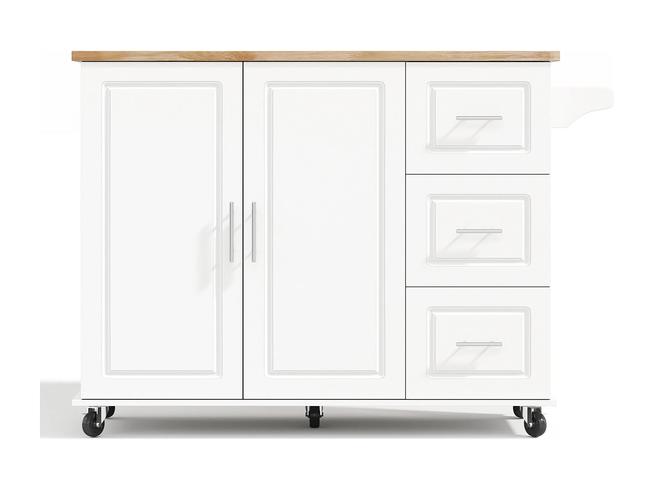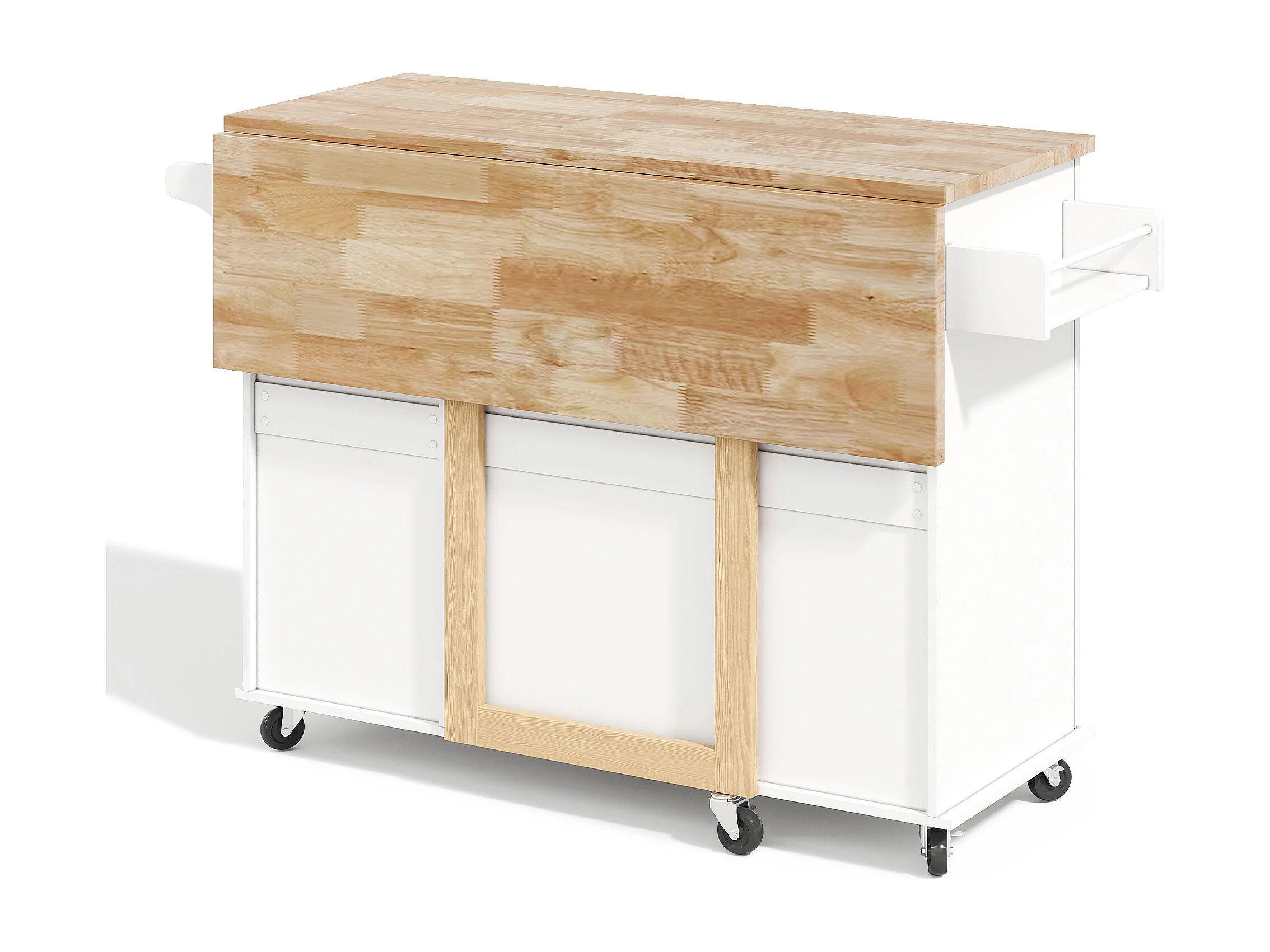 Isola centrale per cucina mobile - piano estensibile - con porta asciugamani - con rotelle - con 3 cassetti e 2 ante - MDF - Bianco
