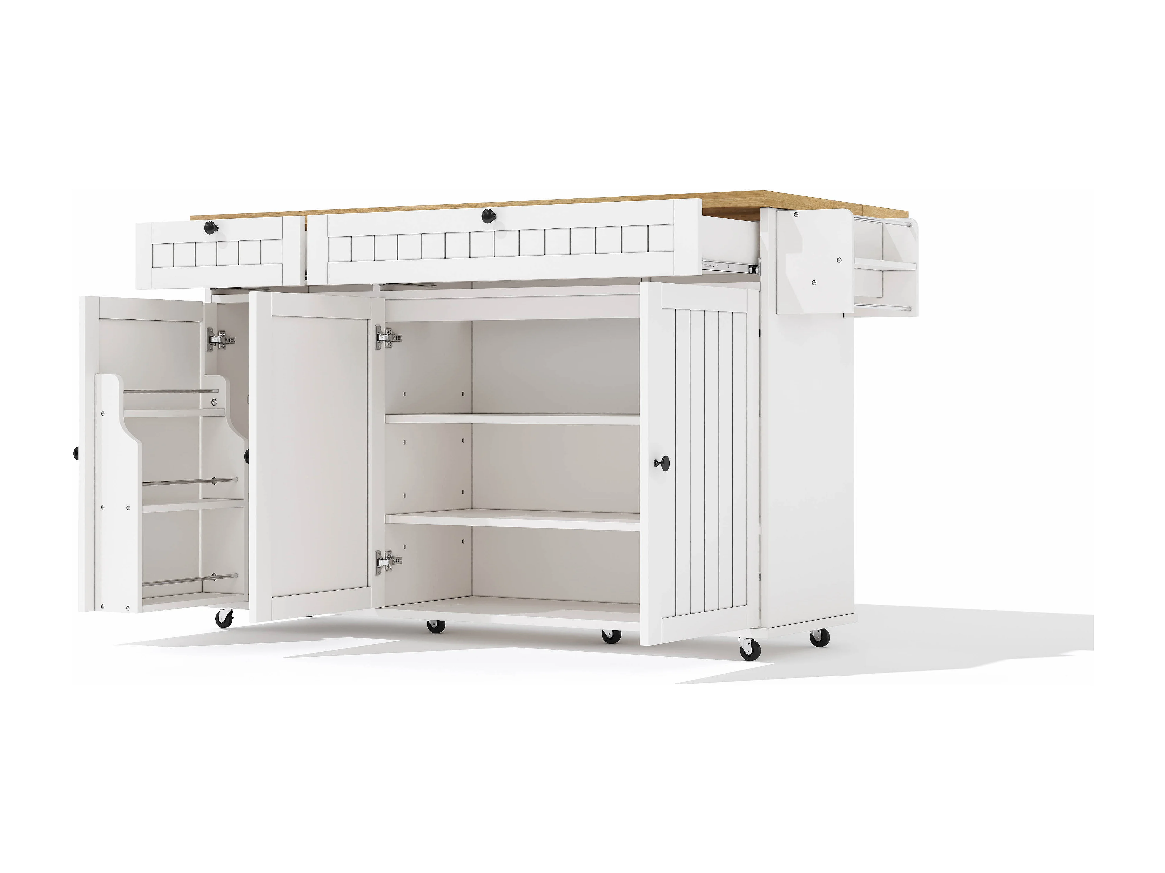 Isola da cucina bianca a 3 ante e 3 cassetti - Carrello da cucina con portasciugamani e vano portaoggetti aperto - piano superiore pieghevole