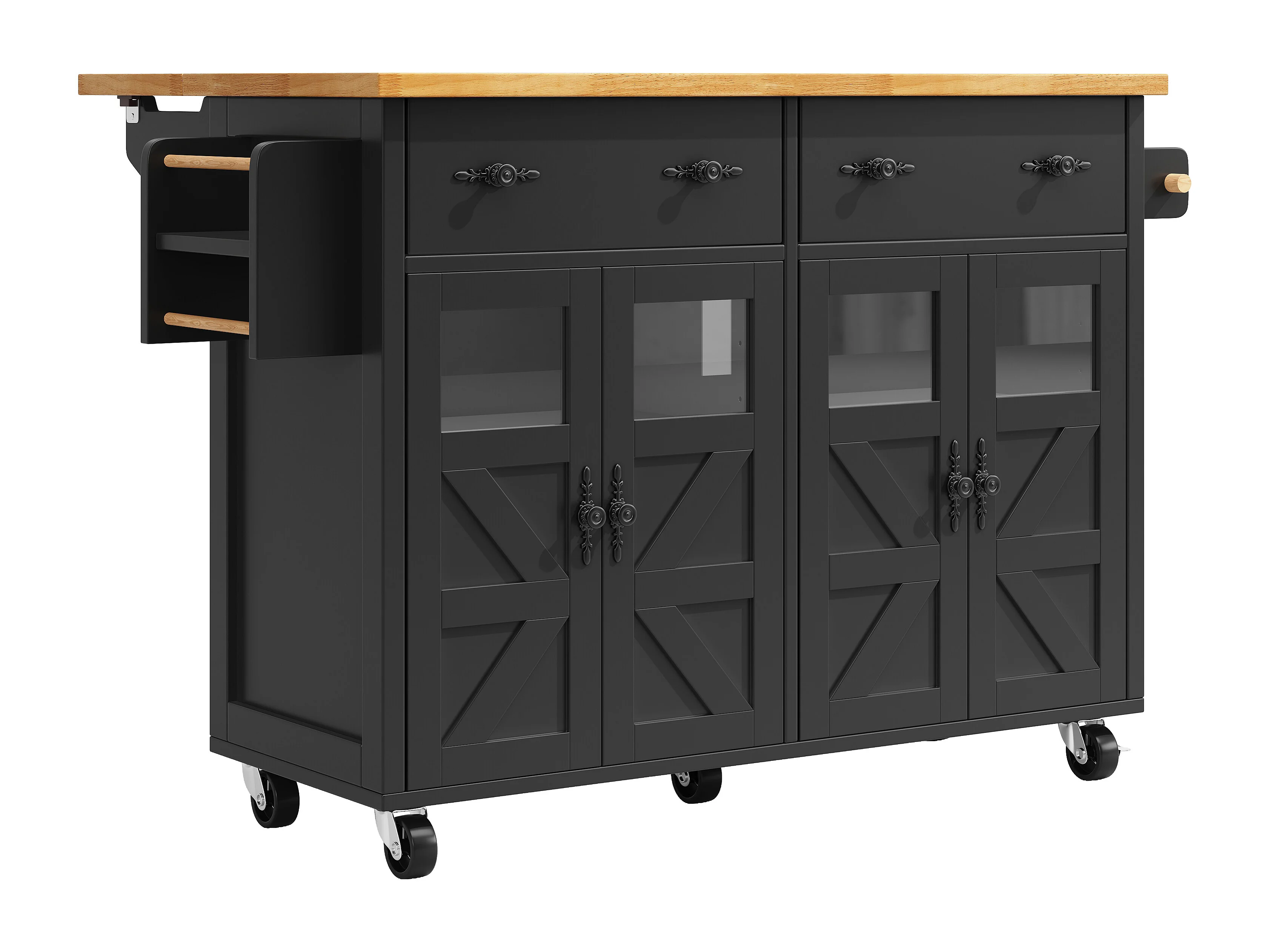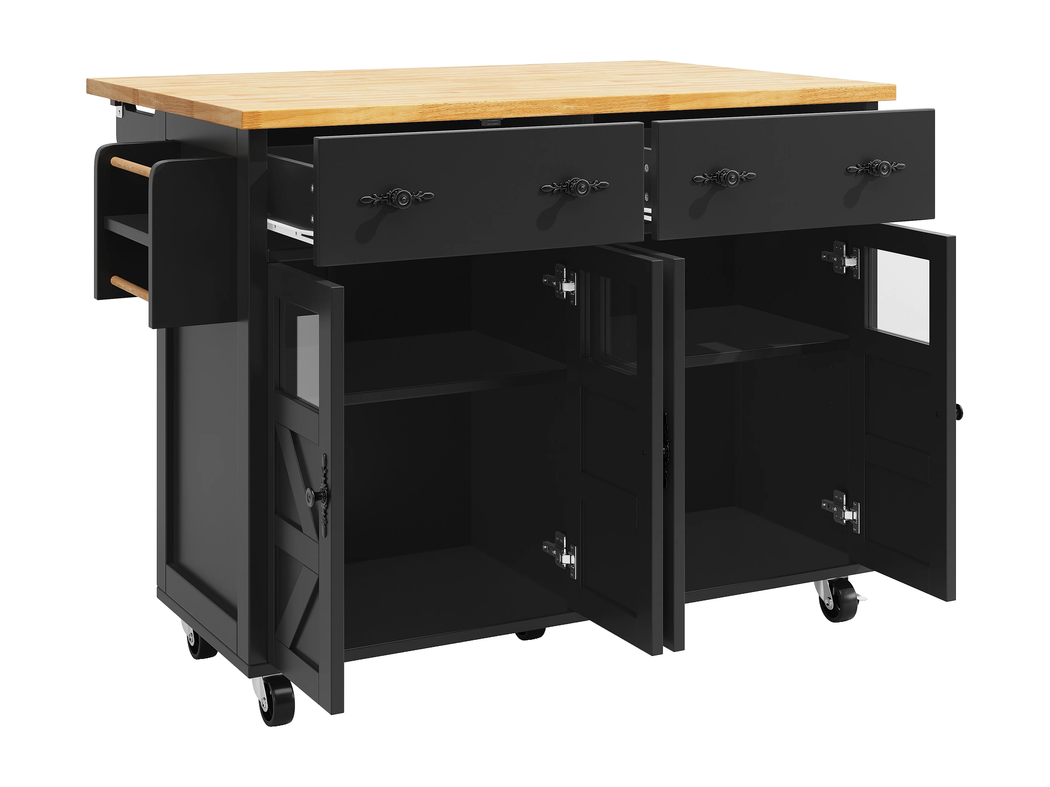 Isola cucina con ruote, 4 ante e 2 cassetti - Nero e naturale