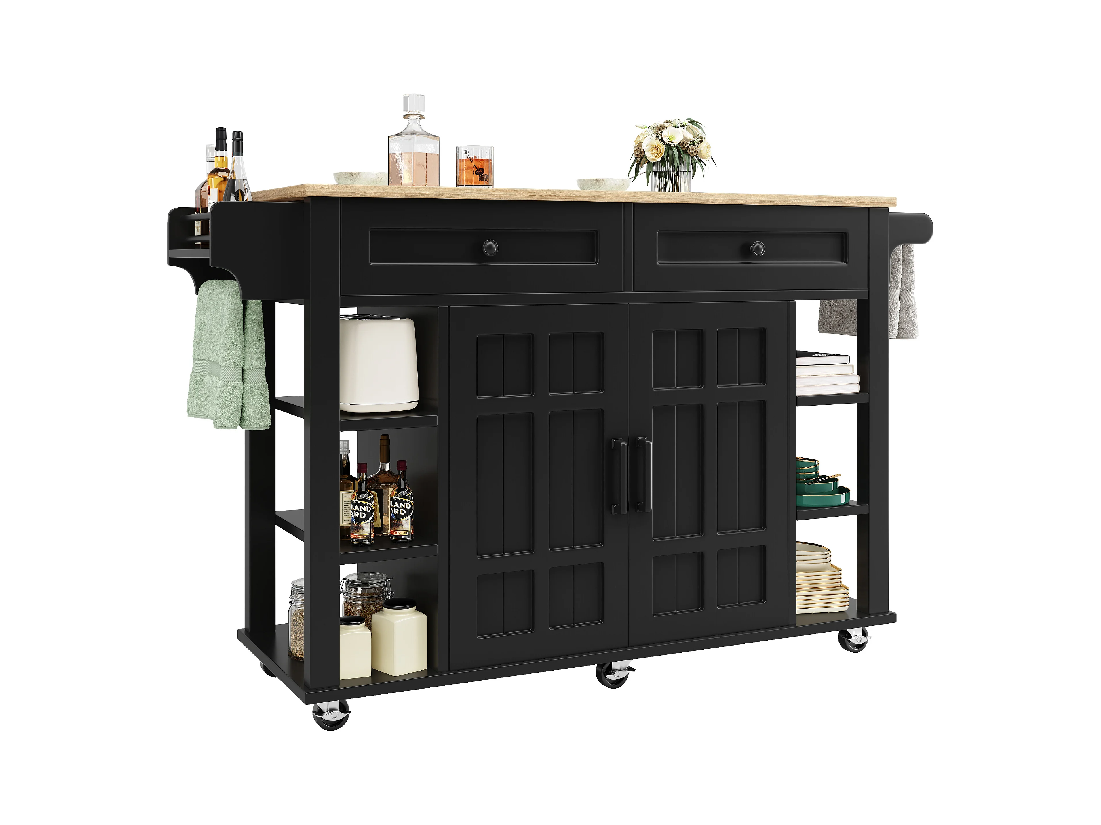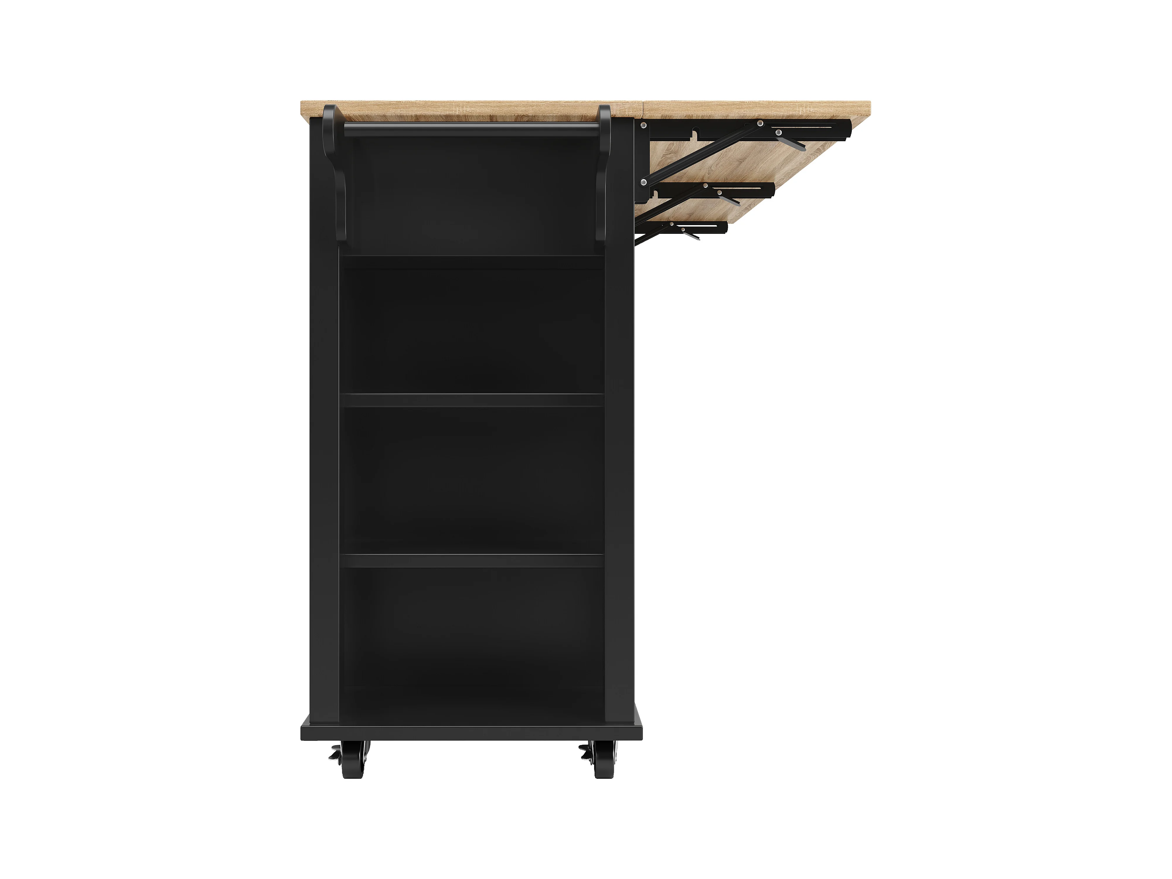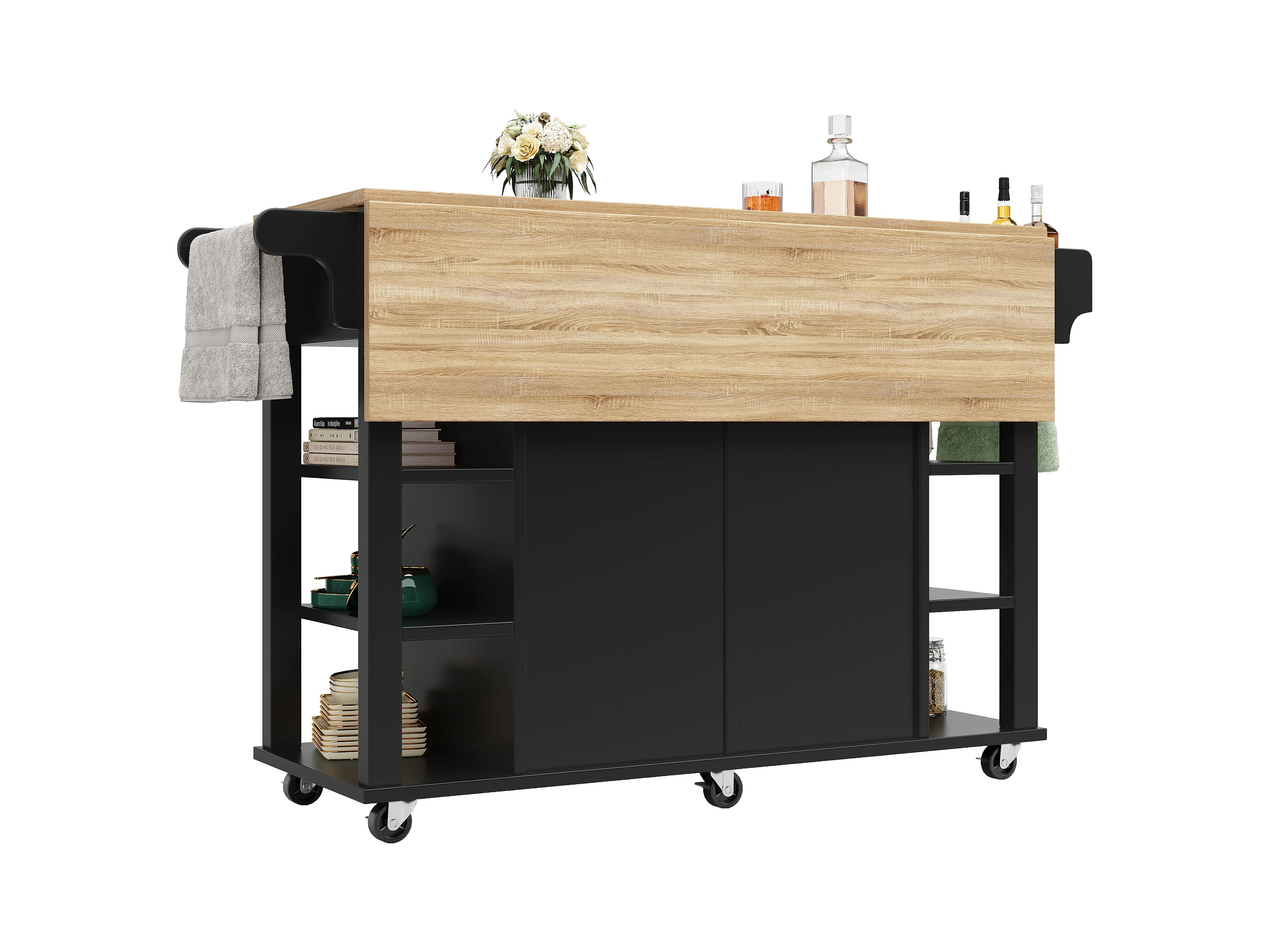 Isola cucina mobile - piano estendibile - 2 cassetti e 2 ante - con portasciugamani - MDF - nero + naturale