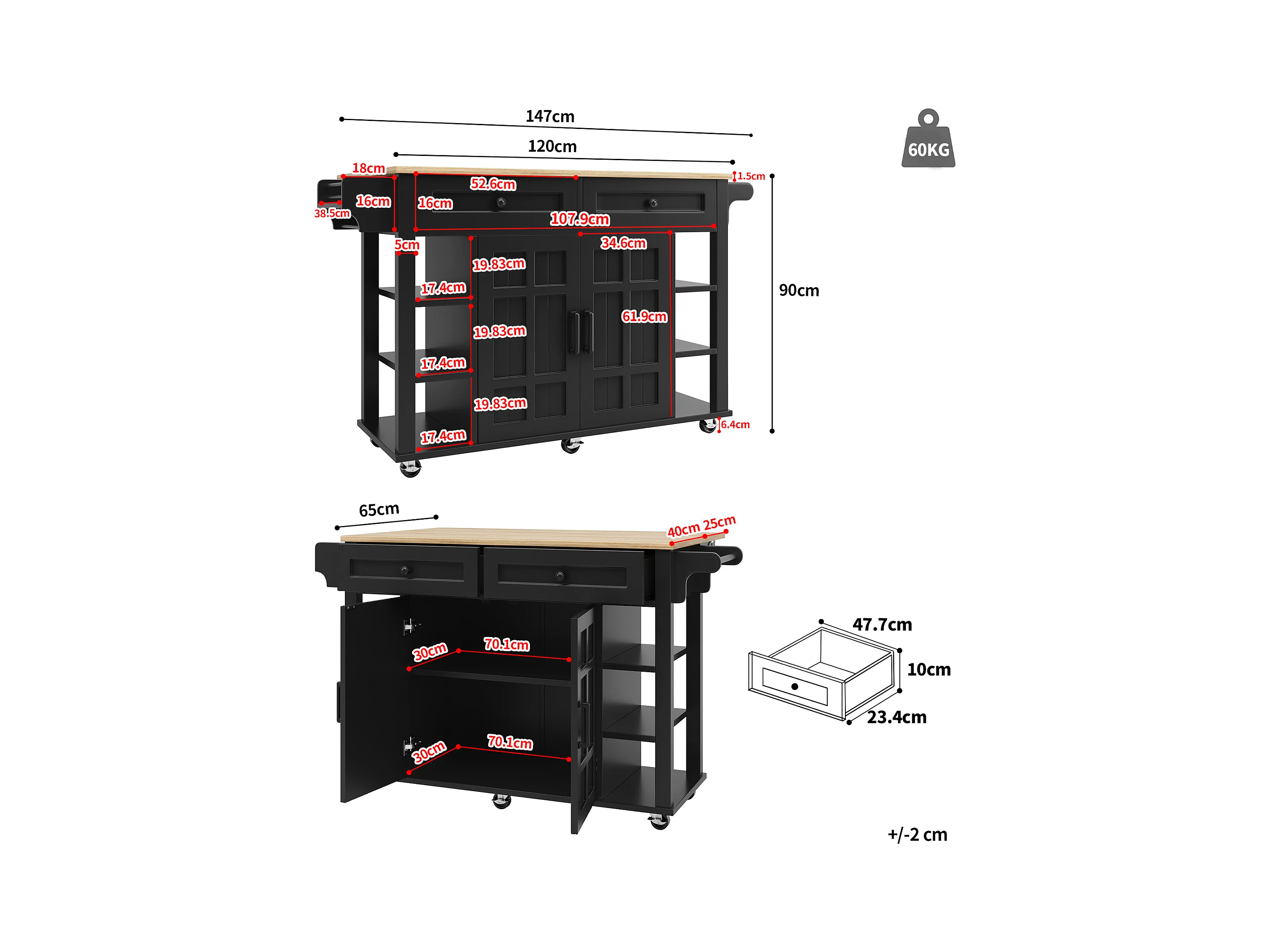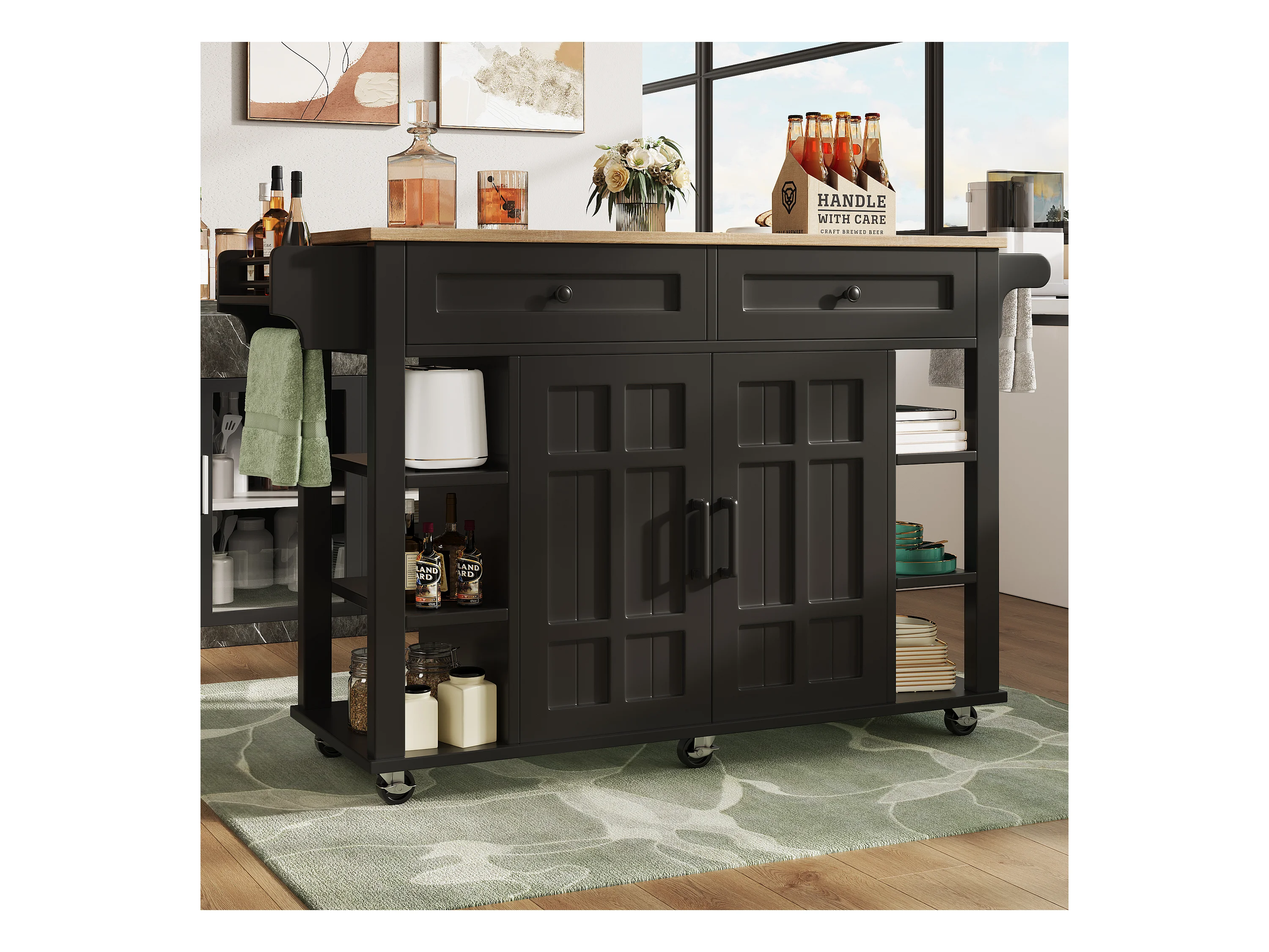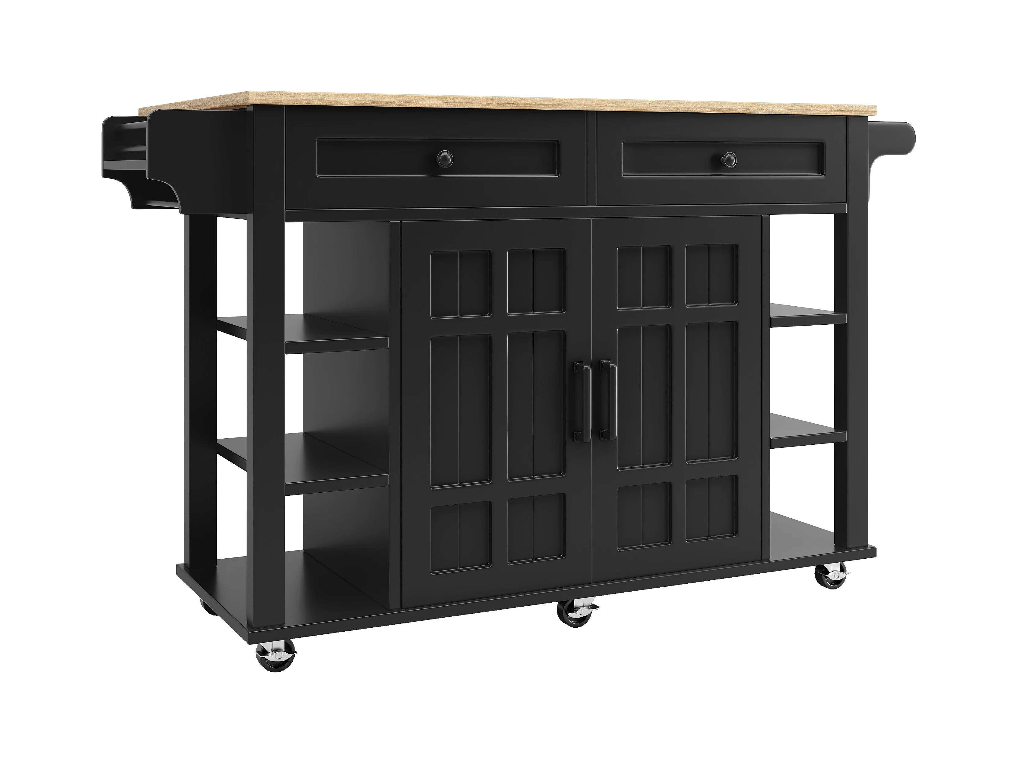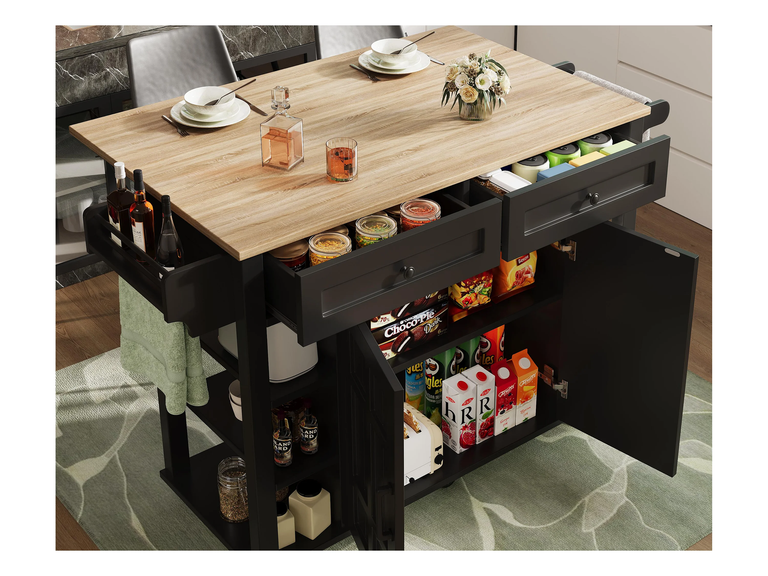 Isola cucina mobile - piano estendibile - 2 cassetti e 2 ante - con portasciugamani - MDF - nero + naturale