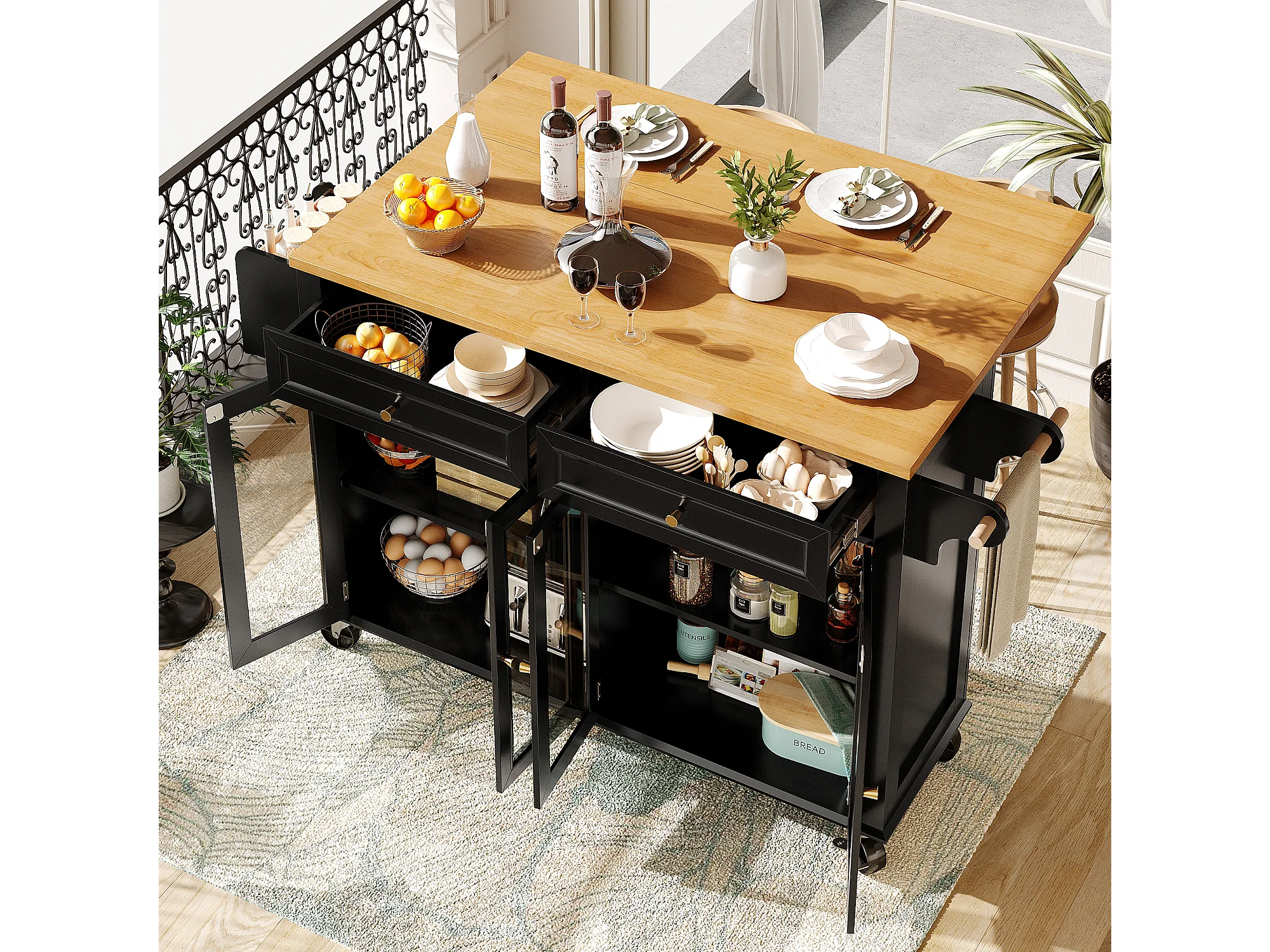 Isola cucina nera - Carrello cucina con 2 cassetti e 4 ante in vetro - porta spezie e porta asciugamani