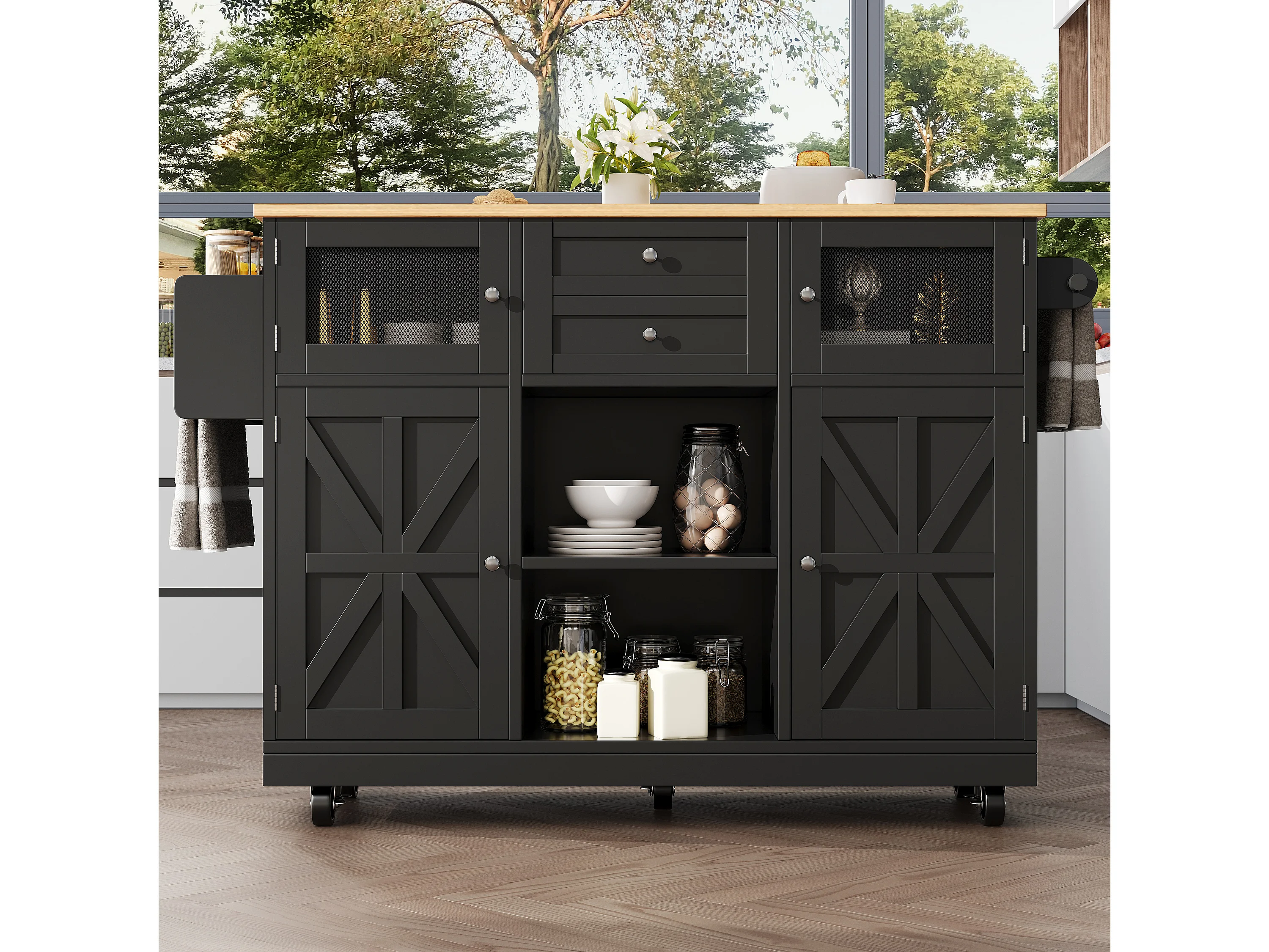 Isola cucina nera - Carrello cucina con 2 cassetti e 4 ante in vetro - porta spezie e porta asciugamani