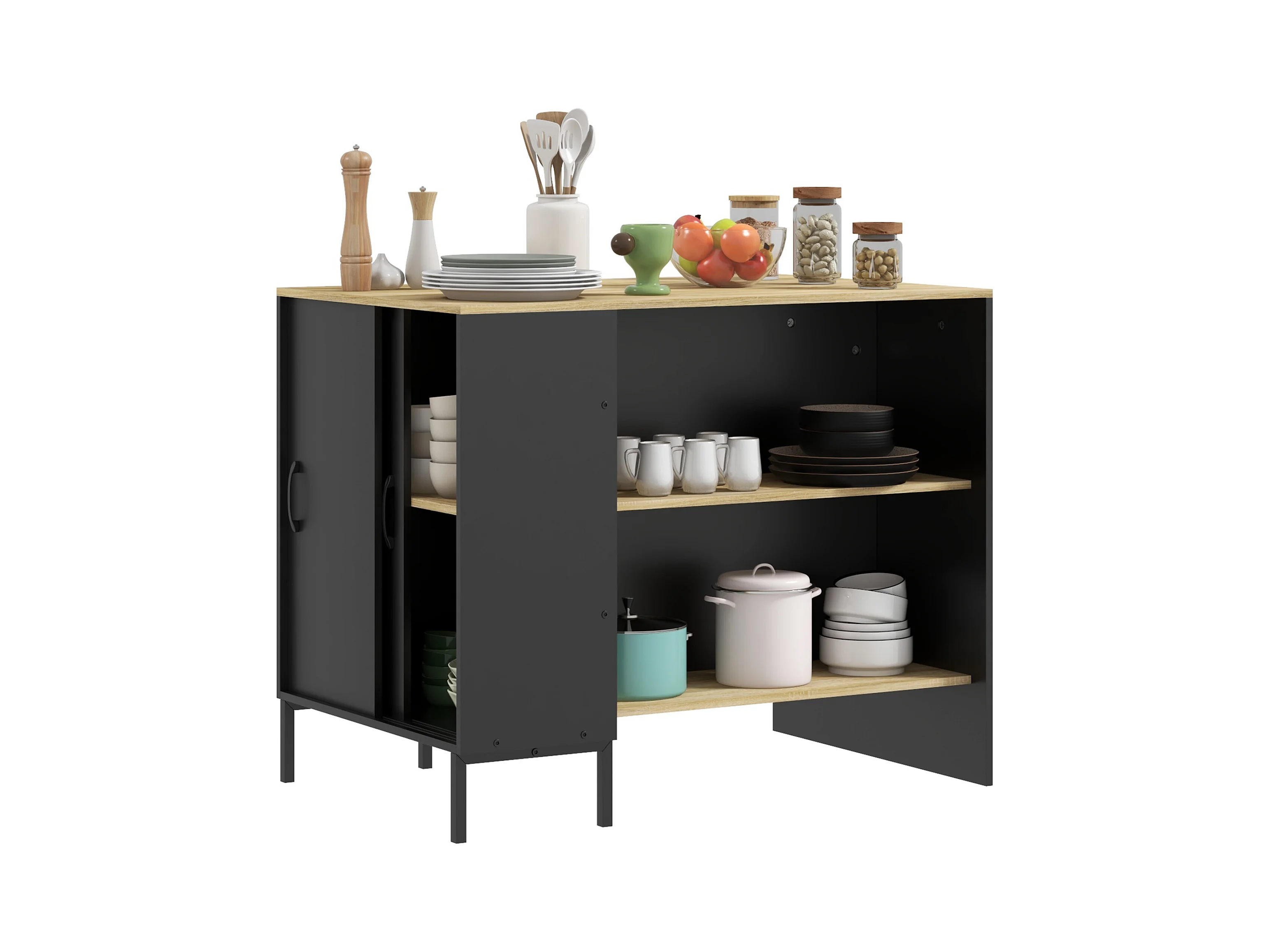 Isola da cucina con ripiani e armadietto con anta scorrevole nero