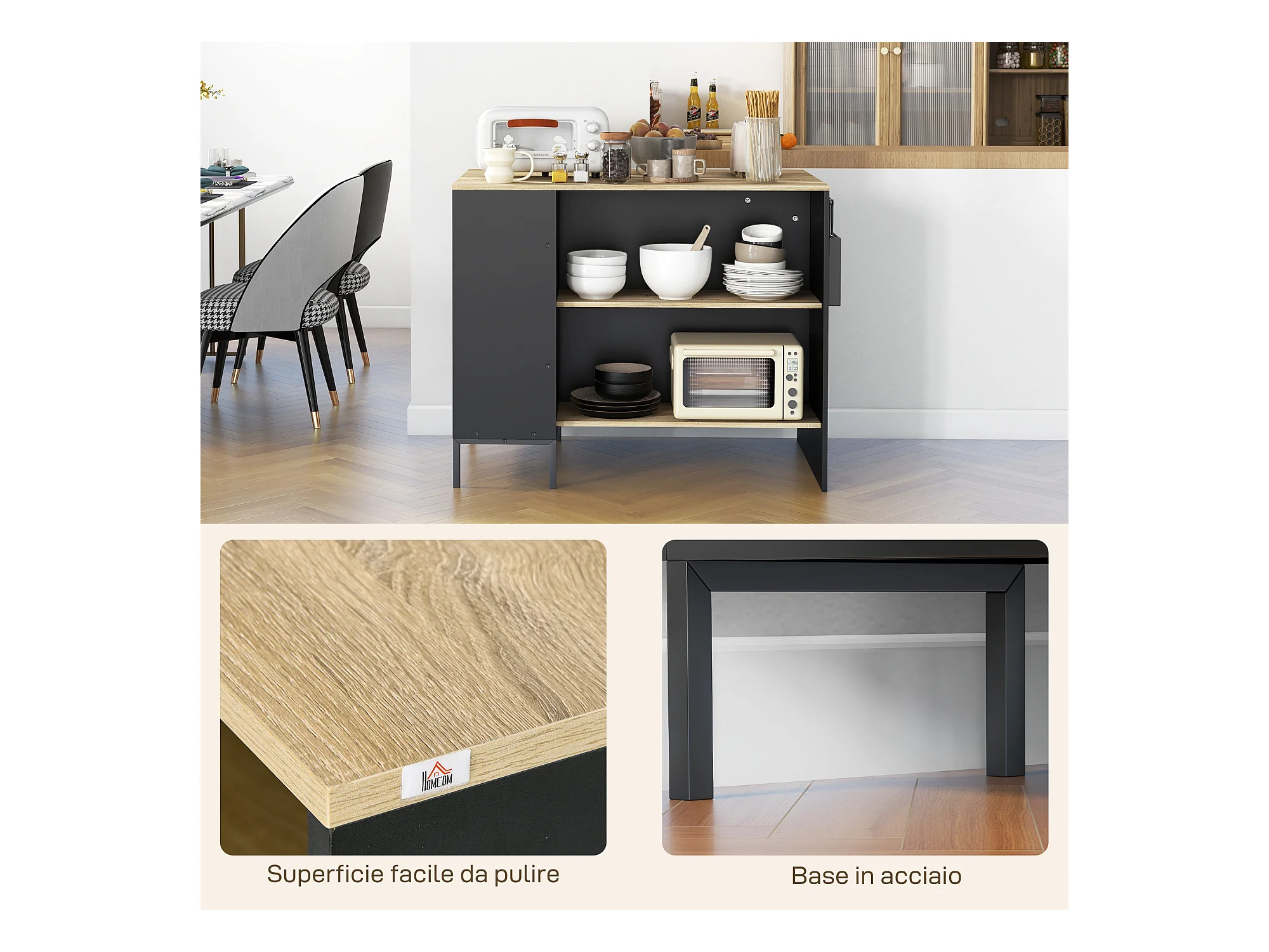 Isola per cucina con 2 ripiani e 2 armadietti in mdf nero e rovere