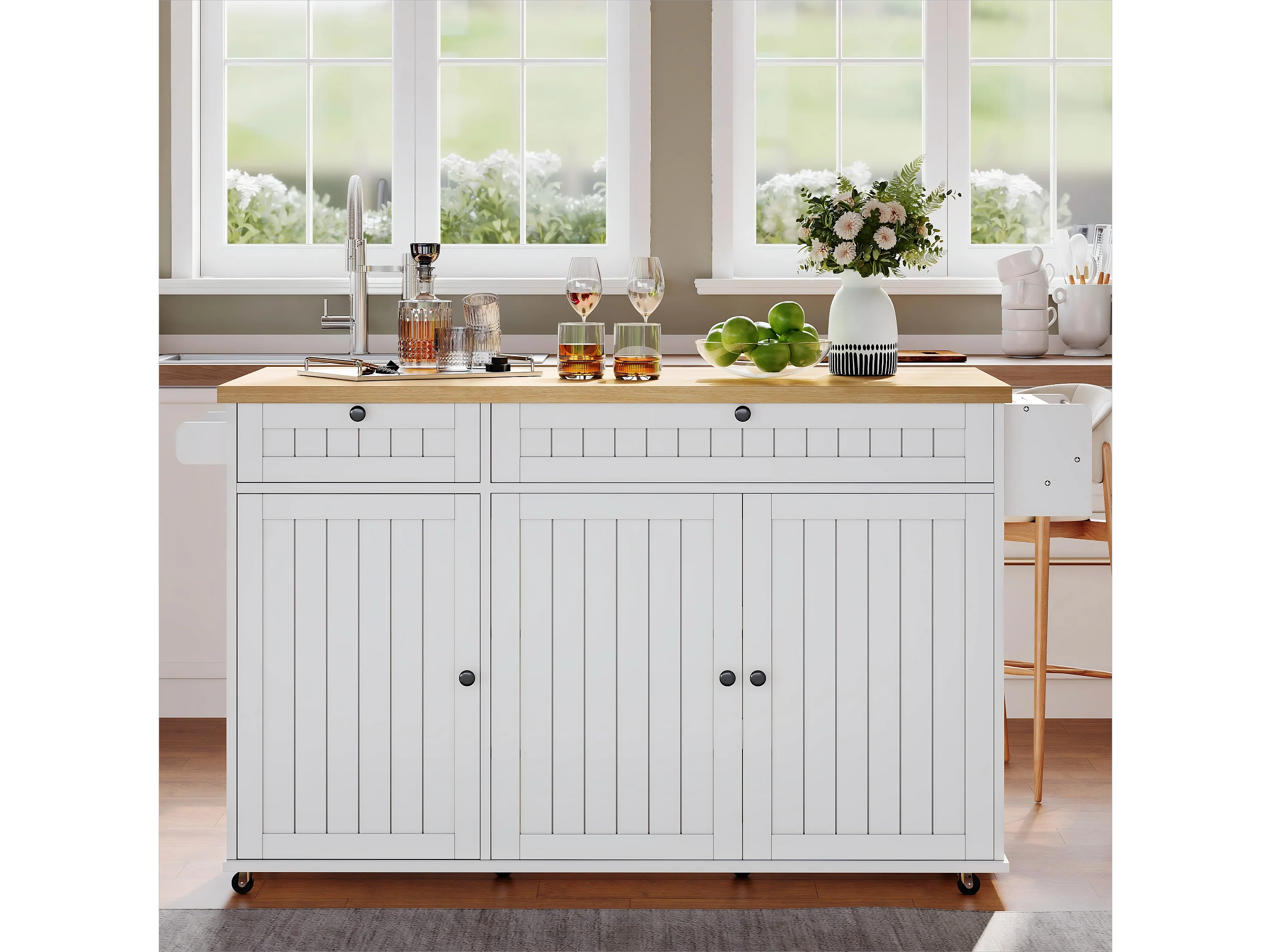 Isola da cucina mobile - piano estensibile - con rotelle bloccabili - con 2 cassetti e 3 ante - MDF - Bianco