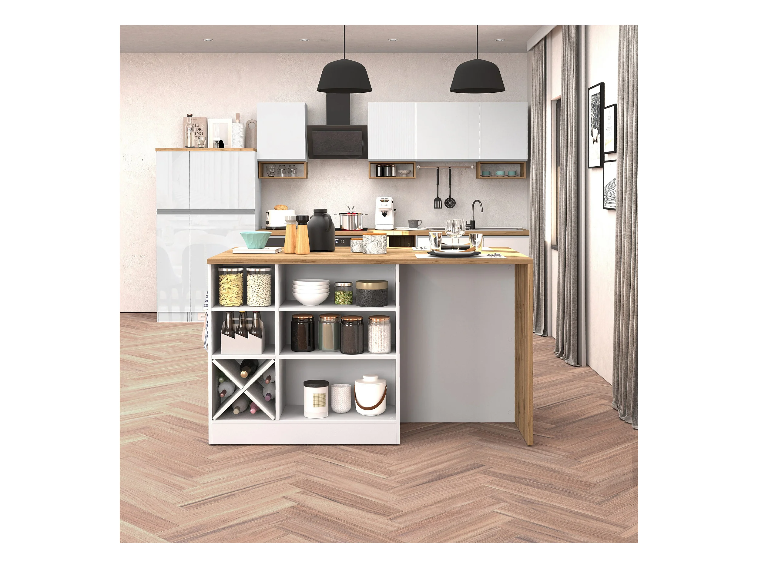 Isola centrale mobile con piano in legno e 3 ante con texture, porta spezie - Bianco