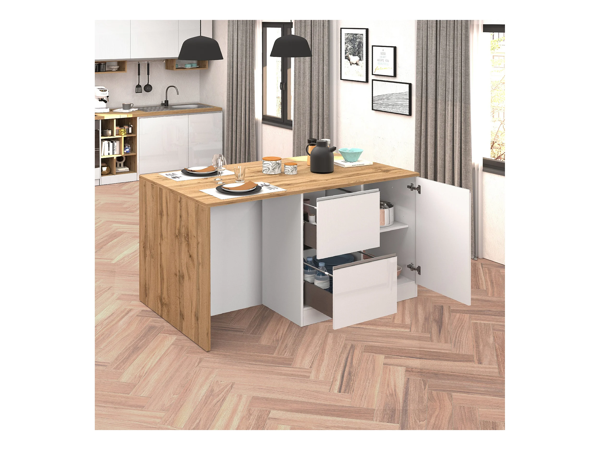 Isola centrale mobile con piano pieghevole, 3 ante e 2 cassetti portaoggetti - Bianco