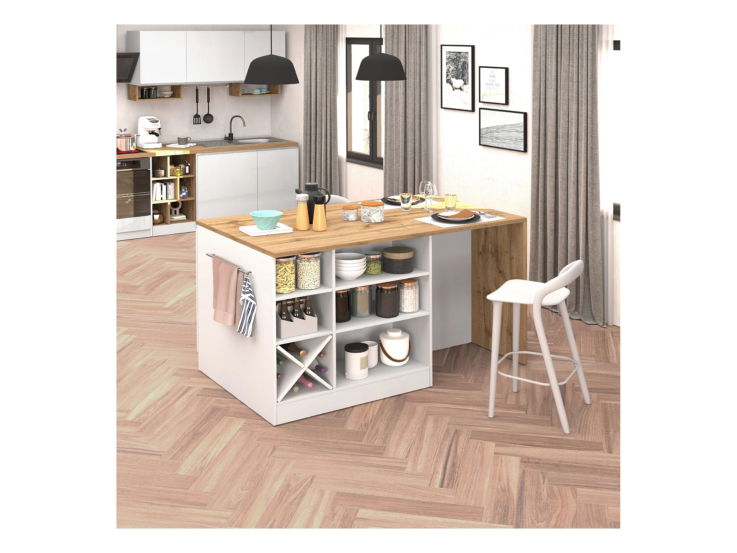 Isola cucina bianca - Isola cucina con ruote e gambe in legno - Piano di lavoro pieghevole - 2 cassetti 4 ante