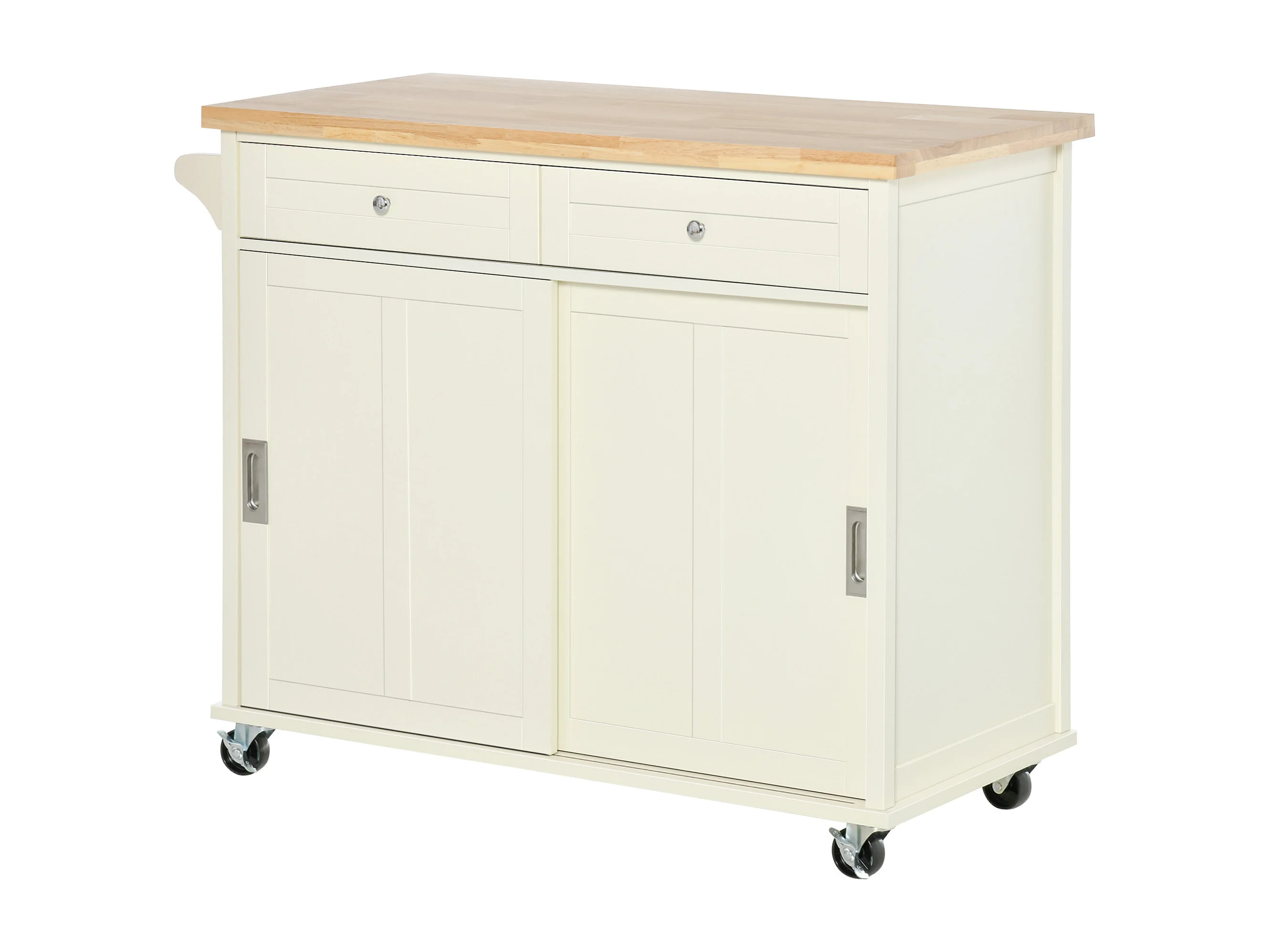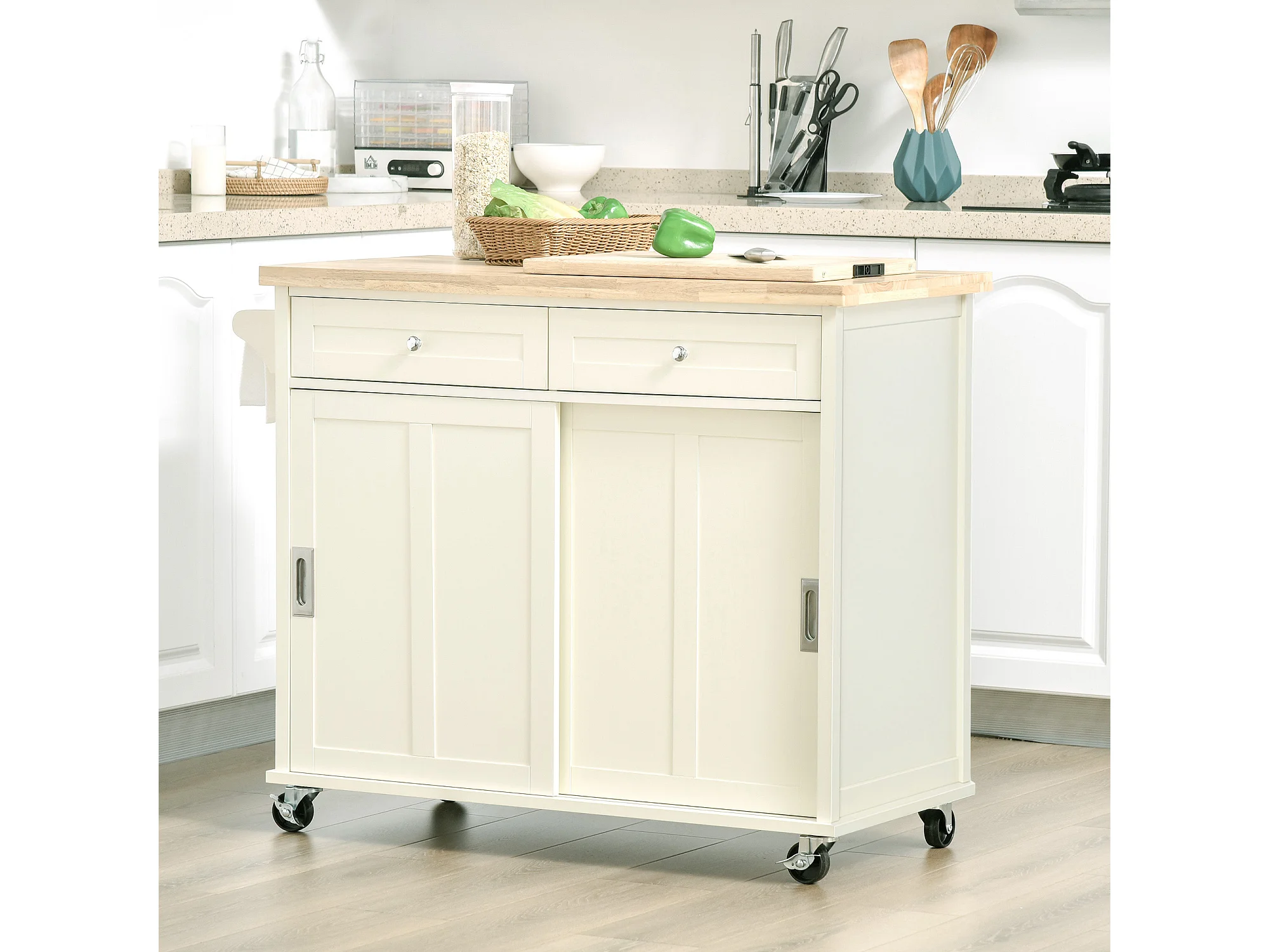 Isola cucina mobile - piano estendibile - 2 cassetti e 2 ante - con portasciugamani - MDF - bianco + naturale