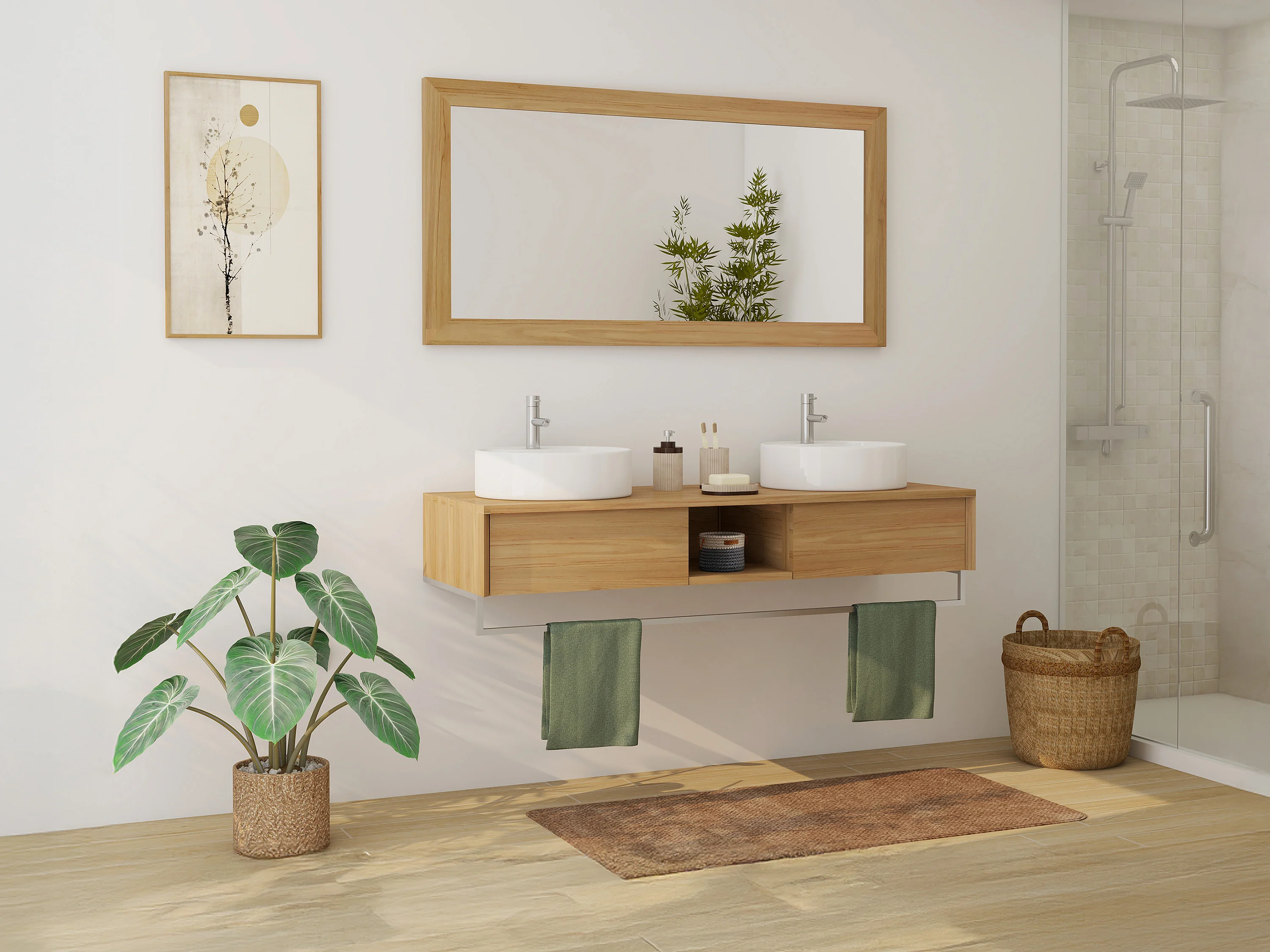 Mobile bagno sospeso in teak con portasciugamani e doppio lavabo da appoggio rotondo in ceramica 140 cm - KUPANG
