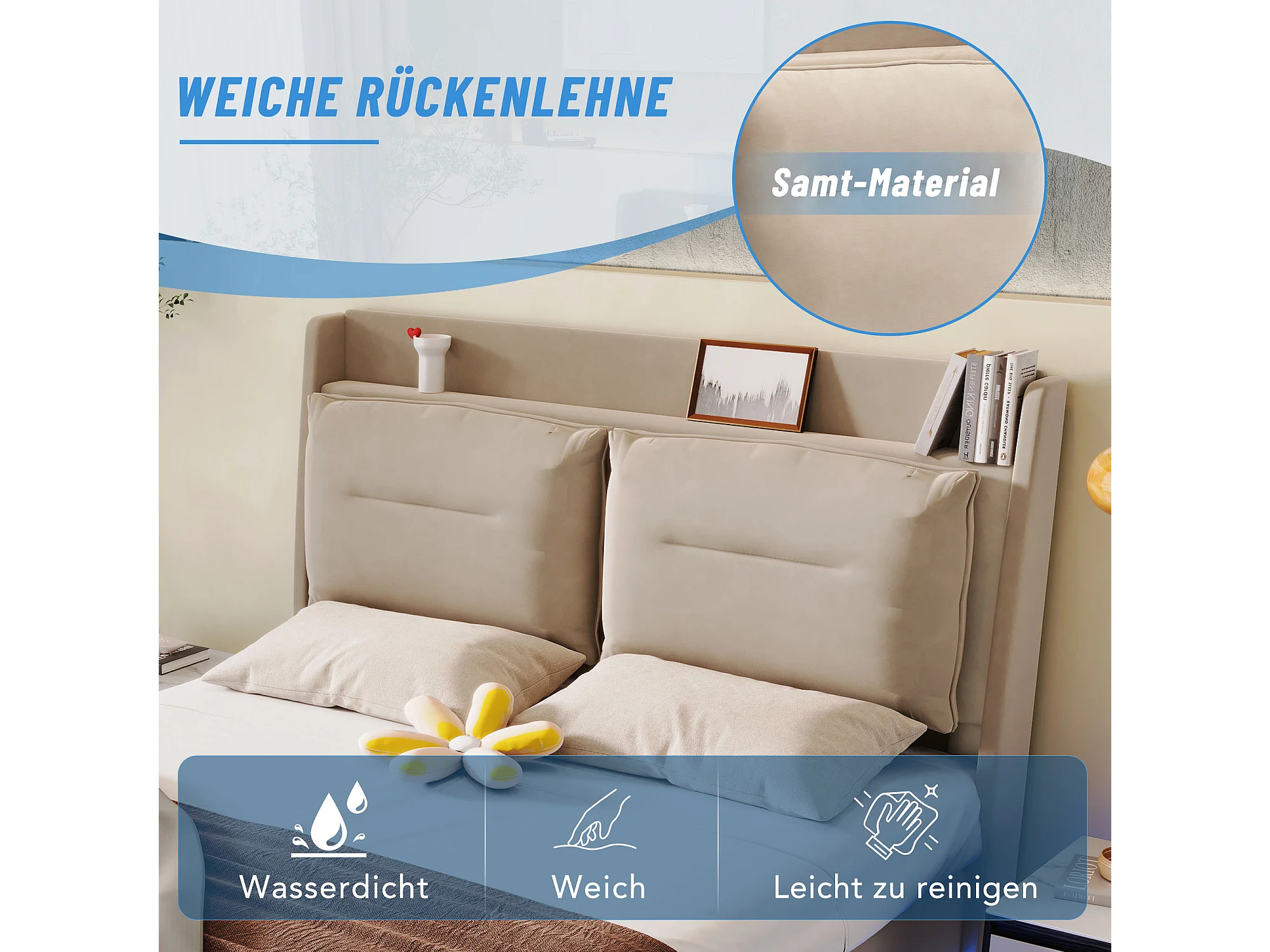 illuminato doppio 160x200 illuminato capitonné, ricarica USB, LED regolabile, velluto, beige
