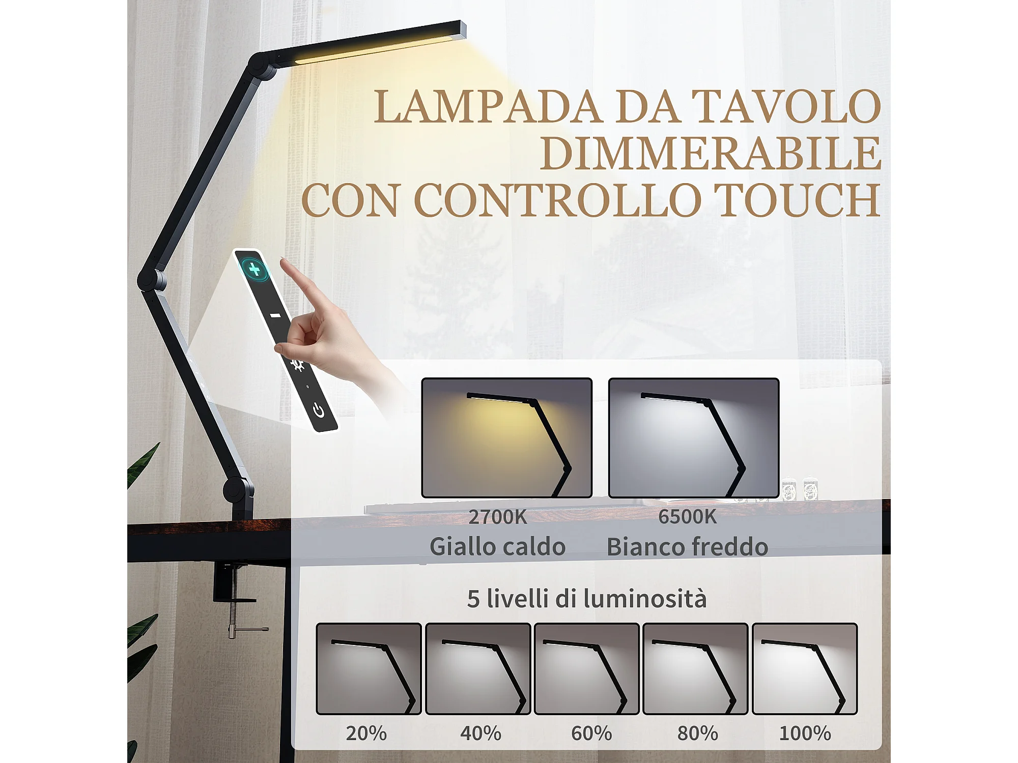 Lampada da scrivania dimmerabile con morsetto e braccio regolabile