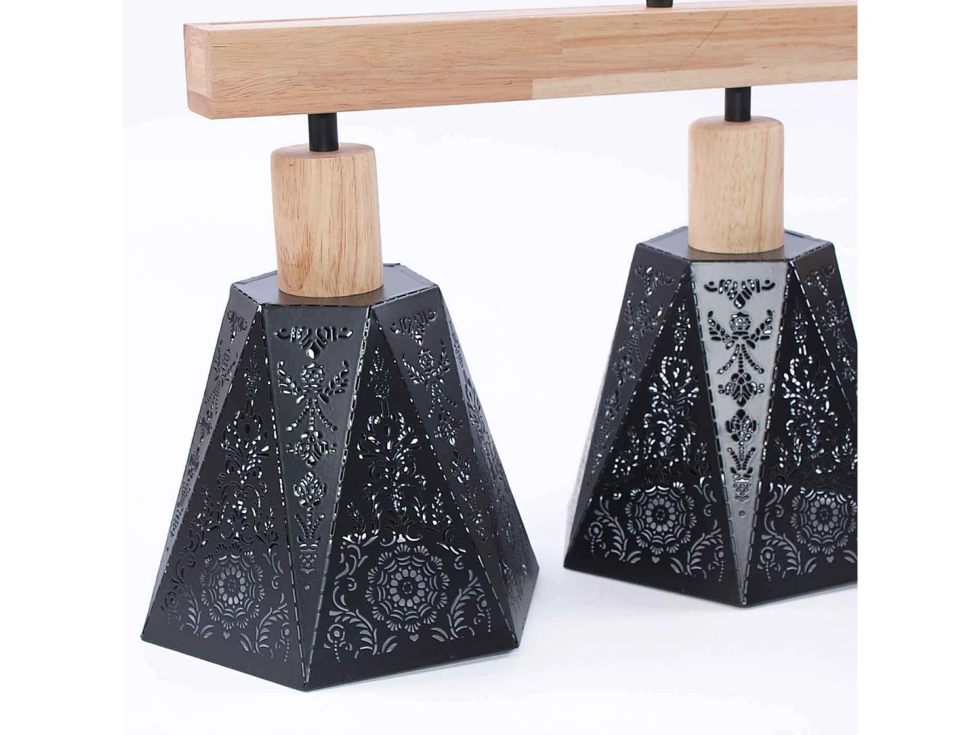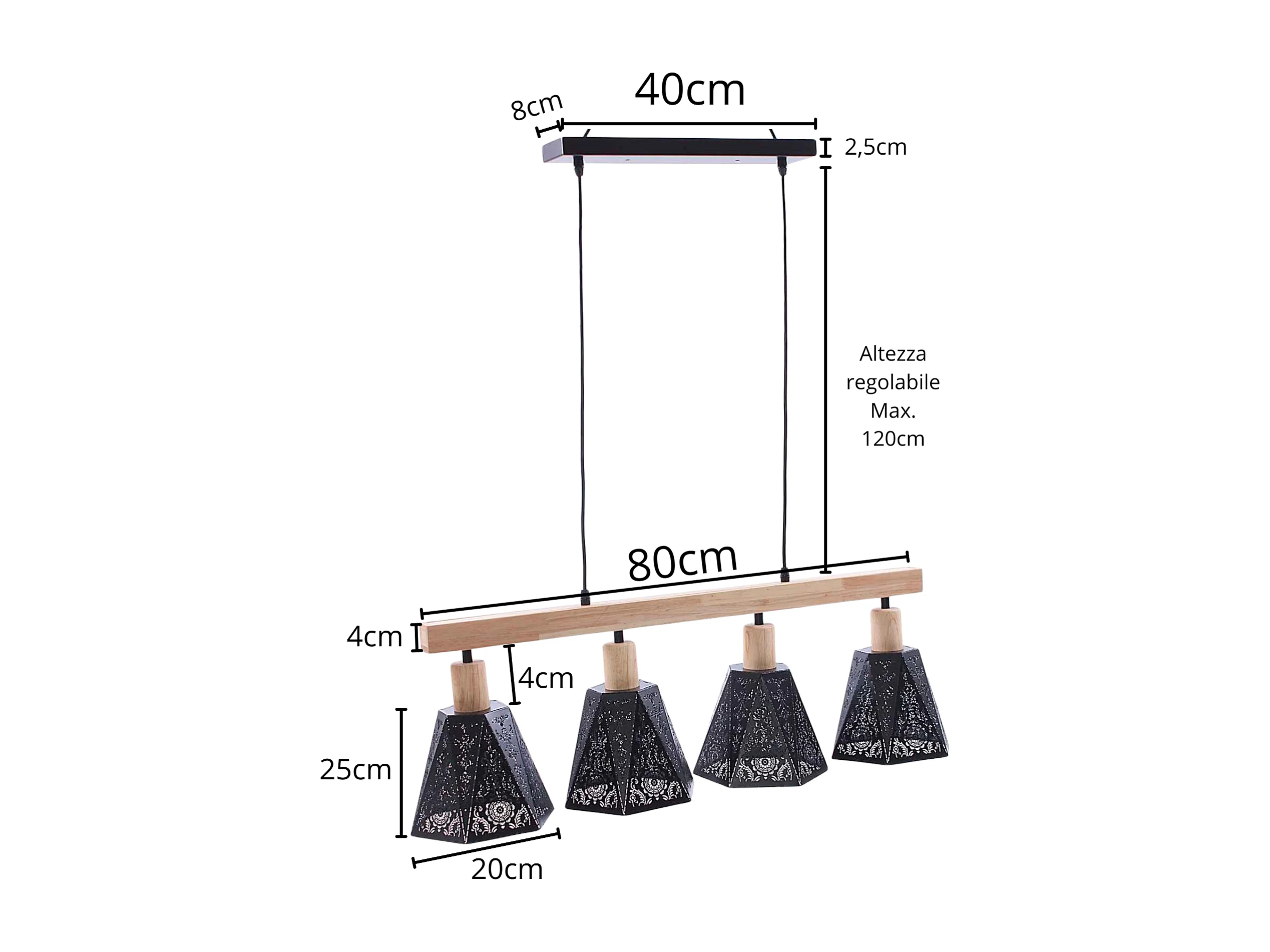 Lampadario in legno e metallo nero con 4 paralumi