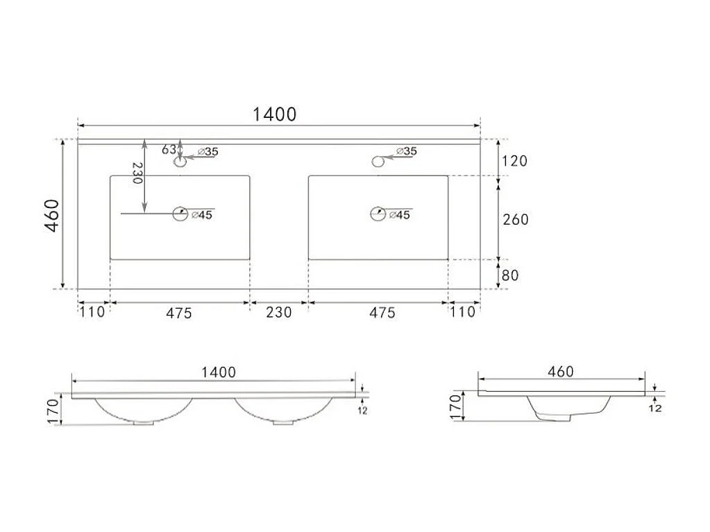 Lavabo da appoggio 385983 doppia vasca ceramica bianco lucido 140x46x17H