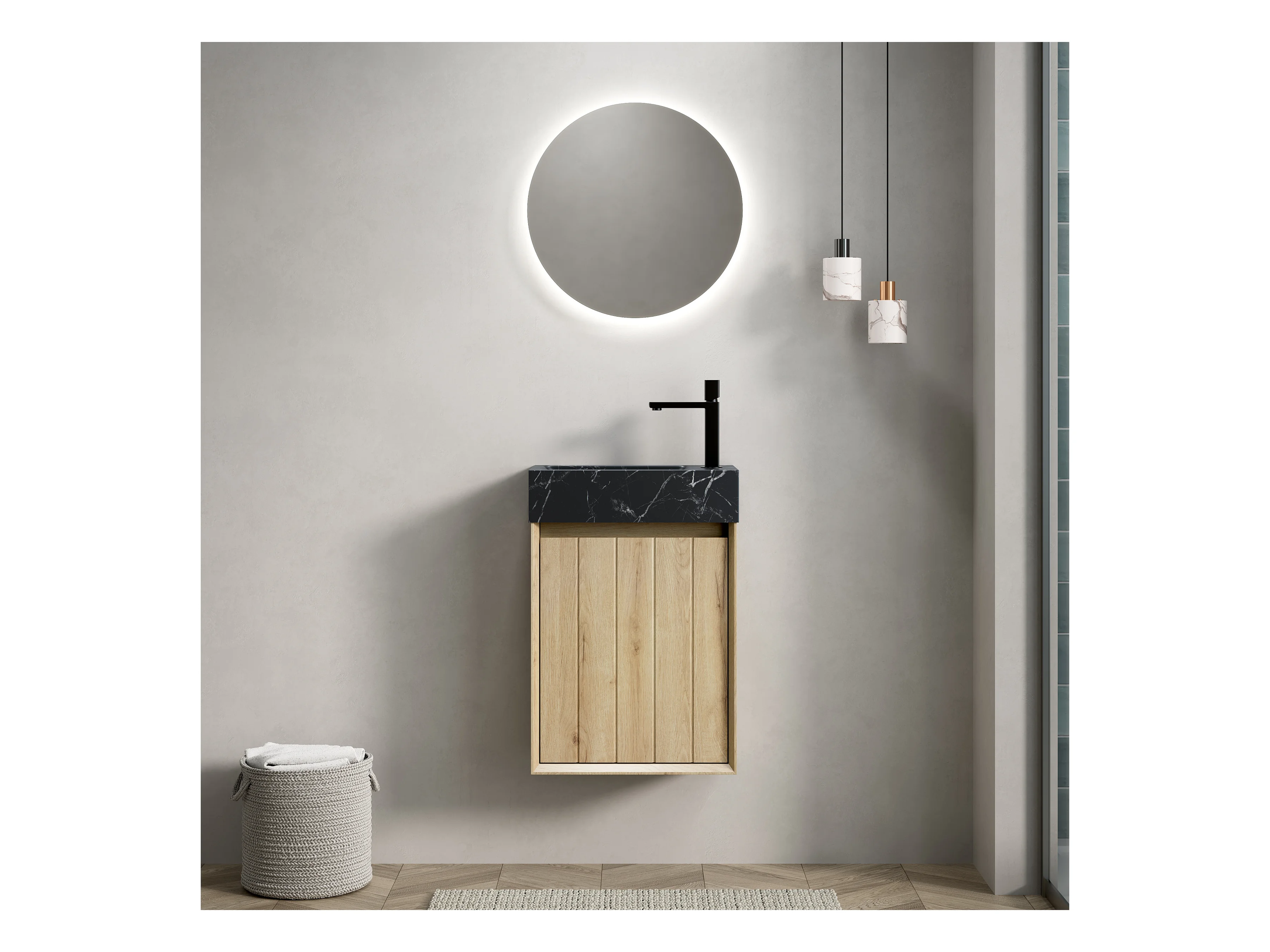 Lavabo integrato a parete in marmo nero, design moderno, con mobile lavabo in rovere bianco, 1 anta (40x22x58 cm)