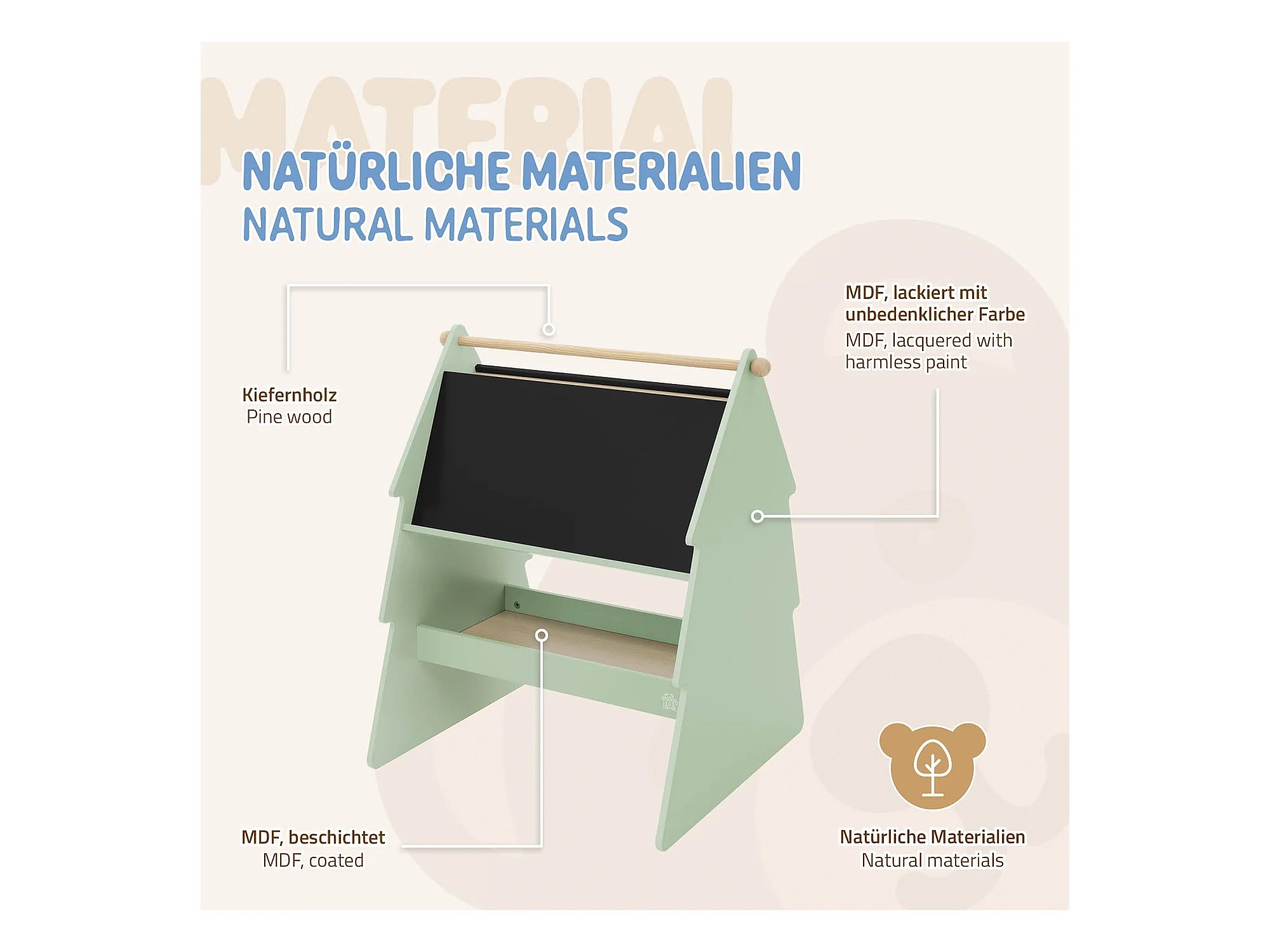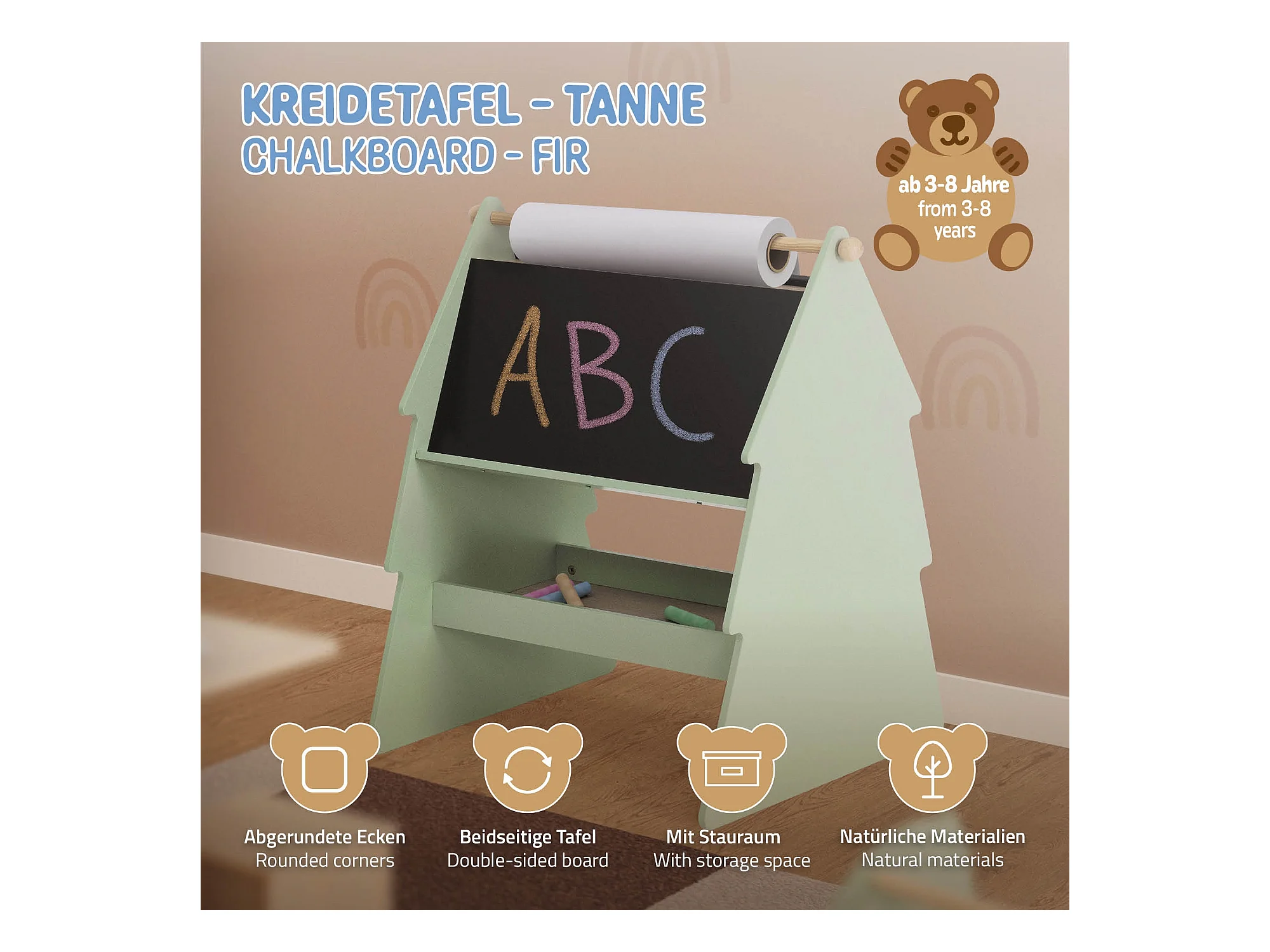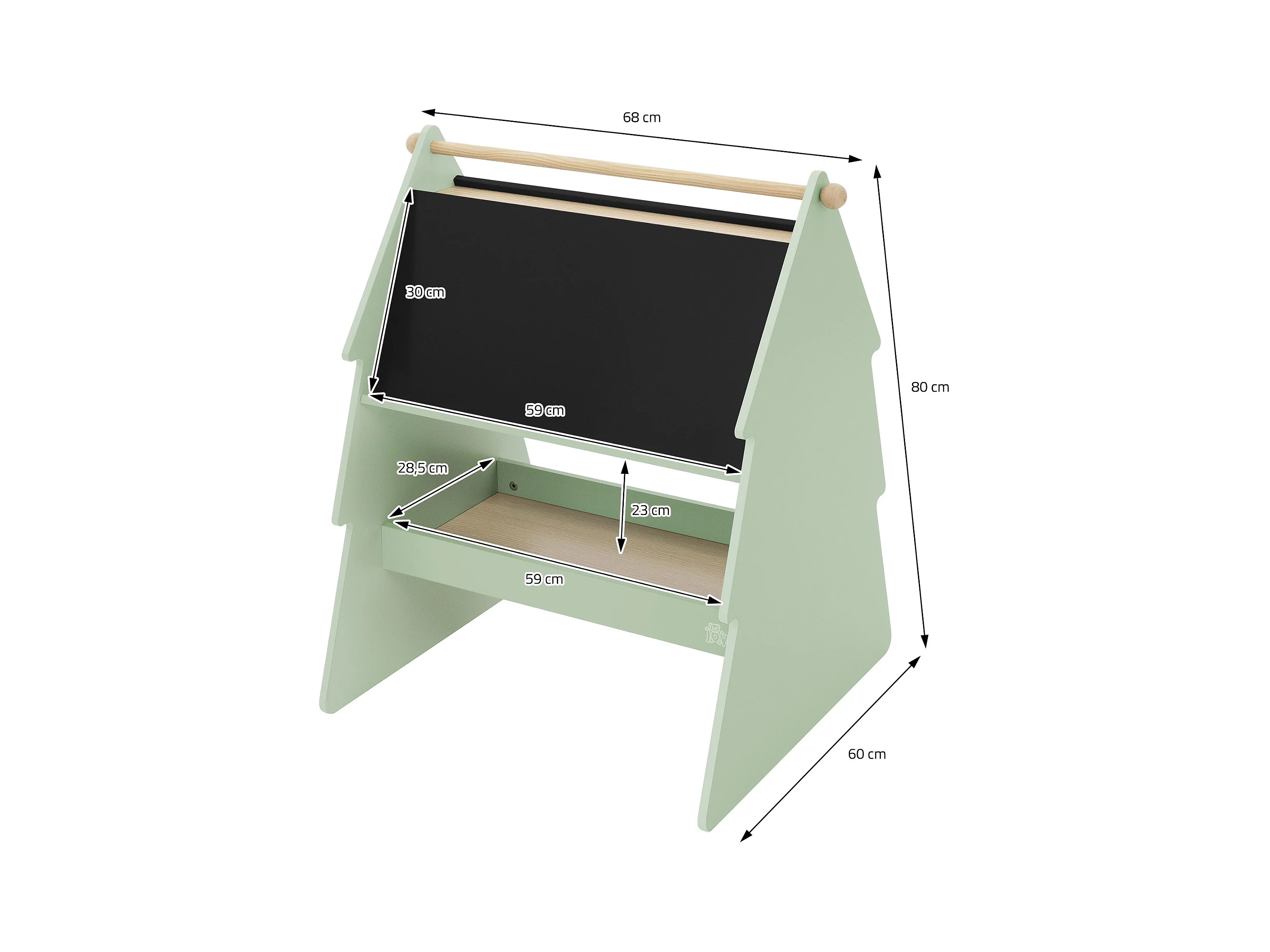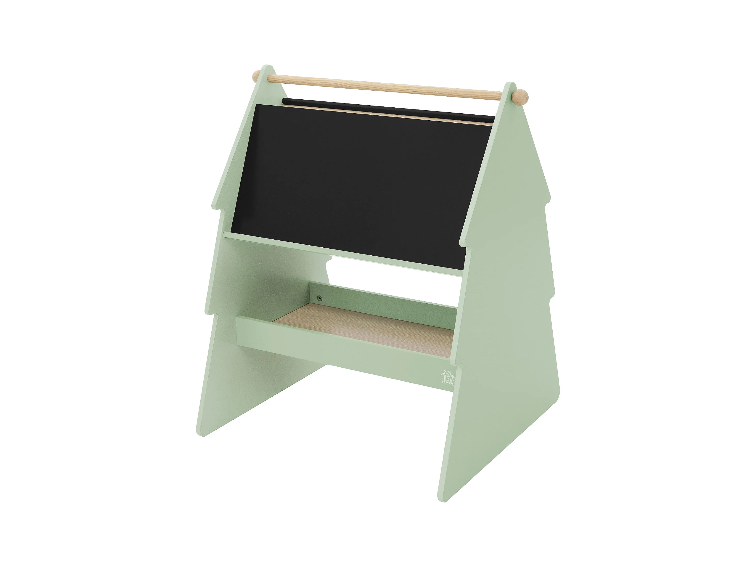 Lavagna bifacciale per bambini in legno verde con design ad abete portaoggetti