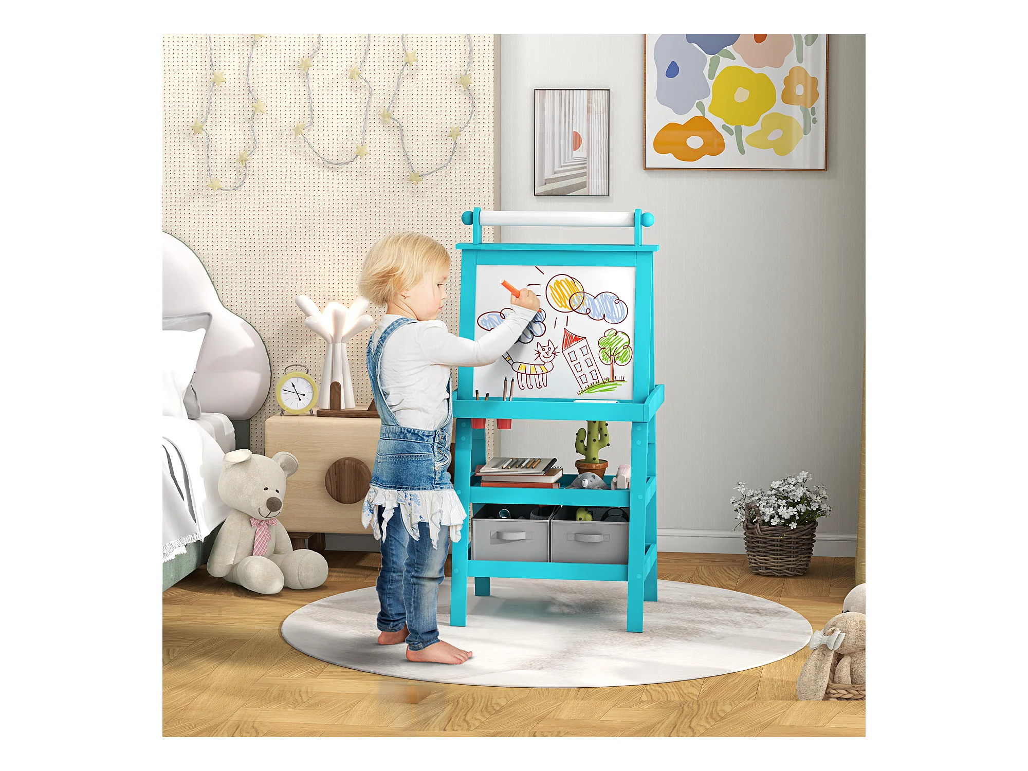 Lavagna per bambini con cavalletto in legno e rotolo di carta blu